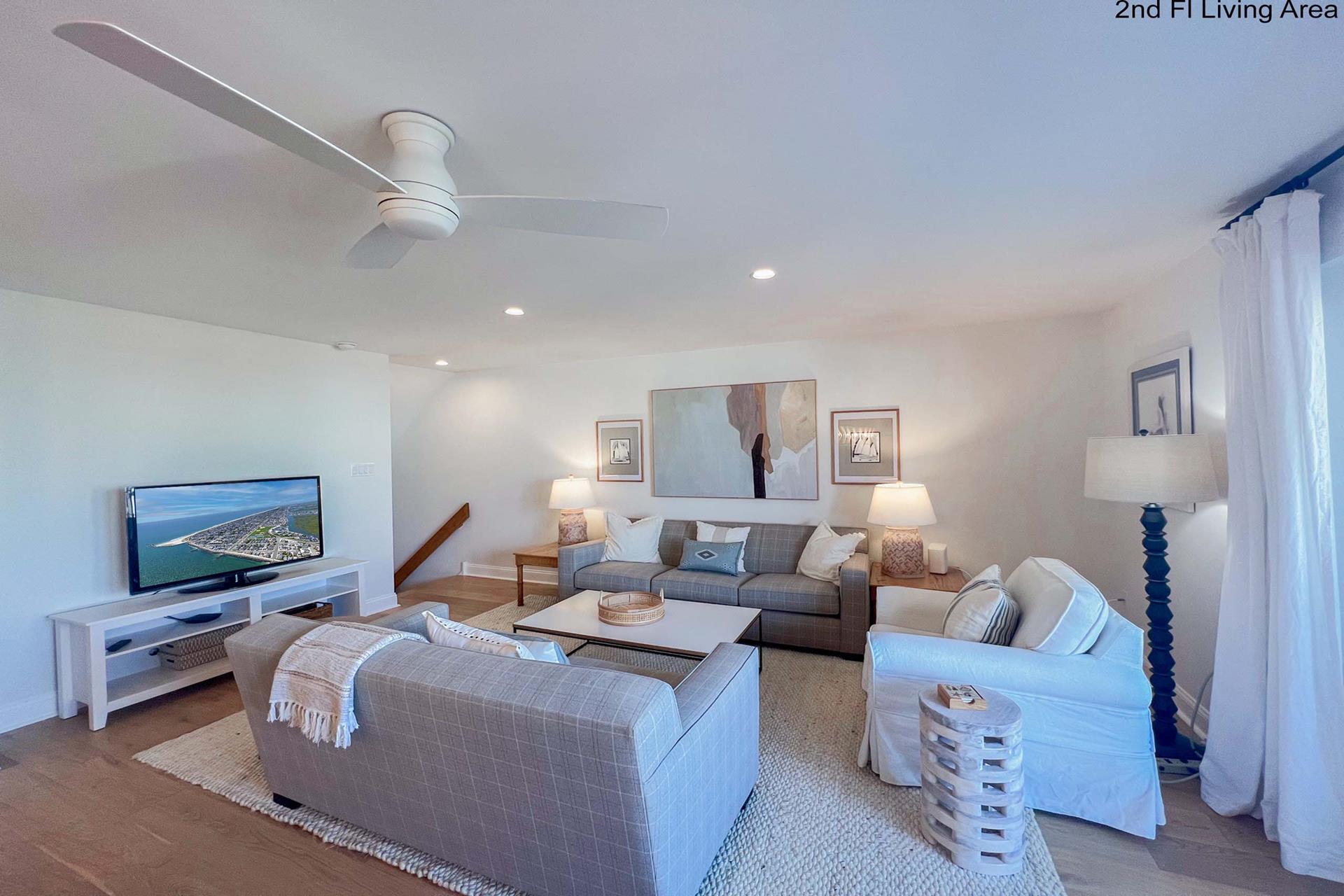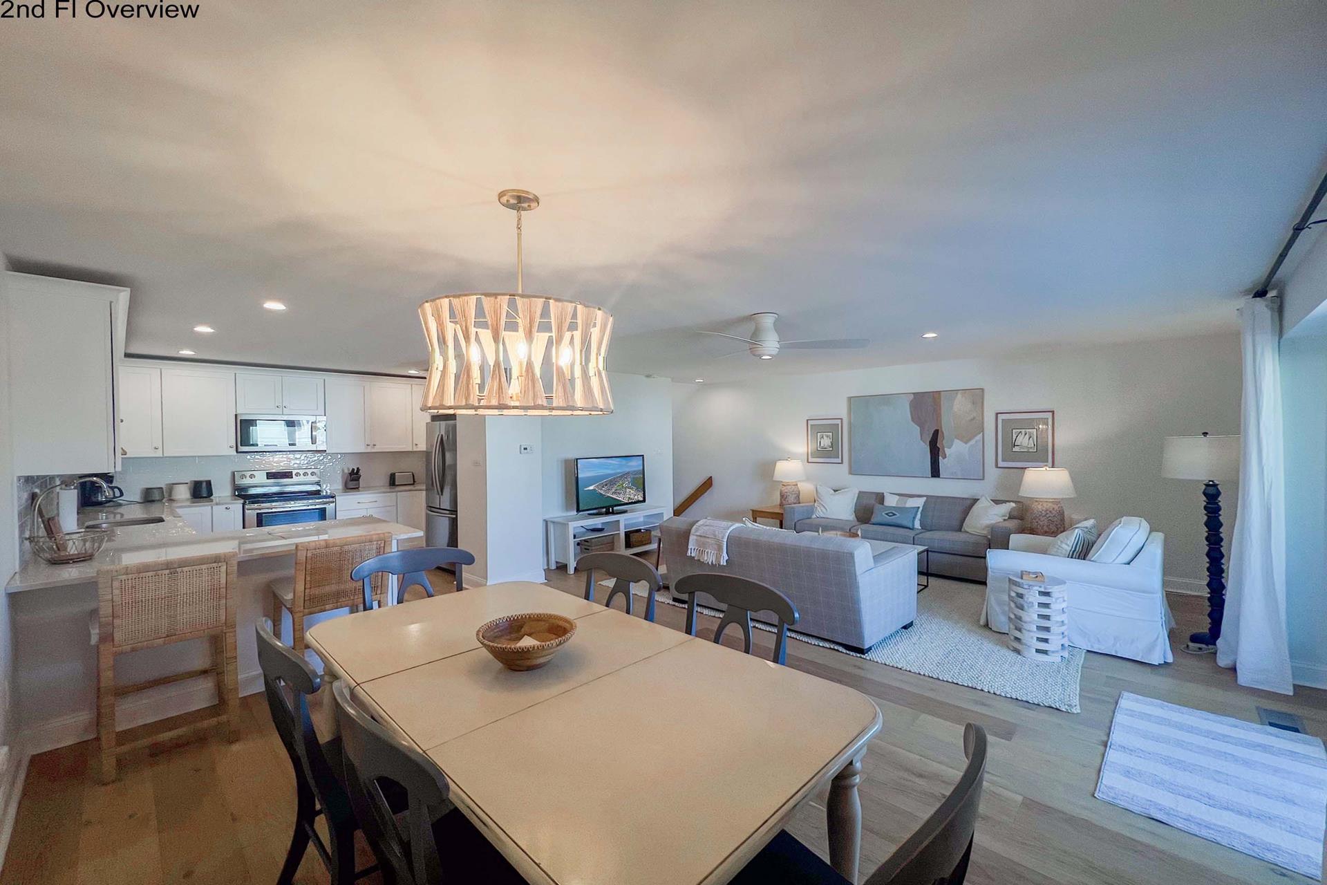 Great 2 level Townhouse with a bay view! The first floor has, large master bedroom with king bed having a master bath and two additional bedrooms (two twins in each) and a laundry room and hall bath. The den room has a daybed with a twin. The second floor has a huge living area with sliders to a deck overlooking the bayside and kitchen with white cabinetry and counter seating. The Owners provide an electric grill, coffee maker, blender, 2 slice toaster and one television (living room). Come and enjoy this great unit!