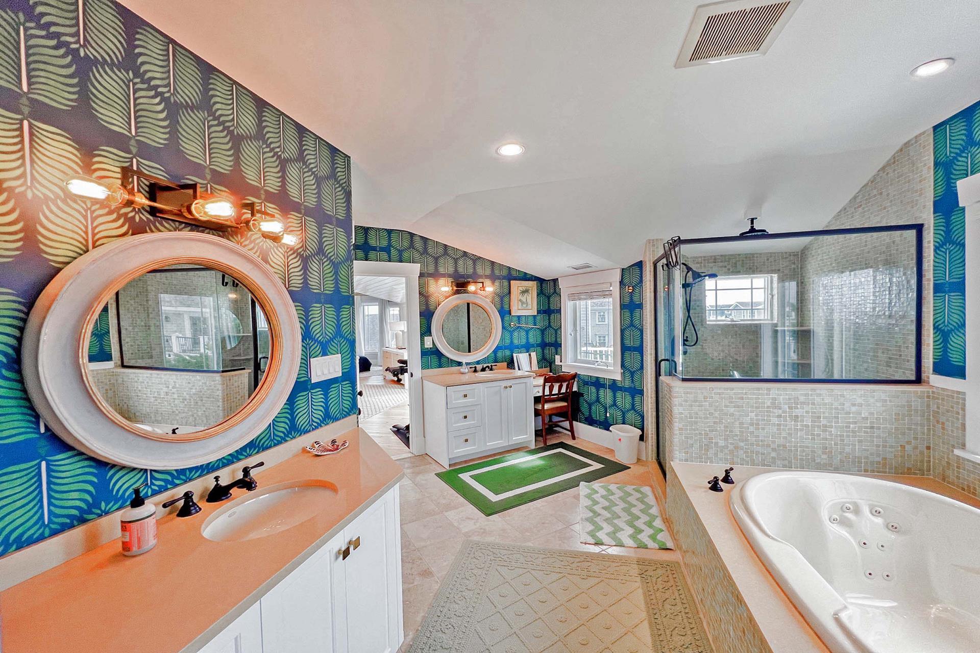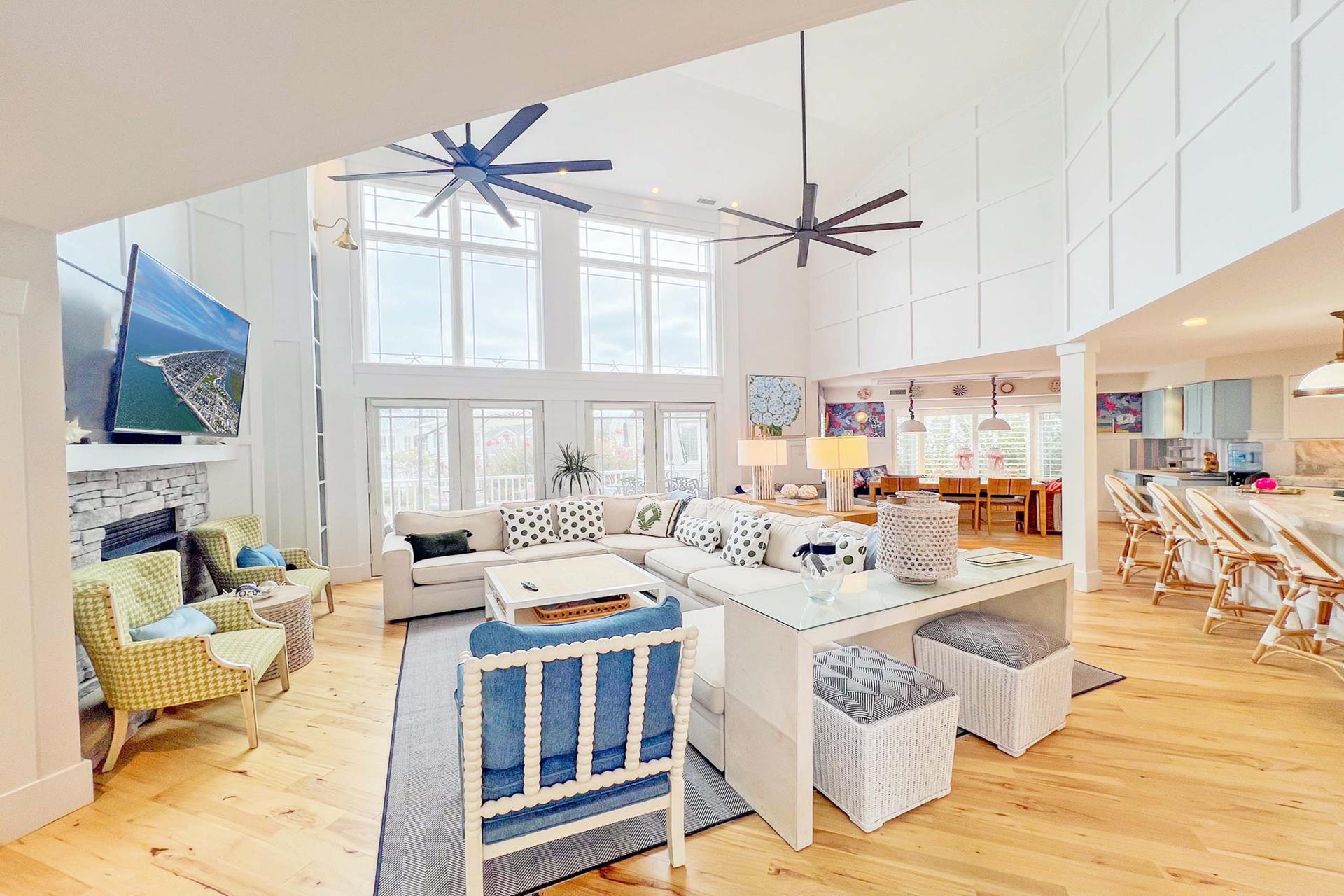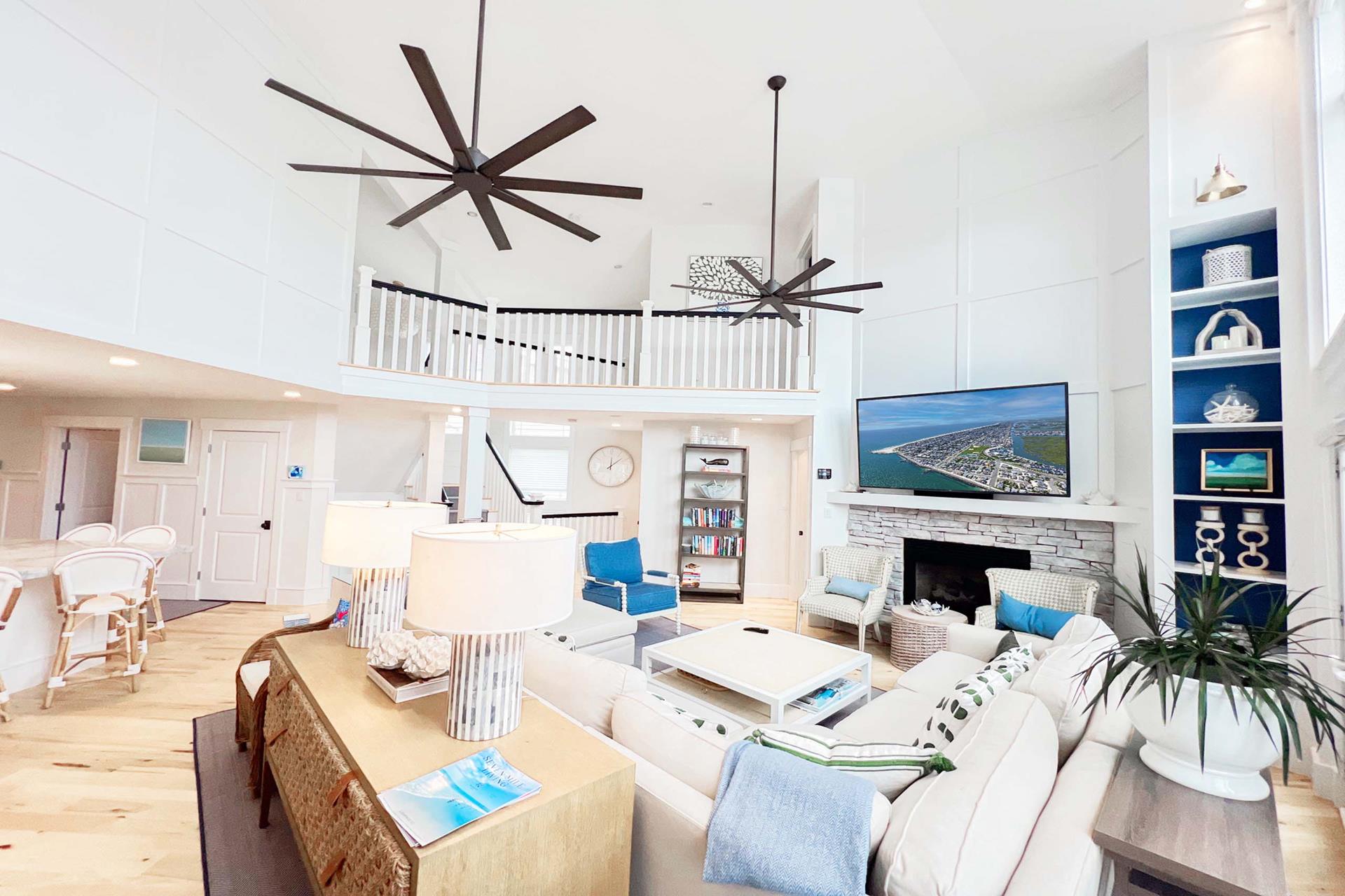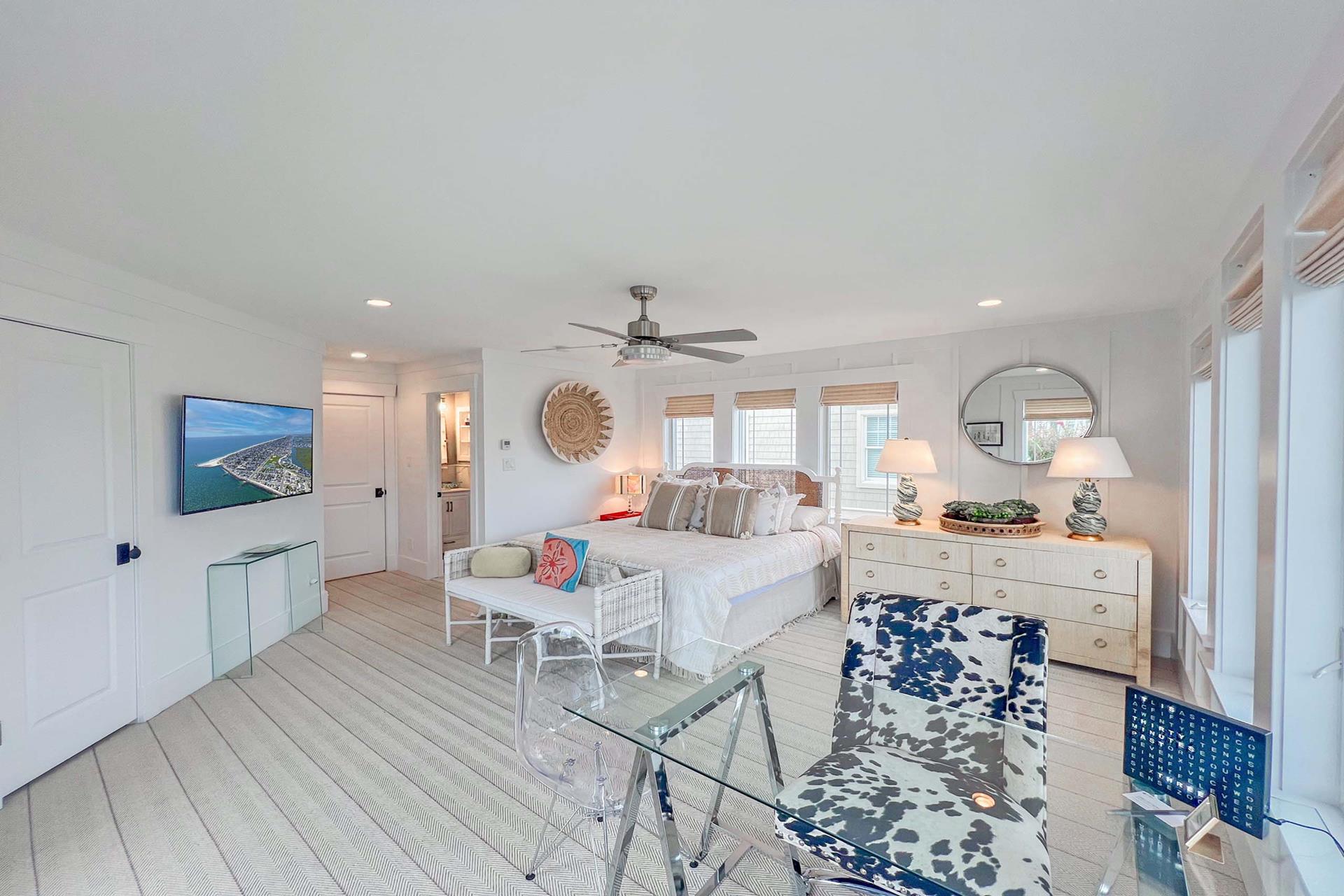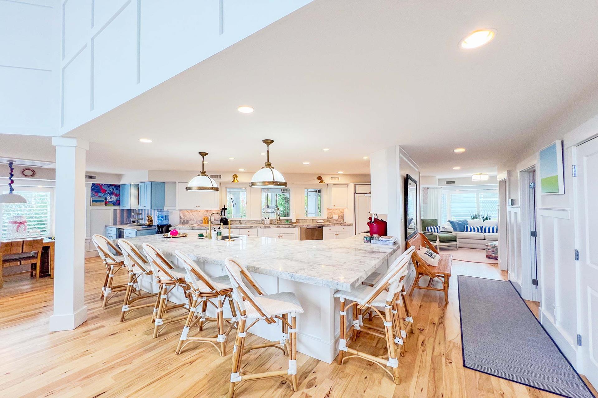 Sensational three story, beach block upside down home with ocean views. Second floor great room area features vaulted ceilings in the living area with ample sunlight and flat screen television, custom gourmet kitchen with stainless steel appliances comfortable dining area. The second floor hosts an office space/6th bedroom with king bed. The first floor has bedroom with a queen bed, a bedroom with bunk bed (twin over double) and a bedroom with another queen The third floor has master bedroom with king bed and twin day bed and second bedroom with king bed. Retreat to the rear yard with large inground swimming pool to relax and enjoy. Elevator available ($1,500 elevator security deposit) with access at the garage level. House has 6 bedrooms in total. 3 on the 1st floor, 1 on the 2nd behind the living room and 2 upstairs (master suite upstairs). All bathrooms have walk in showers with the en-suite bathrooms except one on the first floor has a tub and shower.!
