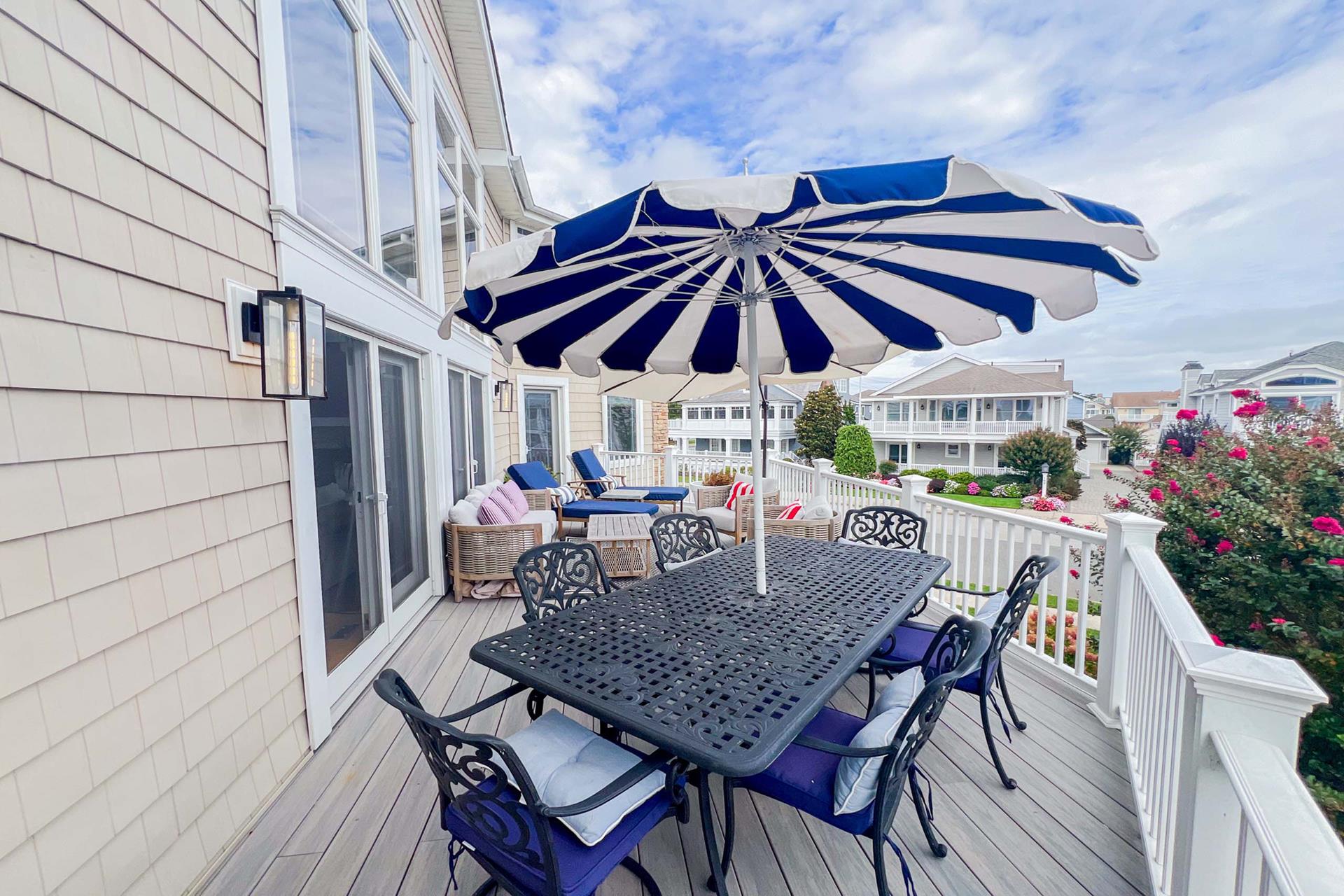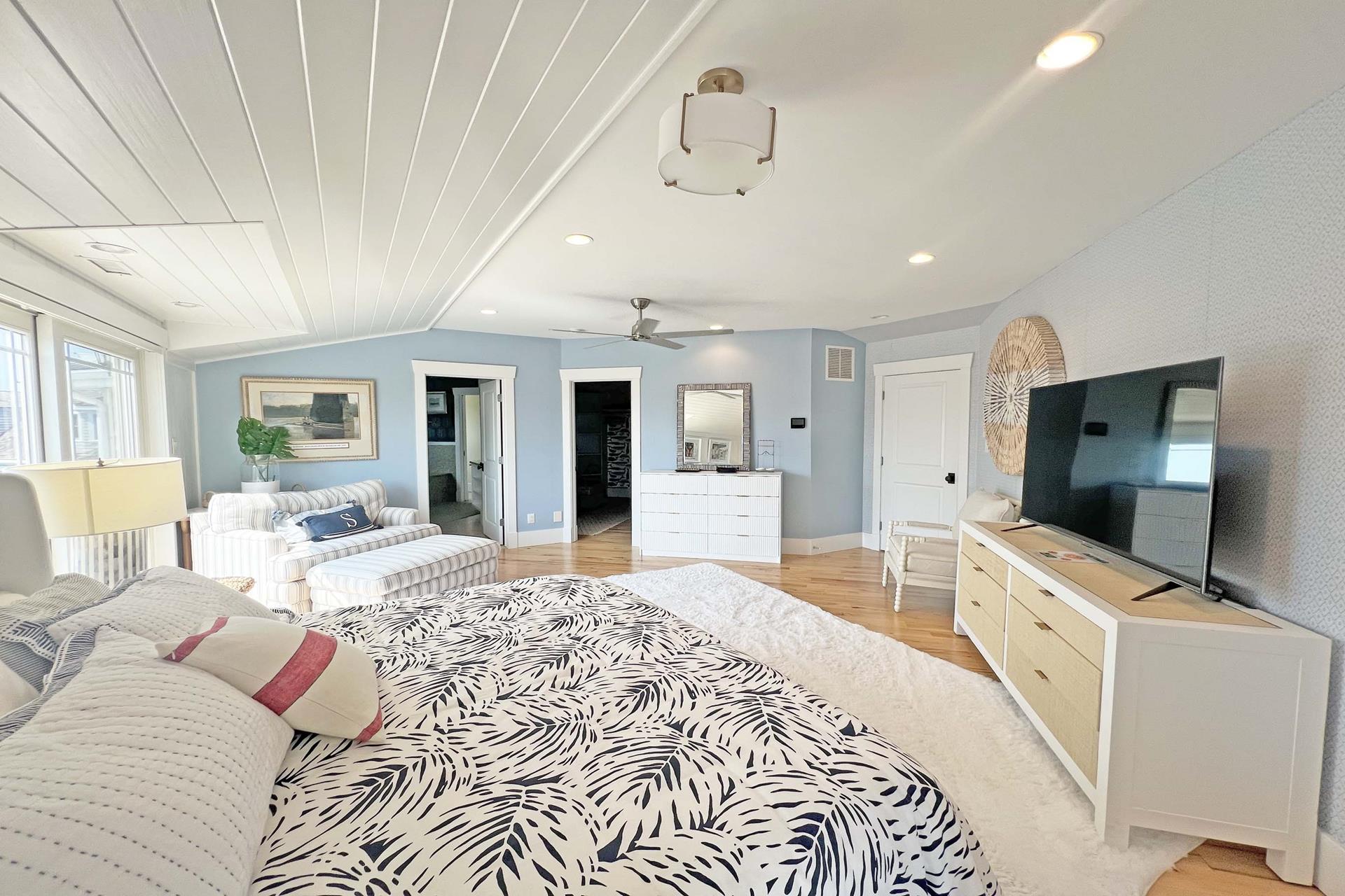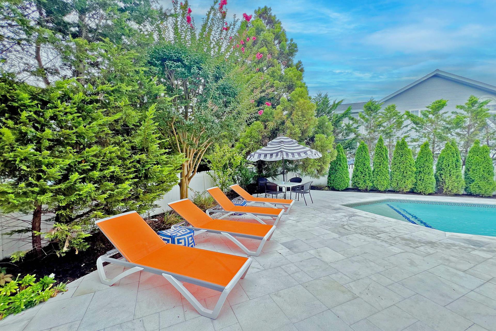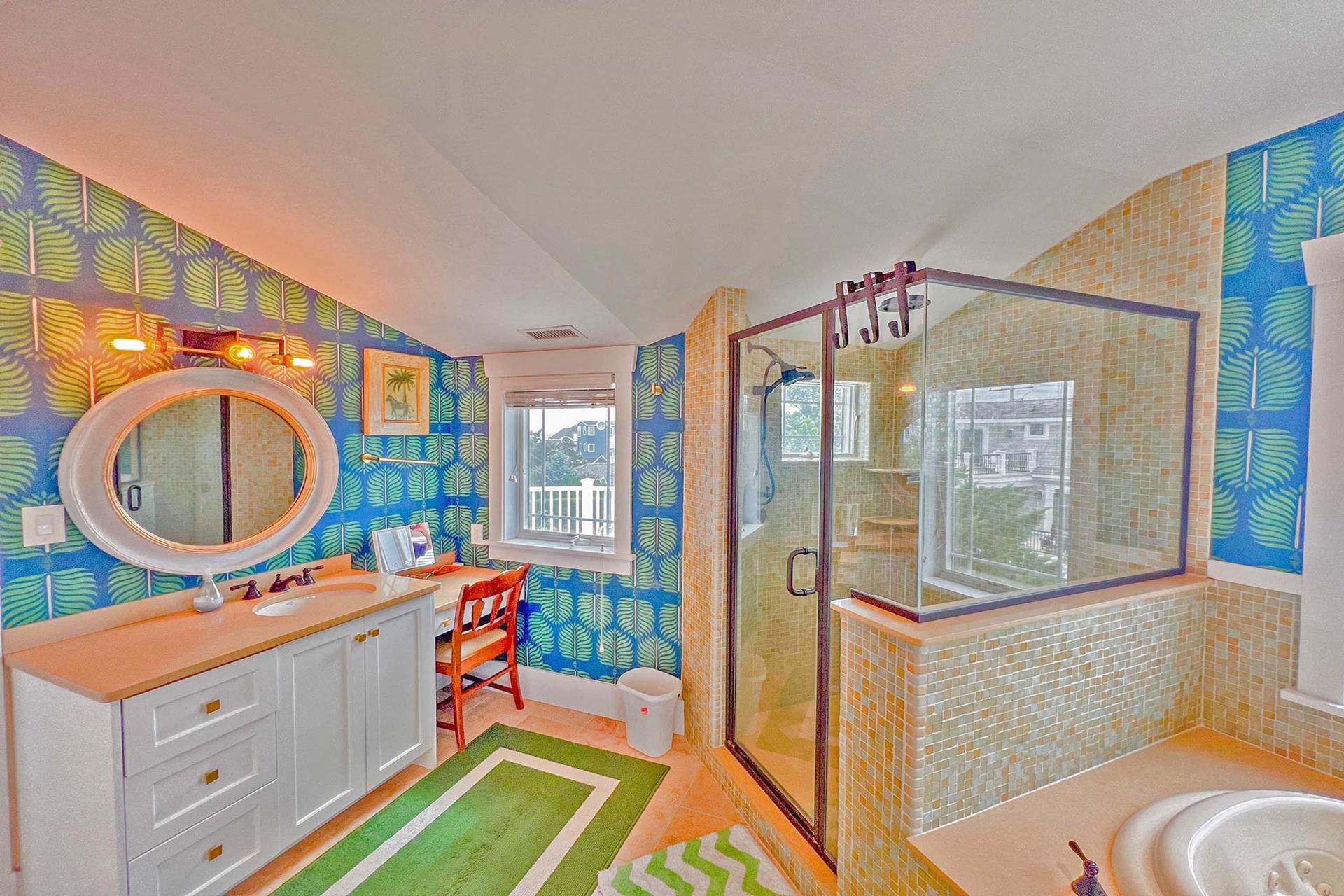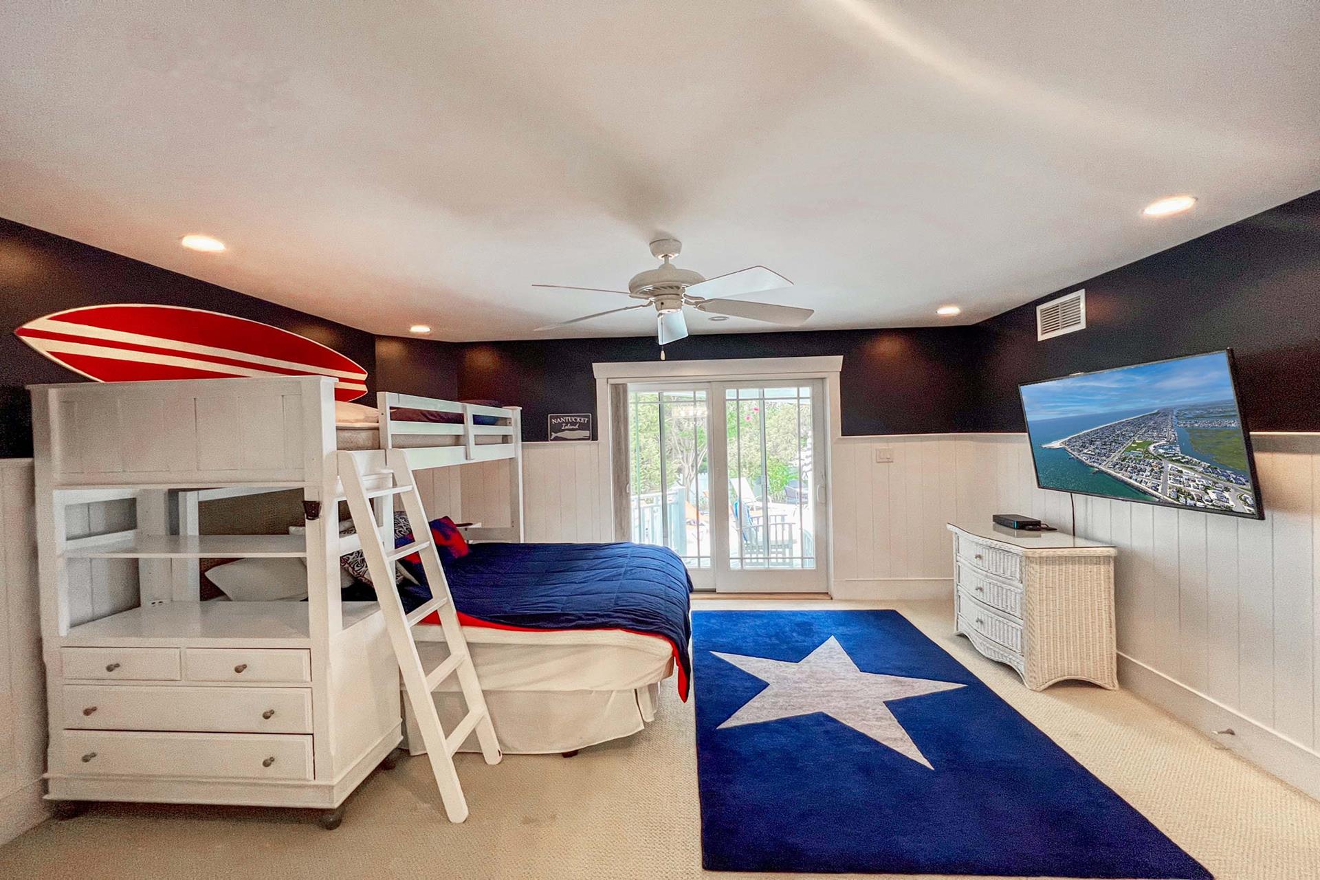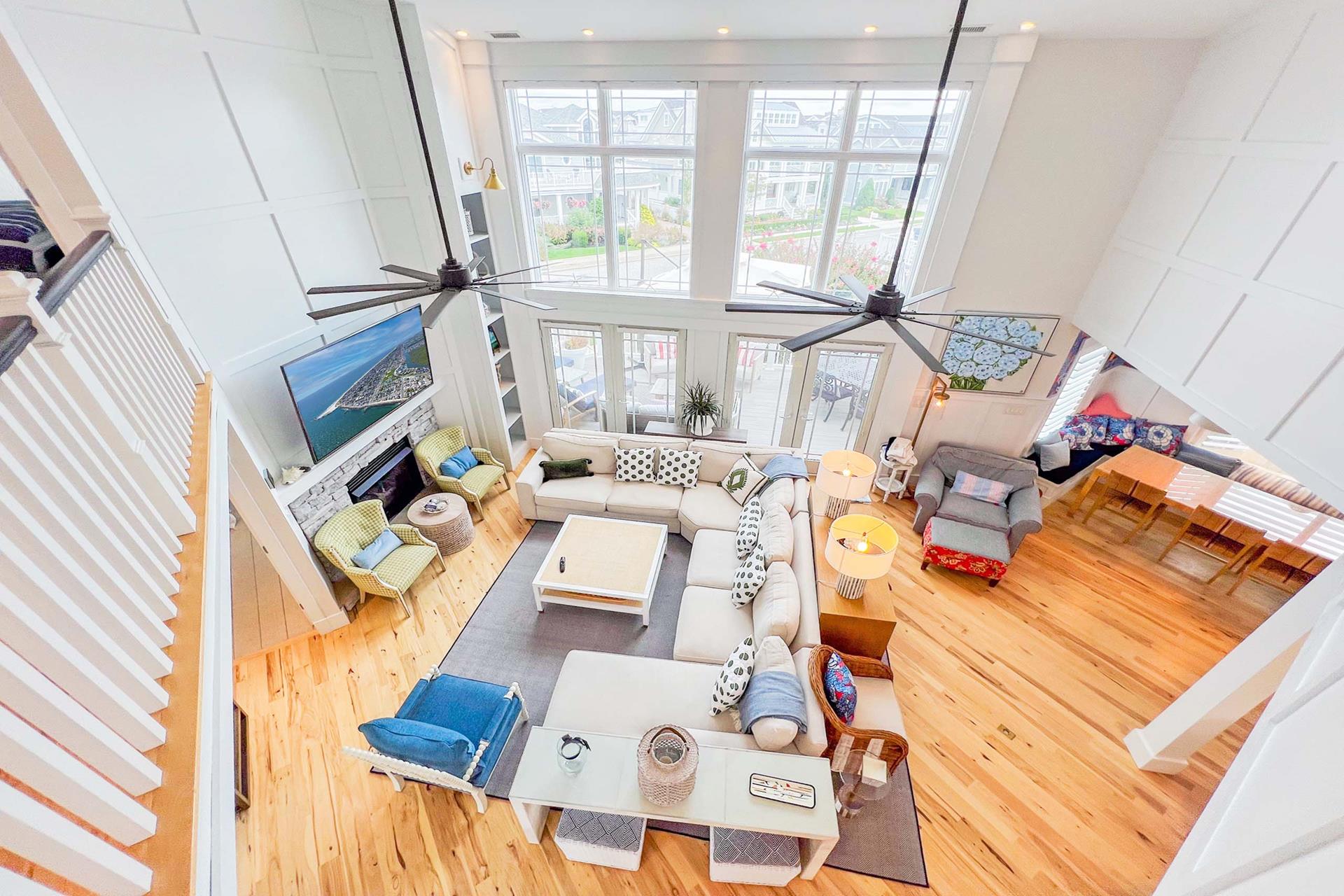 Sensational three story, beach block upside down home with ocean views. Second floor great room area features vaulted ceilings in the living area with ample sunlight and flat screen television, custom gourmet kitchen with stainless steel appliances comfortable dining area. The second floor hosts an office space/6th bedroom with king bed. The first floor has bedroom with a queen bed, a bedroom with bunk bed (twin over double) and a bedroom with another queen The third floor has master bedroom with king bed and twin day bed and second bedroom with king bed. Retreat to the rear yard with large inground swimming pool to relax and enjoy. Elevator available ($1,500 elevator security deposit) with access at the garage level. House has 6 bedrooms in total. 3 on the 1st floor, 1 on the 2nd behind the living room and 2 upstairs (master suite upstairs). All bathrooms have walk in showers with the en-suite bathrooms except one on the first floor has a tub and shower.!