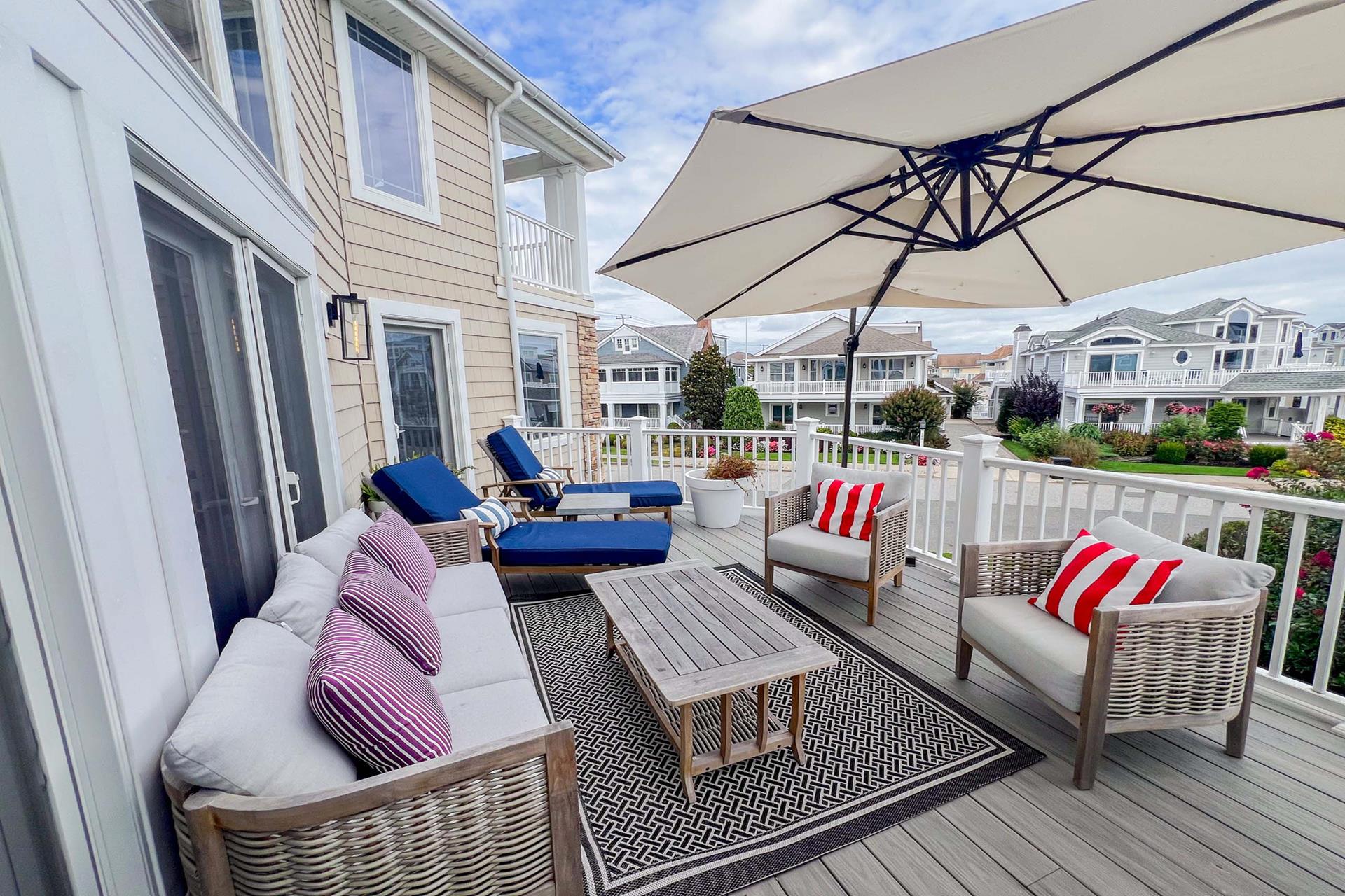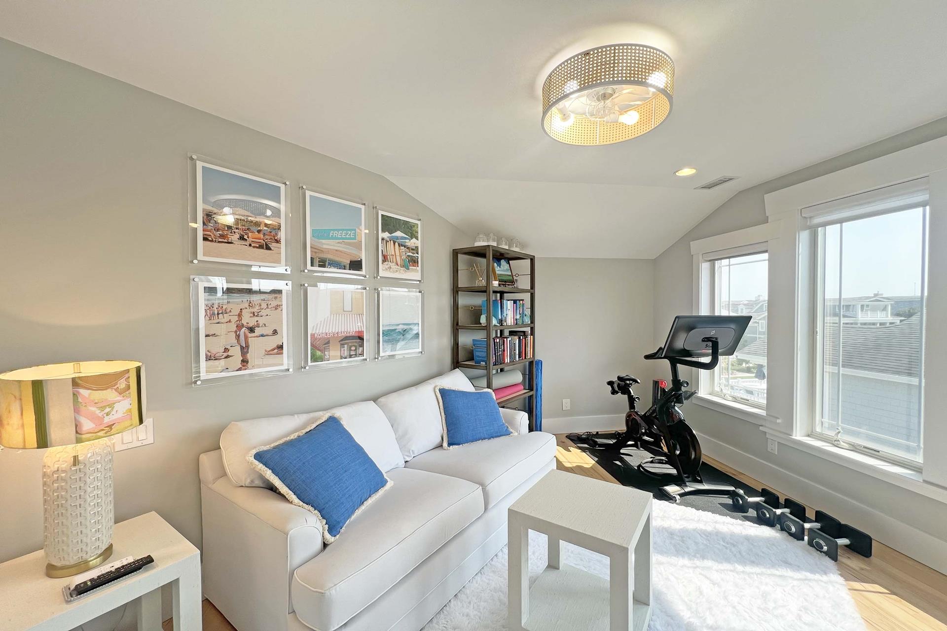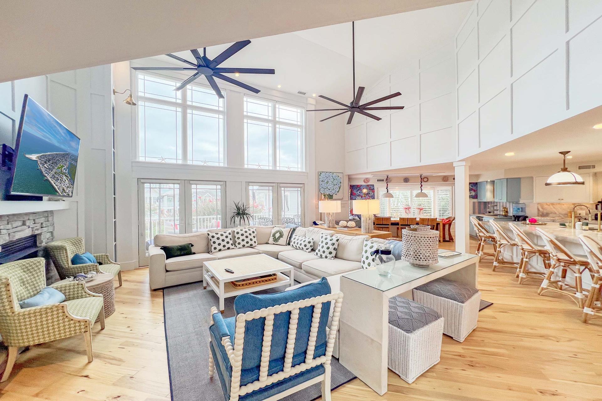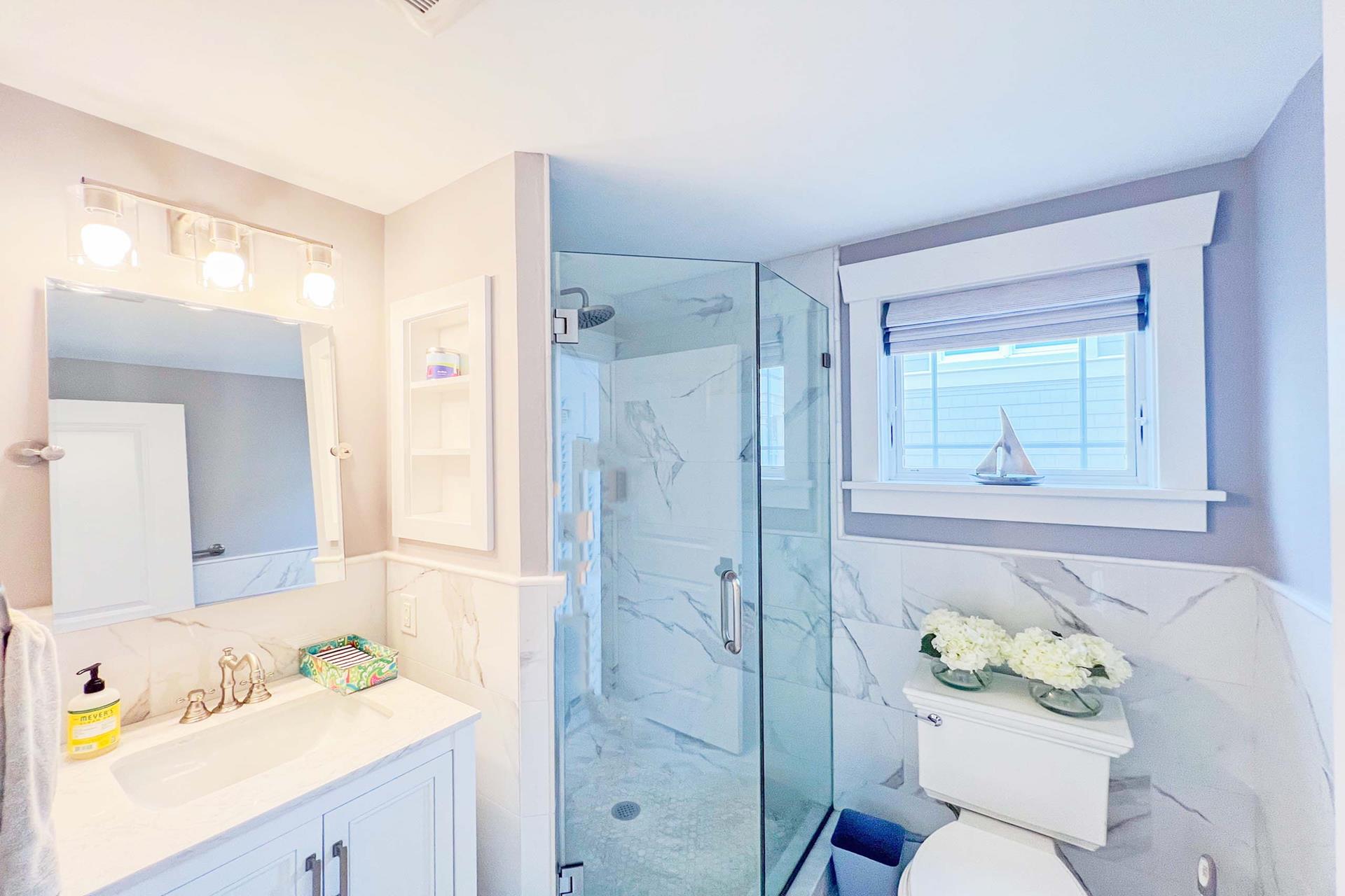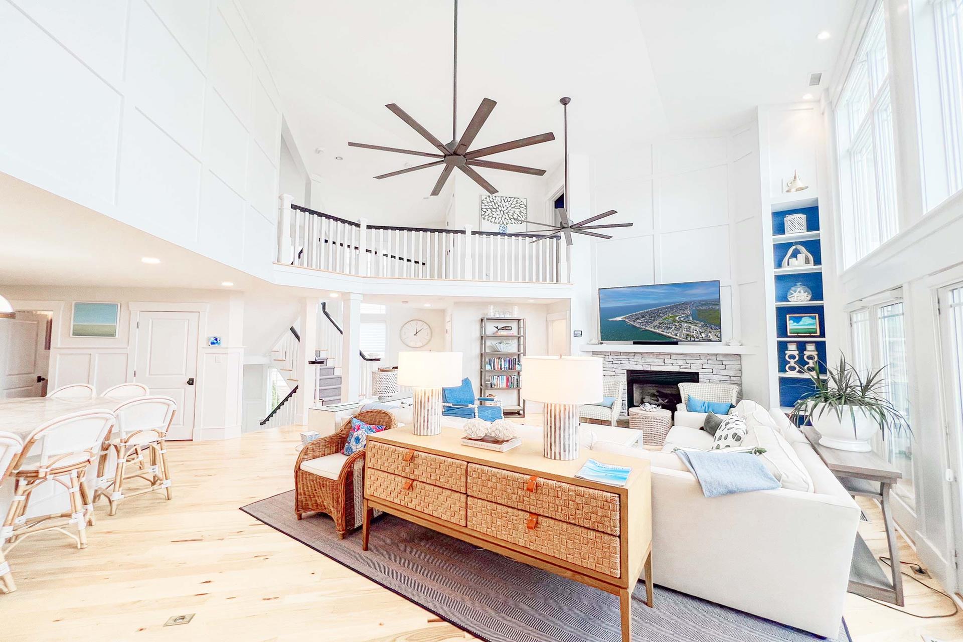 Sensational three story, beach block upside down home with ocean views. Second floor great room area features vaulted ceilings in the living area with ample sunlight and flat screen television, custom gourmet kitchen with stainless steel appliances comfortable dining area. The second floor hosts an office space/6th bedroom with king bed. The first floor has bedroom with a queen bed, a bedroom with bunk bed (twin over double) and a bedroom with another queen The third floor has master bedroom with king bed and twin day bed and second bedroom with king bed. Retreat to the rear yard with large inground swimming pool to relax and enjoy. Elevator available ($1,500 elevator security deposit) with access at the garage level. House has 6 bedrooms in total. 3 on the 1st floor, 1 on the 2nd behind the living room and 2 upstairs (master suite upstairs). All bathrooms have walk in showers with the en-suite bathrooms except one on the first floor has a tub and shower.!