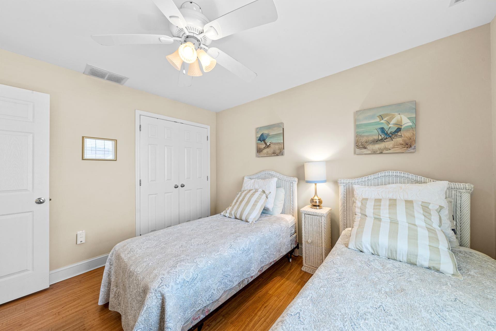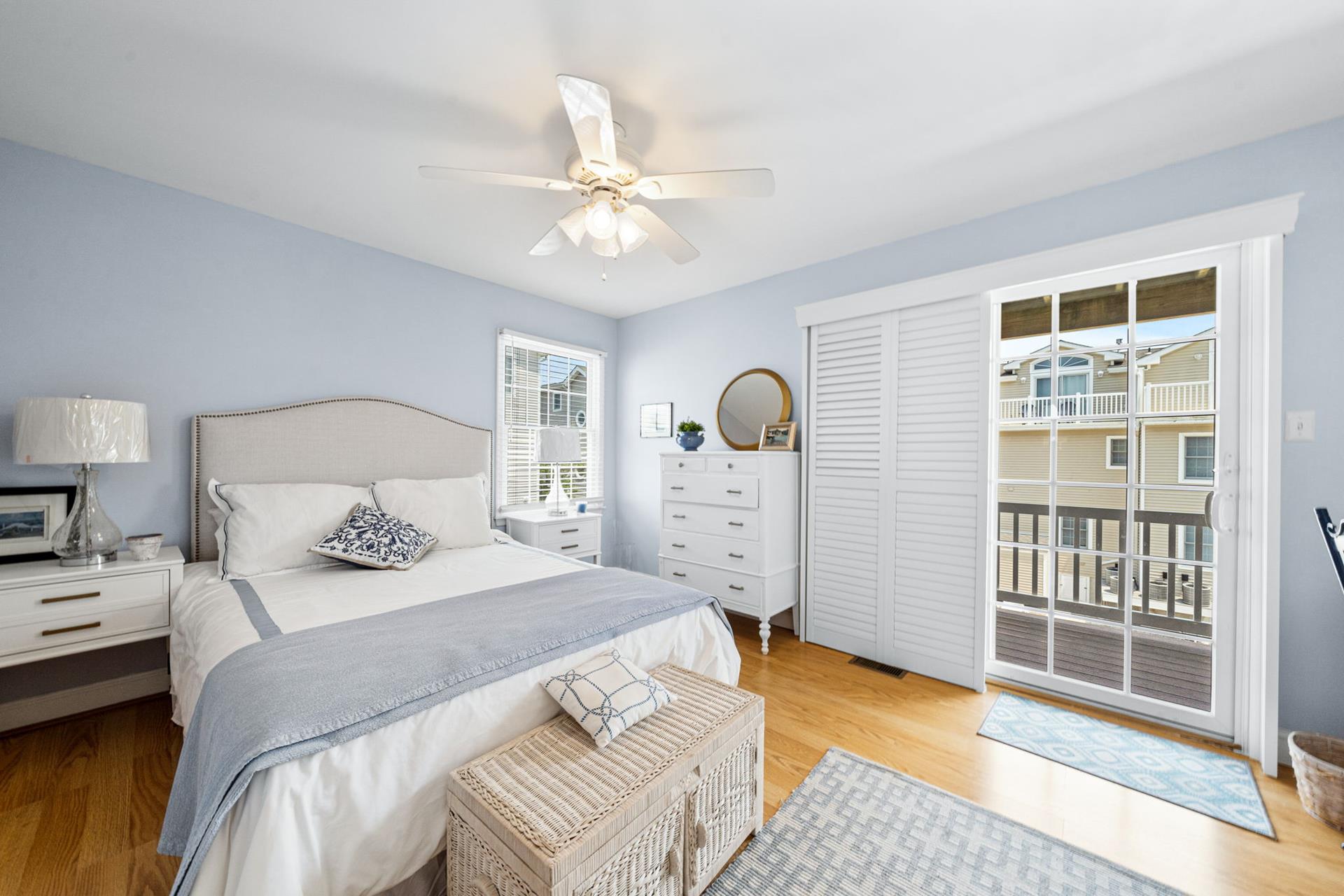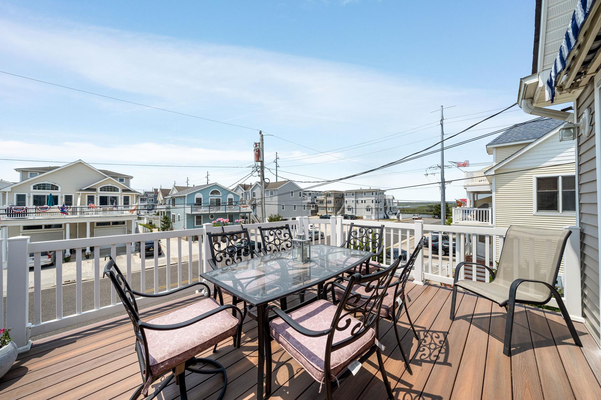 Beautiful Sunsets are yours when you rent this 5 bedroom 3 bath townhome. Comfortable and cozy the first floor offers one bedroom with a trundle, hall bath and a rear bedroom with a king and sliders to a private deck. The second floor opens up to a beautiful great room with cathedral ceiling, gas fireplace, spacious dining and lounging area. Plantations shutters cover the sliders leading to the front deck where you will enjoy an evening barbecue as you sip your cocktails and watch the sun set. Also on this floor you will find a hall bath and a rear bedroom with a queen bed and a private deck. The third floor completes this winning package with a set of twins in the front bedroom, hall bath and a rear bedroom with a king and a private deck. Enjoy the outside shower, off street parking, and central location. Call today and reserve your perfect seashore rental. This property does not have traditional cable and uses streaming services.
