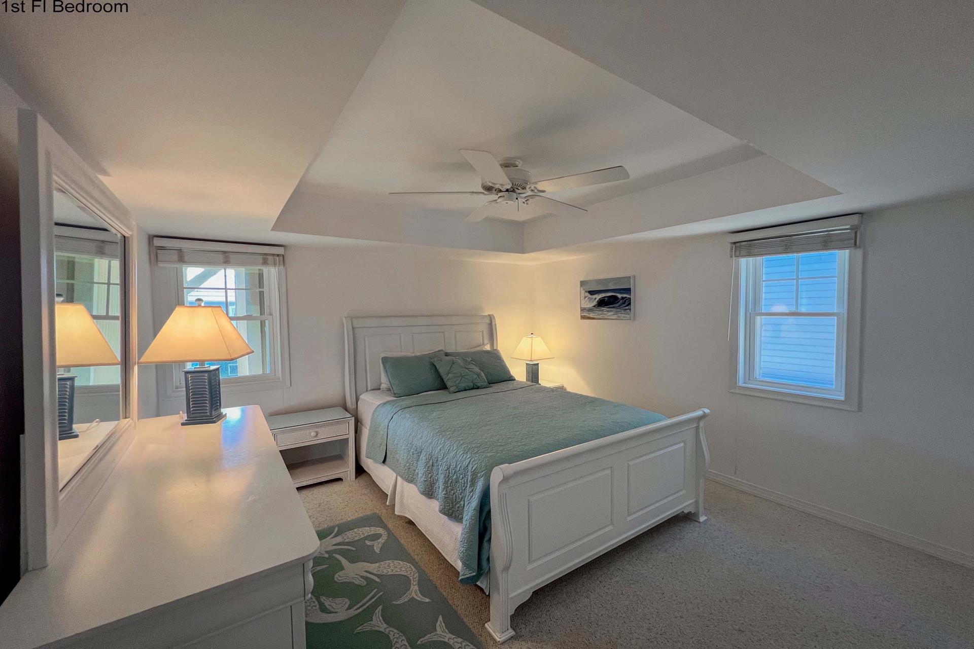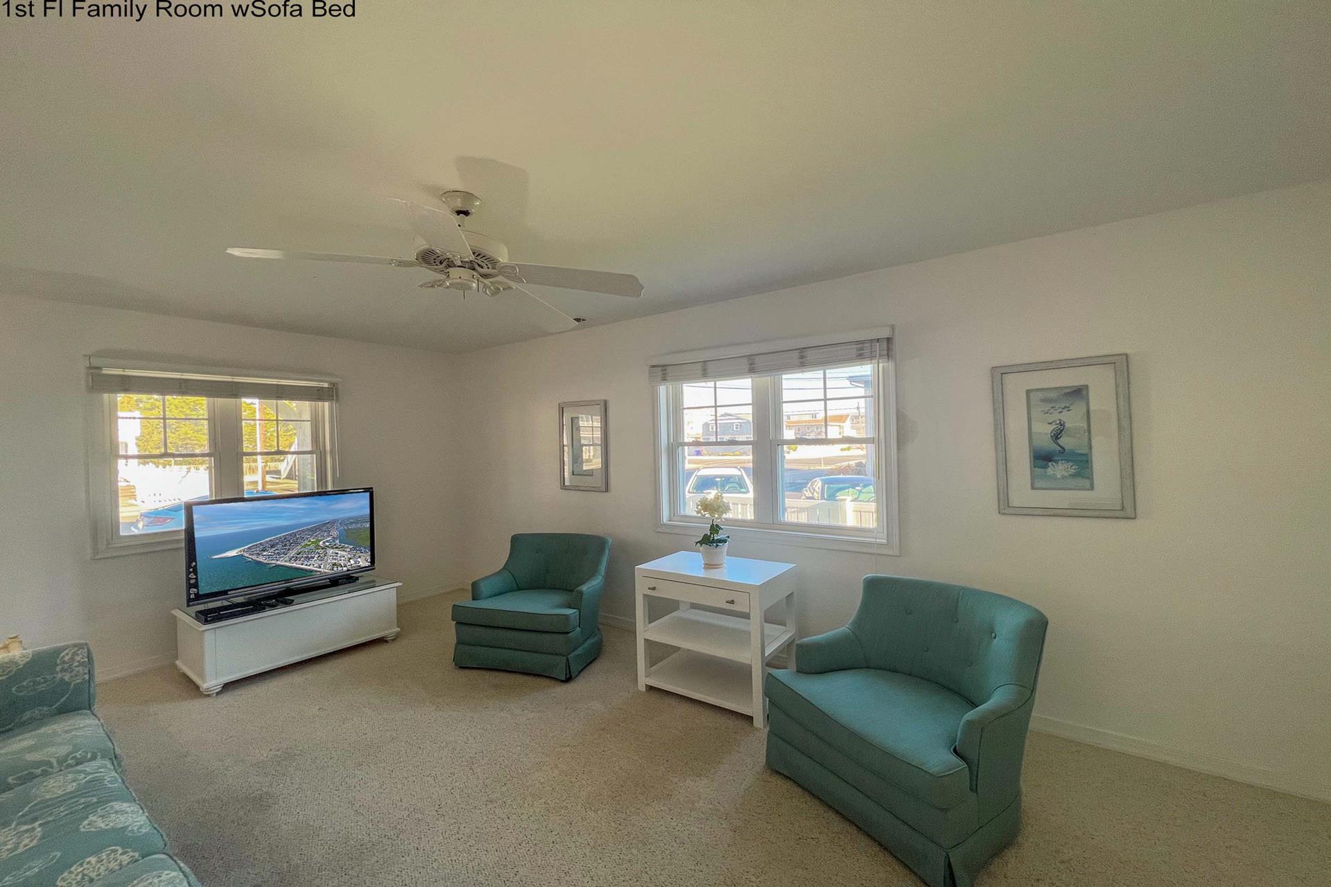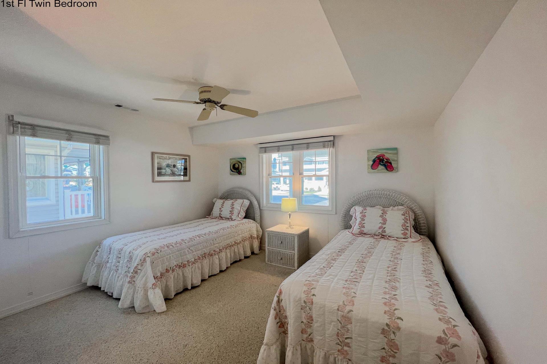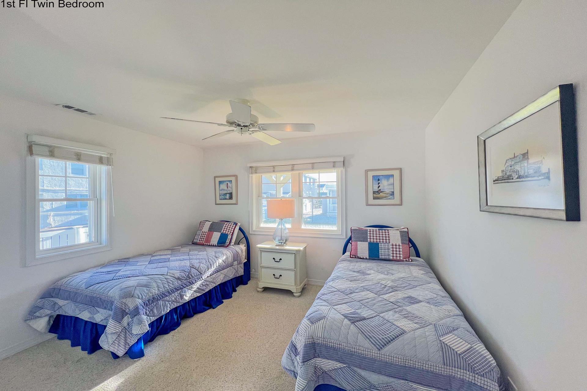 One short block to Avalon s beaches and within minutes from town and boardwalk. This 4 bedroom, 2.5 bath home has all the amenities and charm needed for a relaxing vacation...ocean views, front and rear decks! Enter the first floor foyer and directly ahead is the utility room. To the left you will find the Southeast bedroom which has twin beds. The Southwest bedroom has a queen sized bed. To the North side of the first floor you will find the family room with queen sofa bed, TV, ceiling fan and sink. On the Northwest side is a bedroom with 2 twin beds. There is also a full bath (tub/shower) in the hallway. As you go up the stairs to the 2nd floor you will find the living room which has a ceiling fan and slider to deck which provides ocean views. Second floor deck has natural gas grill. There is also a dining area with table to seat 6 and a fully equipped kitchen. As you move to the South side of the 2nd floor there is a half bath (tub/shower) in the hall. The master bedroom is located on the Southeast side of the house. This room has a full bath, ceiling fan and slider to rear deck.