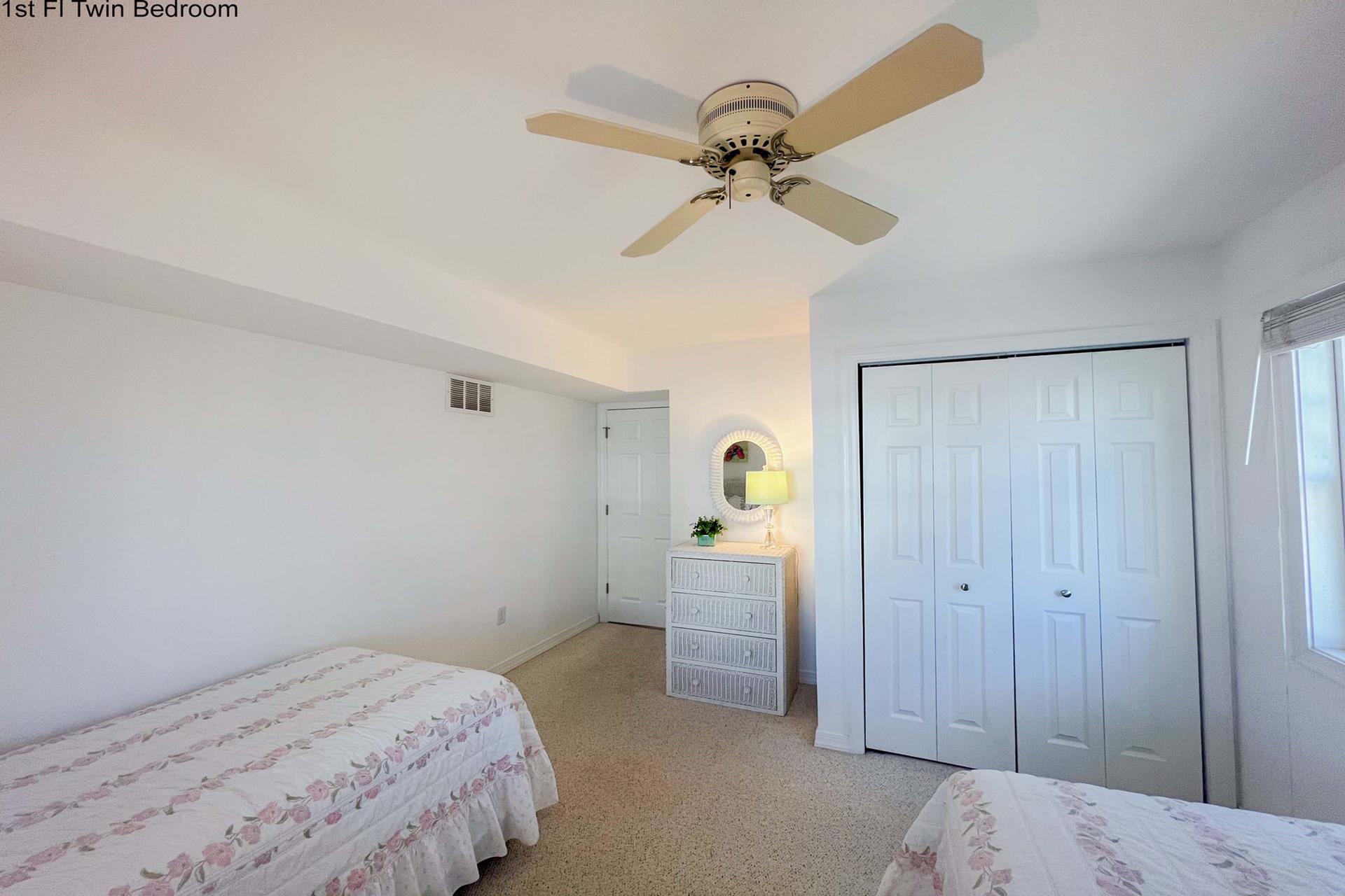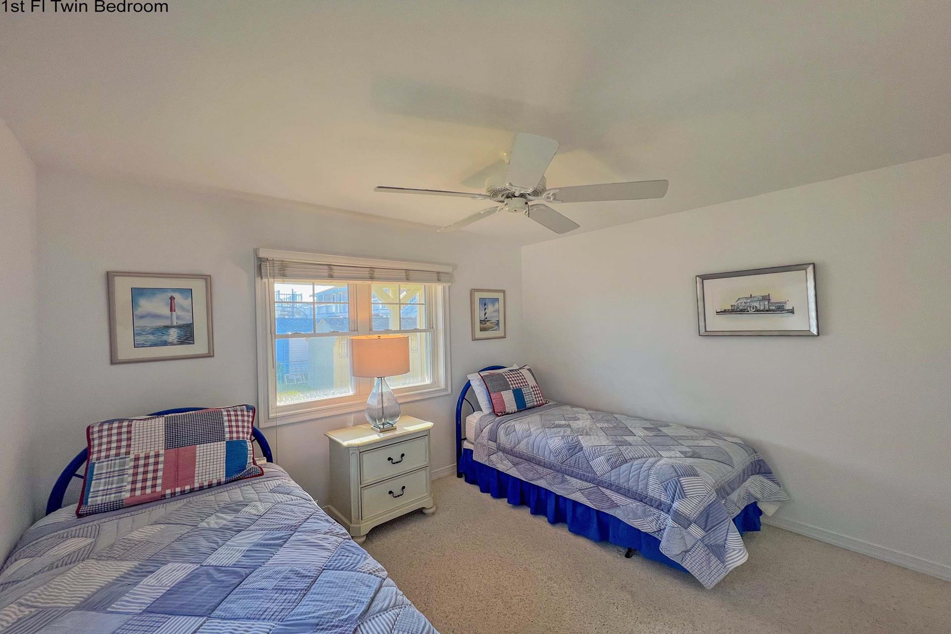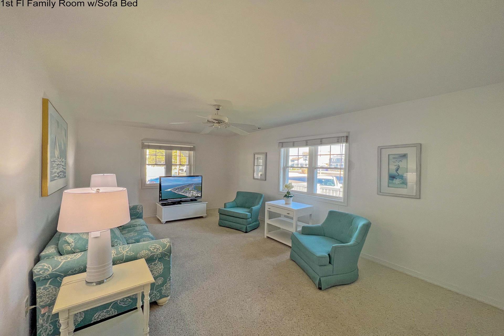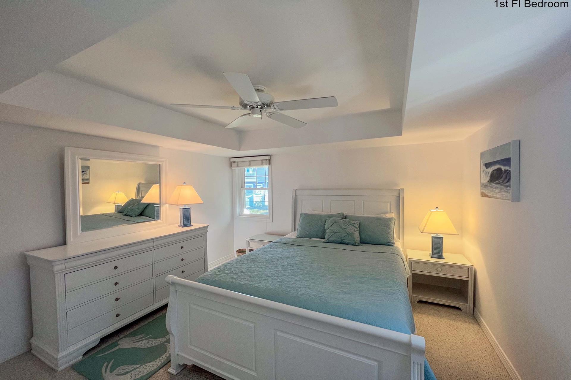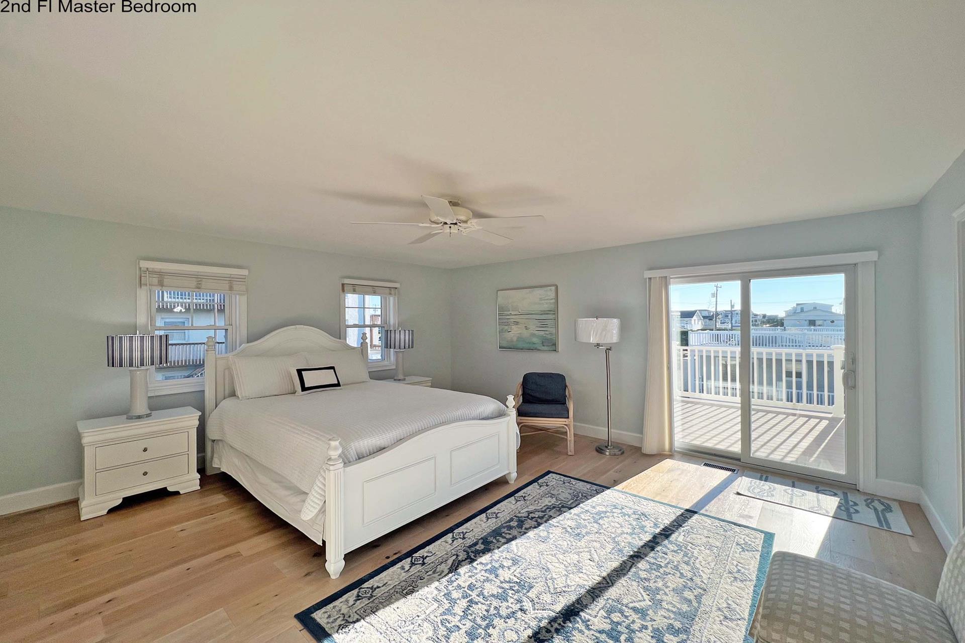 One short block to Avalon s beaches and within minutes from town and boardwalk. This 4 bedroom, 2.5 bath home has all the amenities and charm needed for a relaxing vacation...ocean views, front and rear decks! Enter the first floor foyer and directly ahead is the utility room. To the left you will find the Southeast bedroom which has twin beds. The Southwest bedroom has a queen sized bed. To the North side of the first floor you will find the family room with queen sofa bed, TV, ceiling fan and sink. On the Northwest side is a bedroom with 2 twin beds. There is also a full bath (tub/shower) in the hallway. As you go up the stairs to the 2nd floor you will find the living room which has a ceiling fan and slider to deck which provides ocean views. Second floor deck has natural gas grill. There is also a dining area with table to seat 6 and a fully equipped kitchen. As you move to the South side of the 2nd floor there is a half bath (tub/shower) in the hall. The master bedroom is located on the Southeast side of the house. This room has a full bath, ceiling fan and slider to rear deck.