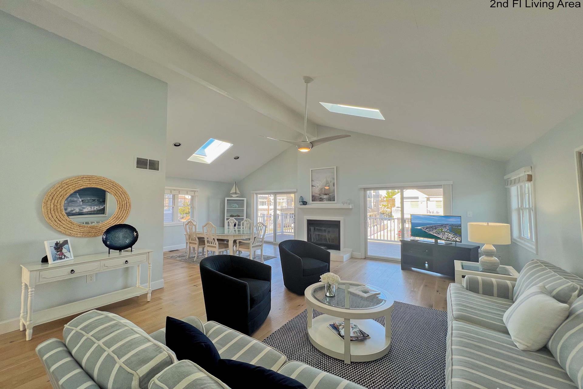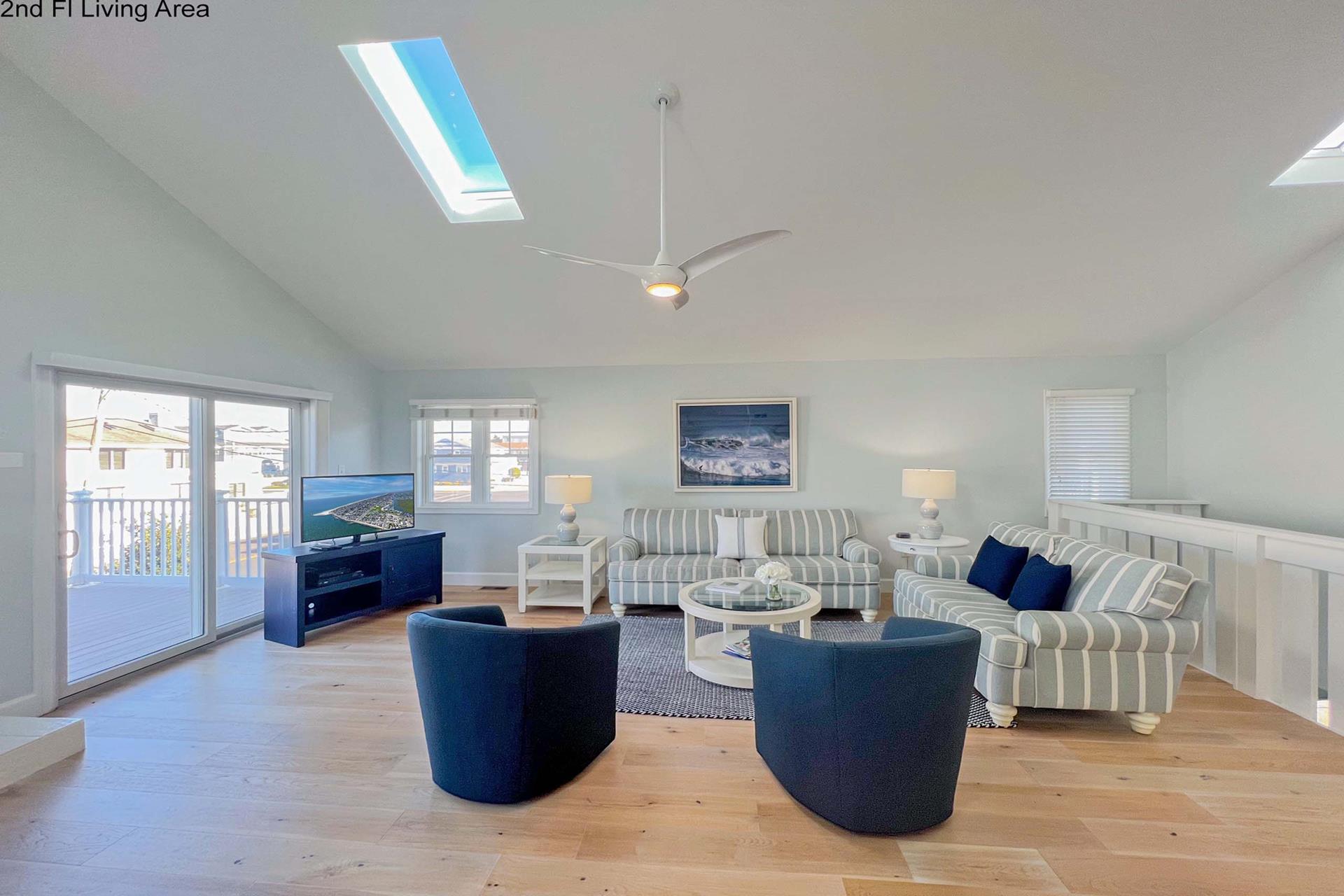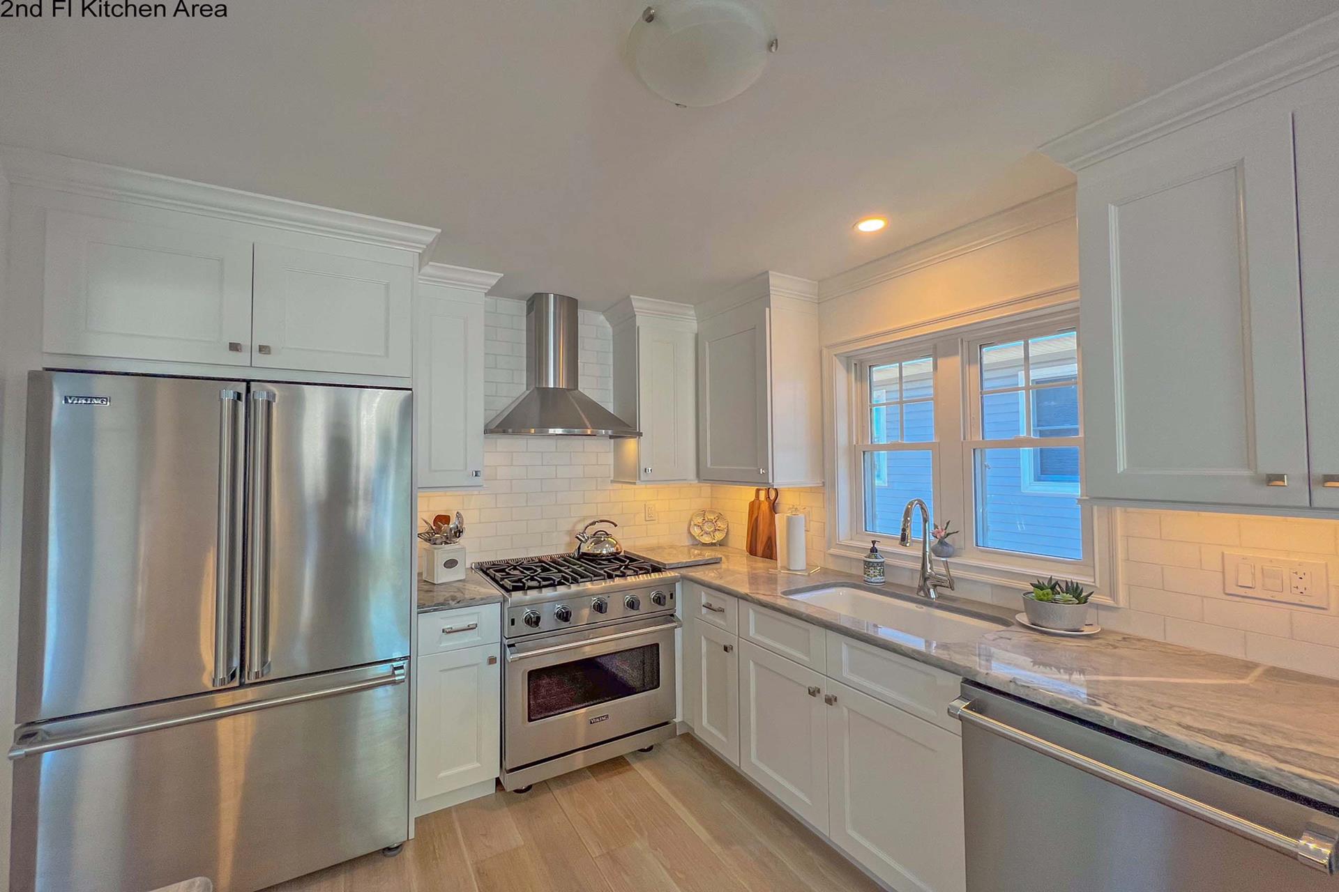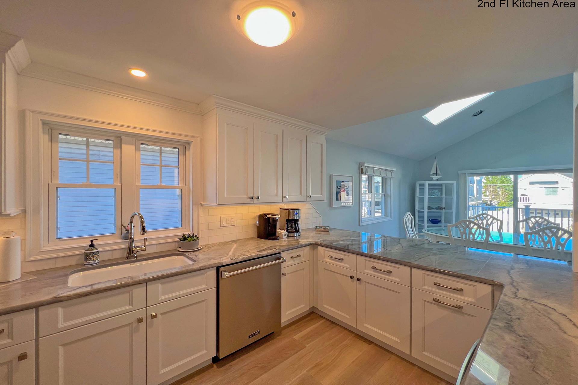One short block to Avalon s beaches and within minutes from town and boardwalk. This 4 bedroom, 2.5 bath home has all the amenities and charm needed for a relaxing vacation...ocean views, front and rear decks! Enter the first floor foyer and directly ahead is the utility room. To the left you will find the Southeast bedroom which has twin beds. The Southwest bedroom has a queen sized bed. To the North side of the first floor you will find the family room with queen sofa bed, TV, ceiling fan and sink. On the Northwest side is a bedroom with 2 twin beds. There is also a full bath (tub/shower) in the hallway. As you go up the stairs to the 2nd floor you will find the living room which has a ceiling fan and slider to deck which provides ocean views. Second floor deck has natural gas grill. There is also a dining area with table to seat 6 and a fully equipped kitchen. As you move to the South side of the 2nd floor there is a half bath (tub/shower) in the hall. The master bedroom is located on the Southeast side of the house. This room has a full bath, ceiling fan and slider to rear deck.