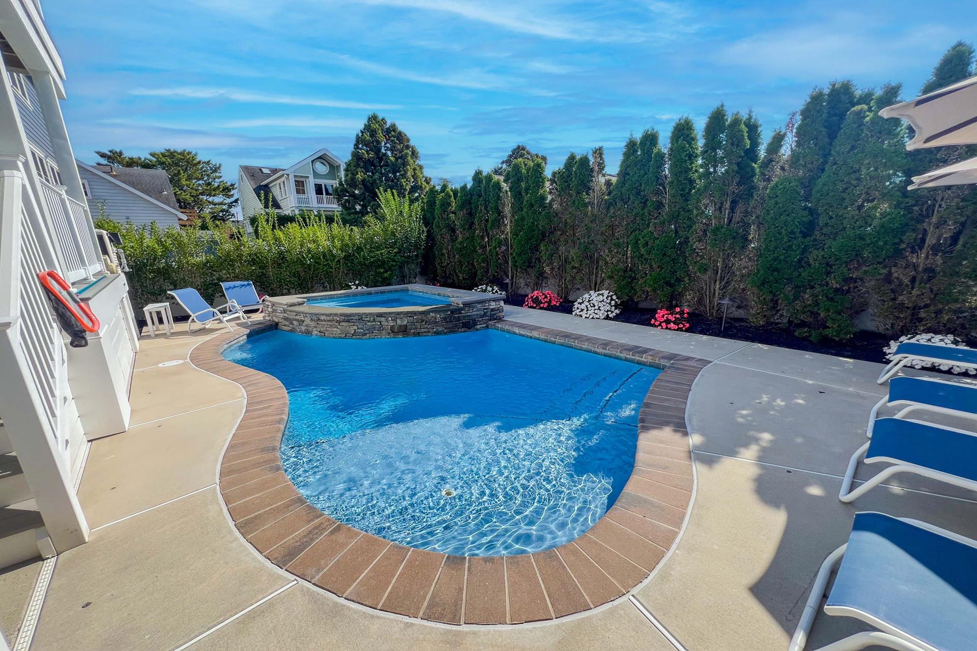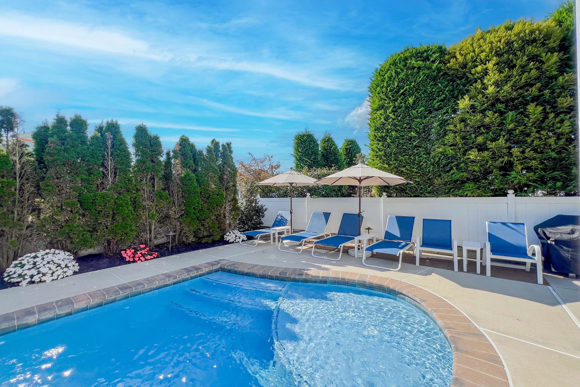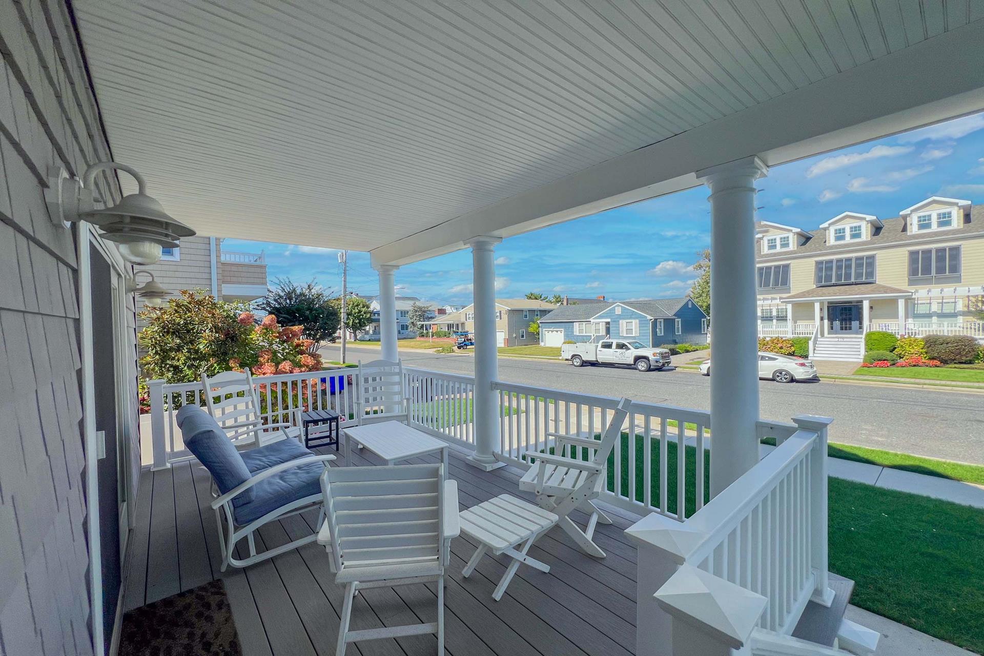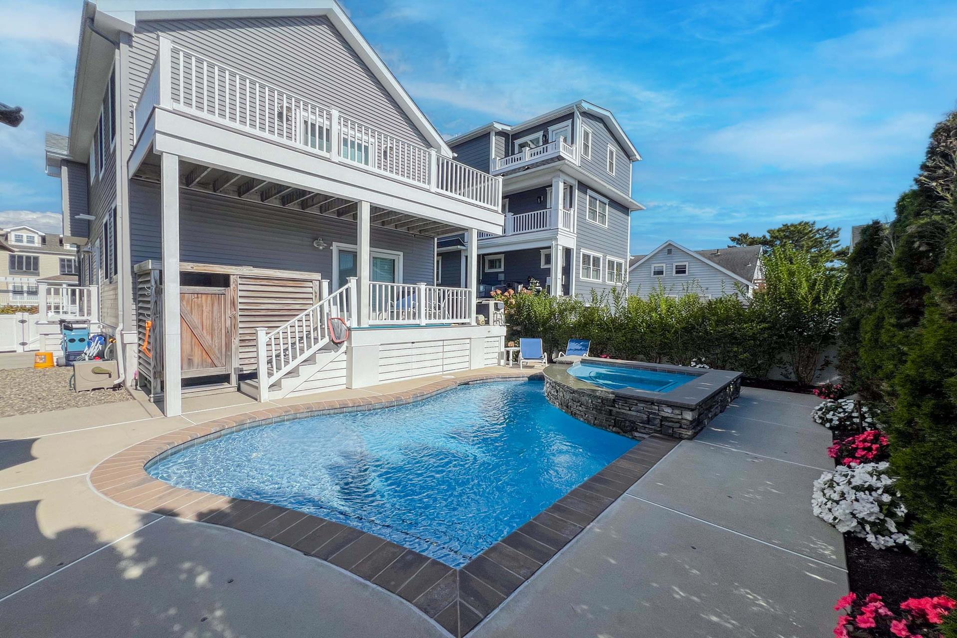 HEATED SWIMMING POOL. Spacious, bright and cheery, this centrally located 5 bedroom 4 bath upside down single family home is just waiting for your seashore enjoyment! First floor offers ensuite with queen bed, private bath and sliders to front porch. Also, on the first level is laundry room, full hall bath, a second bedroom with a twin over twin bunkbed. The third bedroom has a queen bed with a twin trundle pull out and the fourth bedroom has a King bed. The second floor great room area provides an open and airy feeling having wood flooring with a beautifully furnished living room, dining area with vaulted ceilings and kitchen with breakfast bar, granite counters, subway tile back-splash, white modern cabinetry and stainless steel appliances. Sliders off the living room take you to a nice deck for morning coffe or dinner. The second floor master has a king bed, private bath and deck. Owner provides beach wagon/cart, blender, coffee maker, propane BBQ by the pool, offstreet parking and a short walk to the beach and town!