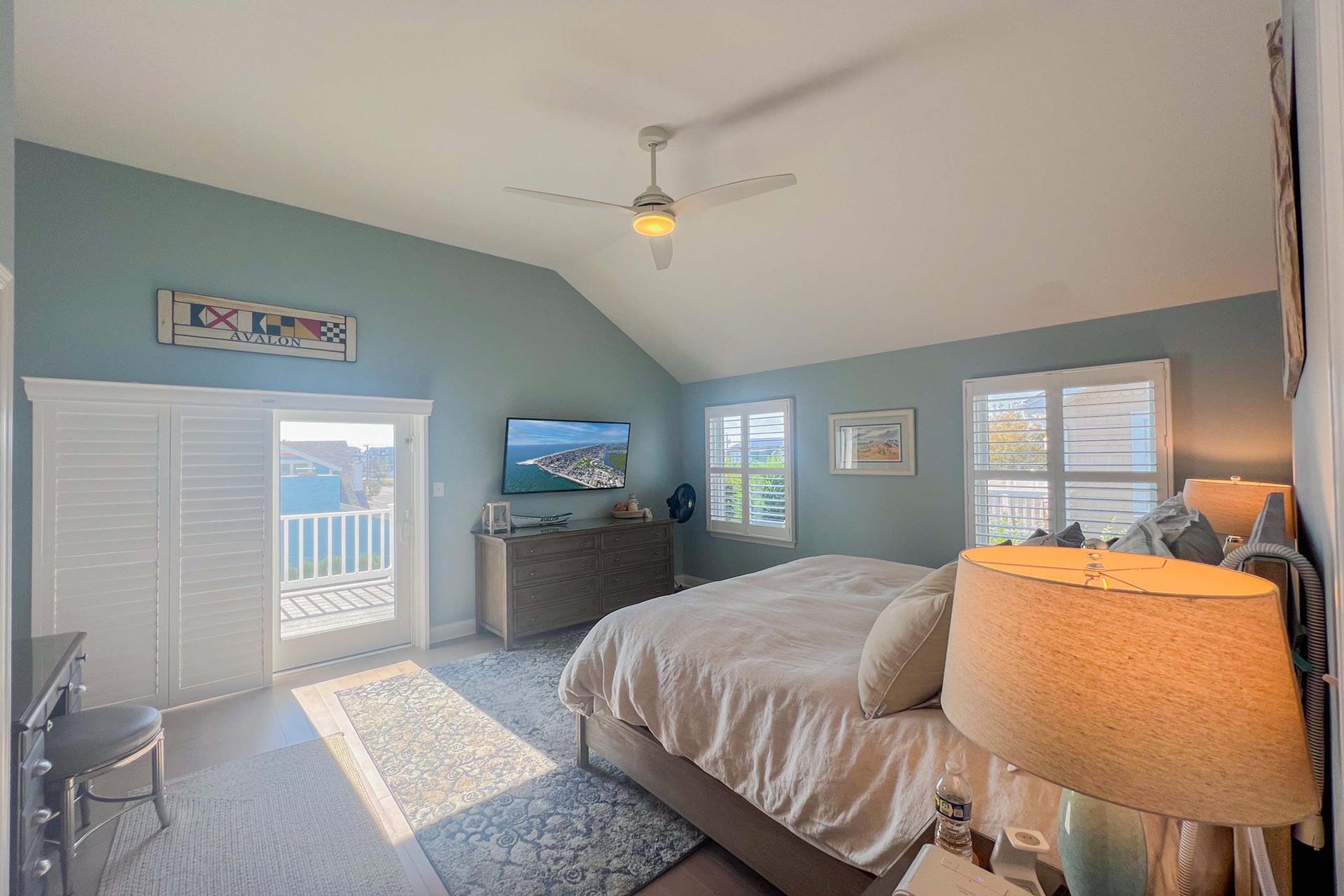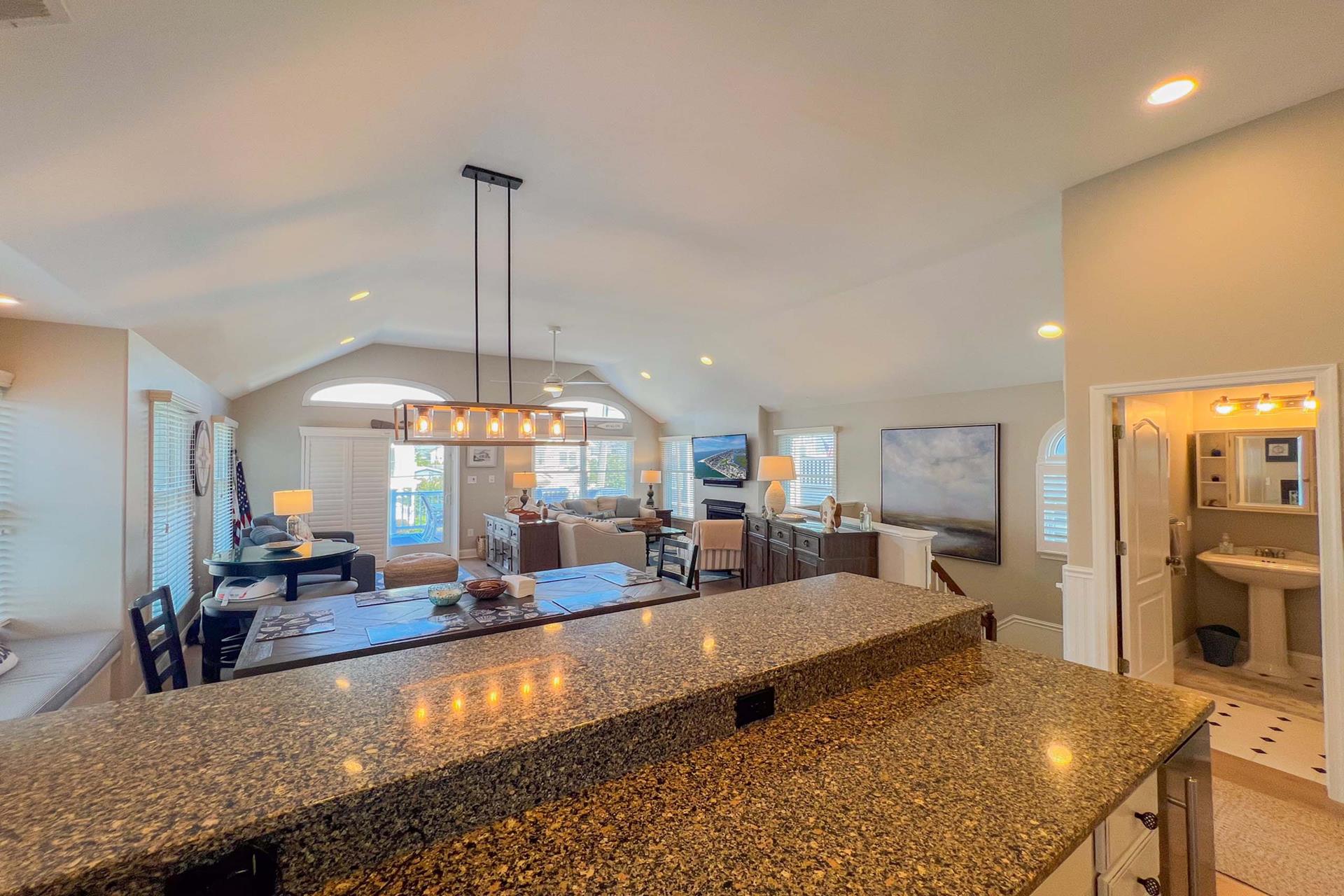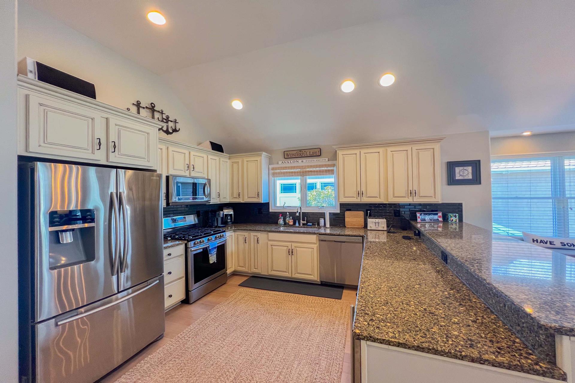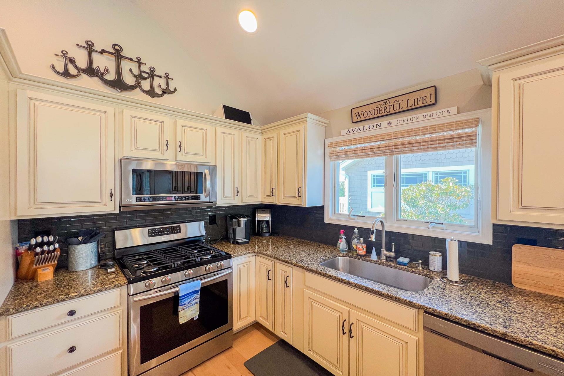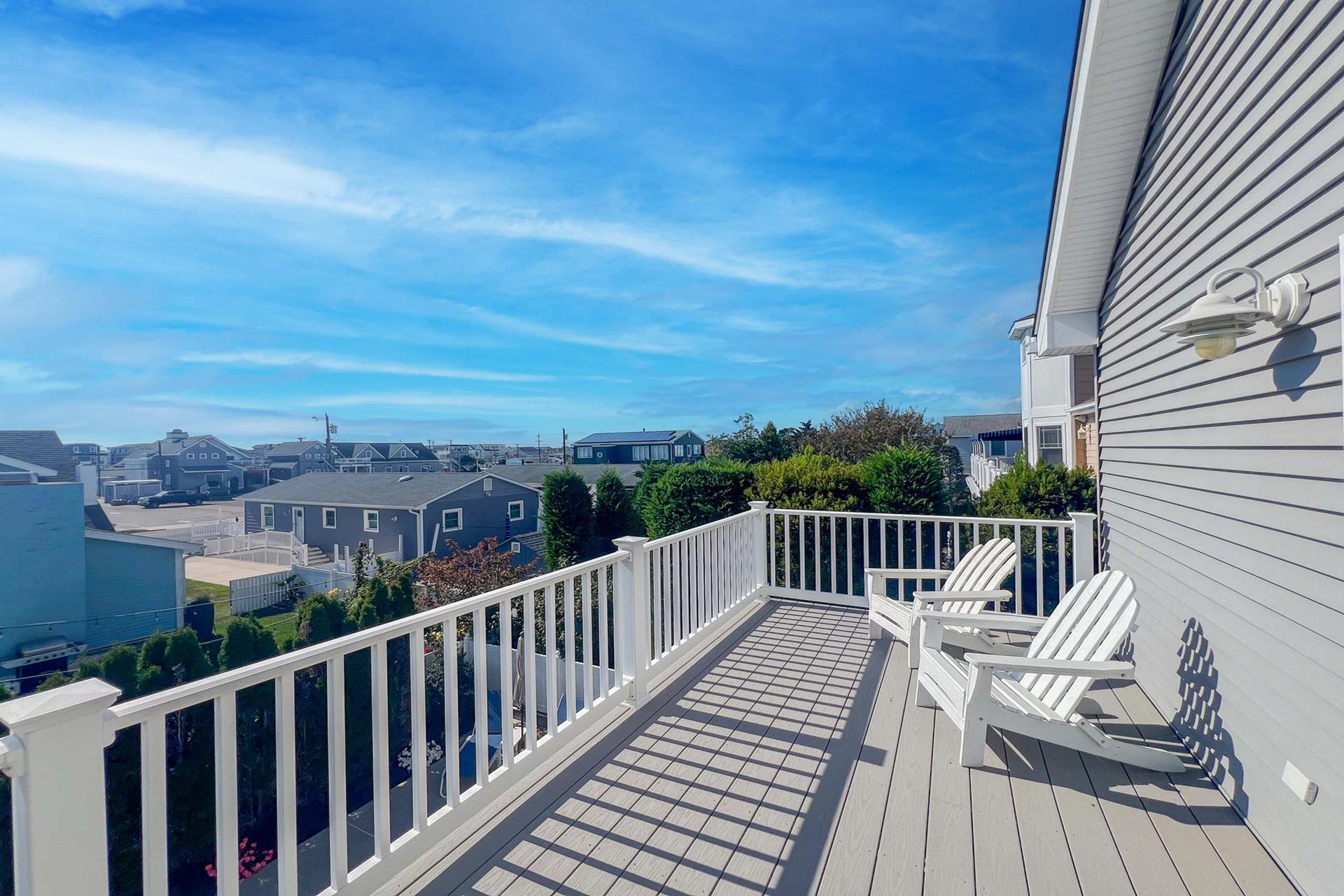 HEATED SWIMMING POOL. Spacious, bright and cheery, this centrally located 5 bedroom 4 bath upside down single family home is just waiting for your seashore enjoyment! First floor offers ensuite with queen bed, private bath and sliders to front porch. Also, on the first level is laundry room, full hall bath, a second bedroom with a twin over twin bunkbed. The third bedroom has a queen bed with a twin trundle pull out and the fourth bedroom has a King bed. The second floor great room area provides an open and airy feeling having wood flooring with a beautifully furnished living room, dining area with vaulted ceilings and kitchen with breakfast bar, granite counters, subway tile back-splash, white modern cabinetry and stainless steel appliances. Sliders off the living room take you to a nice deck for morning coffe or dinner. The second floor master has a king bed, private bath and deck. Owner provides beach wagon/cart, blender, coffee maker, propane BBQ by the pool, offstreet parking and a short walk to the beach and town!
