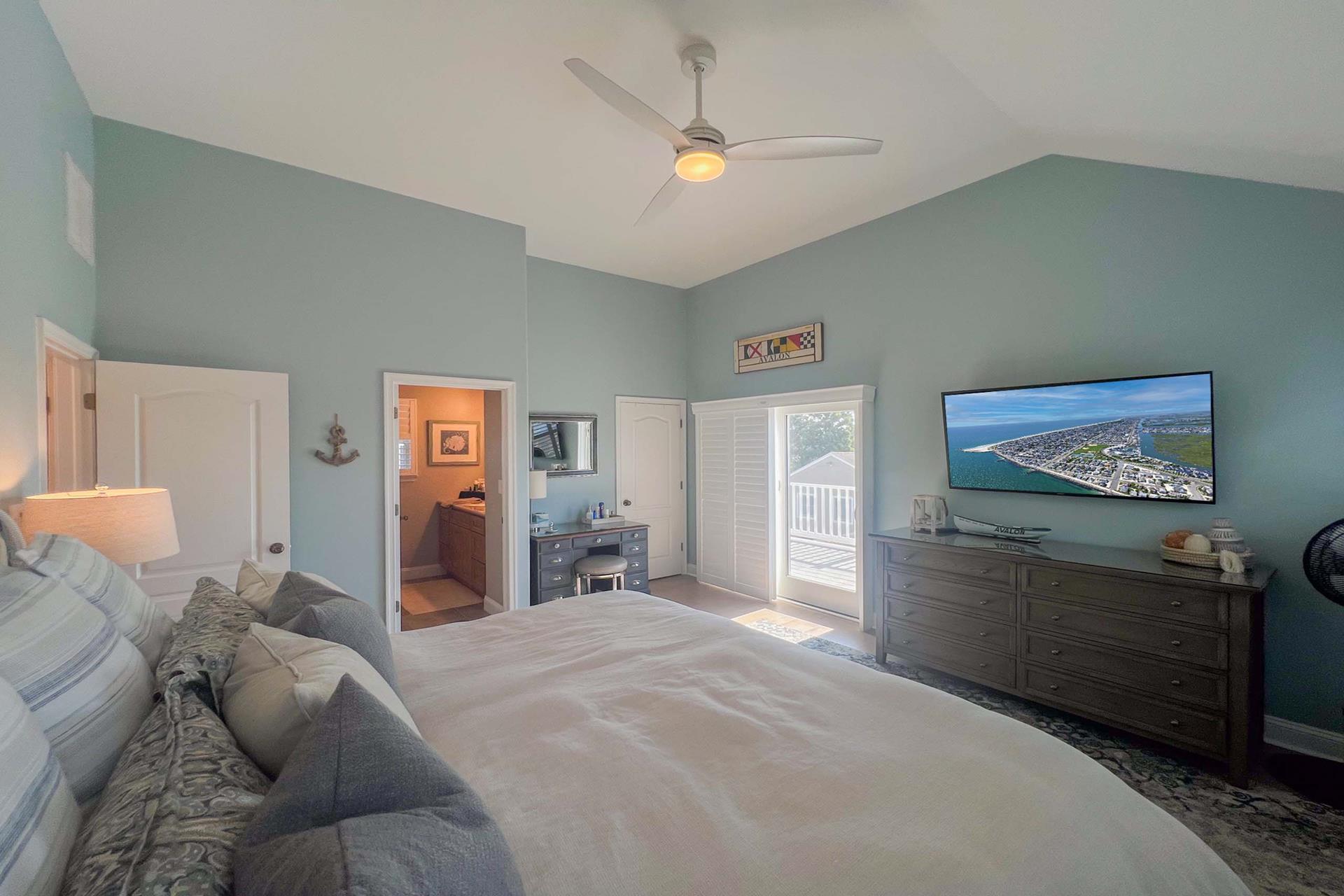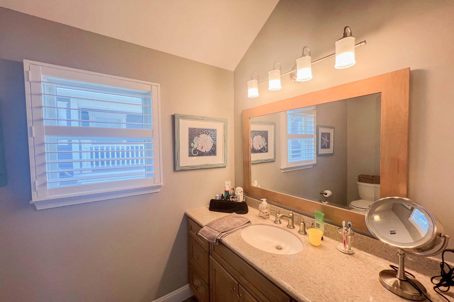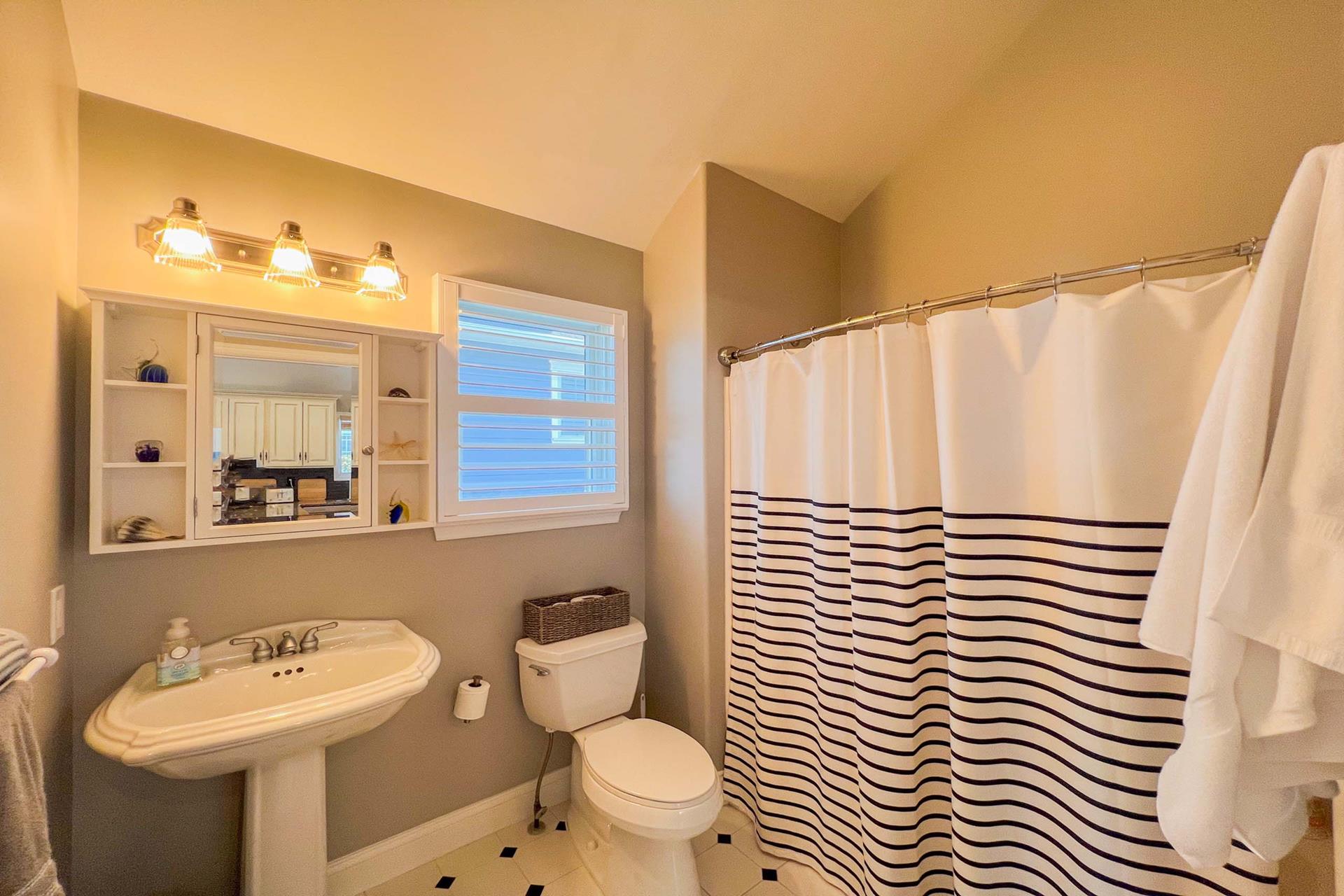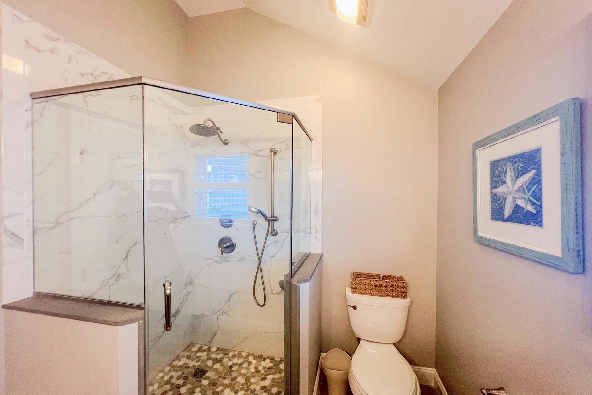 HEATED SWIMMING POOL. Spacious, bright and cheery, this centrally located 5 bedroom 4 bath upside down single family home is just waiting for your seashore enjoyment! First floor offers ensuite with queen bed, private bath and sliders to front porch. Also, on the first level is laundry room, full hall bath, a second bedroom with a twin over twin bunkbed. The third bedroom has a queen bed with a twin trundle pull out and the fourth bedroom has a King bed. The second floor great room area provides an open and airy feeling having wood flooring with a beautifully furnished living room, dining area with vaulted ceilings and kitchen with breakfast bar, granite counters, subway tile back-splash, white modern cabinetry and stainless steel appliances. Sliders off the living room take you to a nice deck for morning coffe or dinner. The second floor master has a king bed, private bath and deck. Owner provides beach wagon/cart, blender, coffee maker, propane BBQ by the pool, offstreet parking and a short walk to the beach and town!
