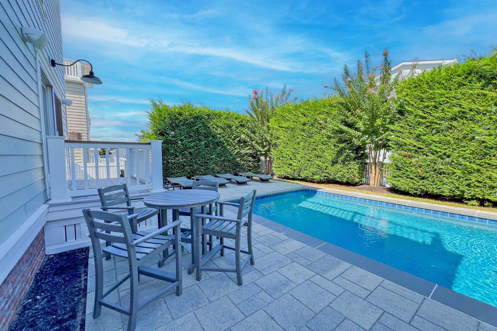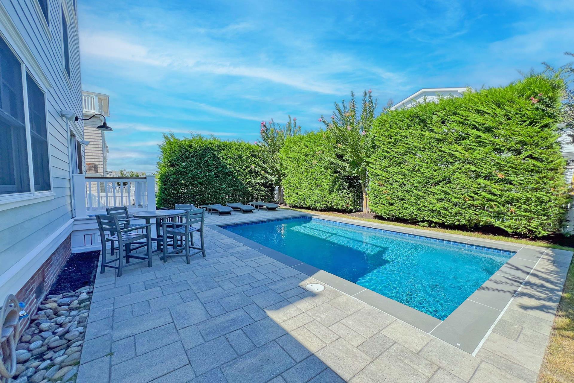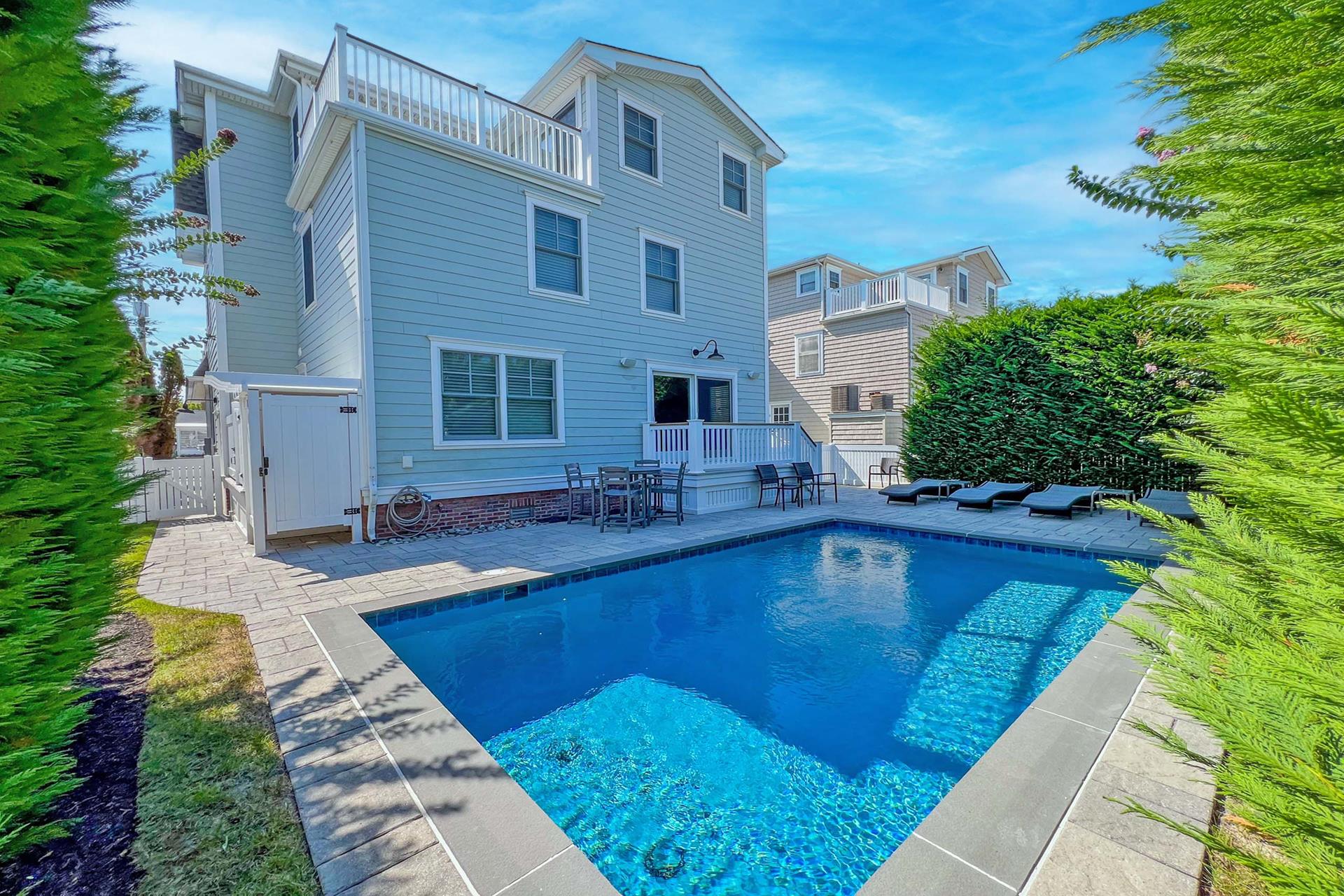 6 bedroom and 6.5 bathroom, with an ELEVATOR (Security Deposit Required for Elevator Use) and a HEATED POOL. The first floor offers two bedrooms (one with a queen bed and the other with twin beds) two full bathrooms, a laundry room and a huge family room off the pool. The family room is outfitted with in ceiling speakers, a custom wet bar, and slider access to a great back yard. The second floor great room features vaulted ceilings over the living room, a large dining area, a beautiful chefs kitchen, a giant center island with plenty of seating and stainless steel appliances. Also on the second floor are two more bedrooms (one with a king bed and the other with a queen bed), both featuring ensuite bathrooms, and a powder room for the entertaining space. The third floor offers a second washer and dryer, the fifth bedroom (with a queen bed) offering an ensuite bath and a private deck with ocean views) and the enormous master suite. The master has a great ensuite bath, king bed, walk-in closet and a large private deck. The four stop elevator provides access to all three stories and the ground level. Owner provides blender, iron and ironing board, coffee maker, keurig, 2 off street parking spots in driveway, and Natural Gas BBQ off 2nd floor deck (kitchen area). There are 4 TVS (1st Fl Family Room, 2nd Fl Living Room, Master Bedroom 2nd and 3rd Fl), Garage for storage use only.