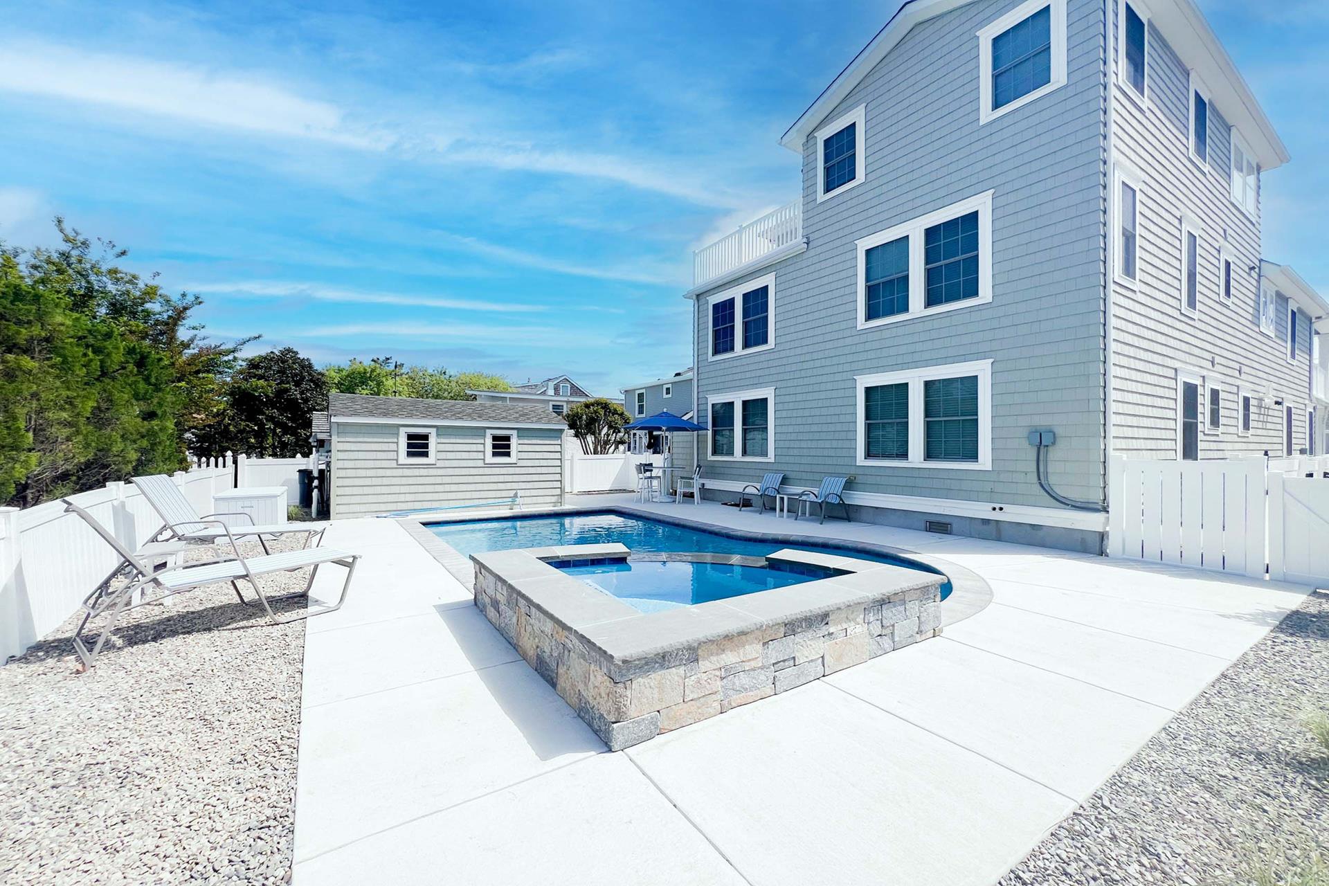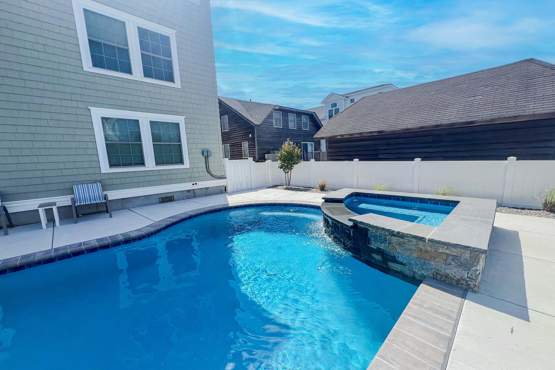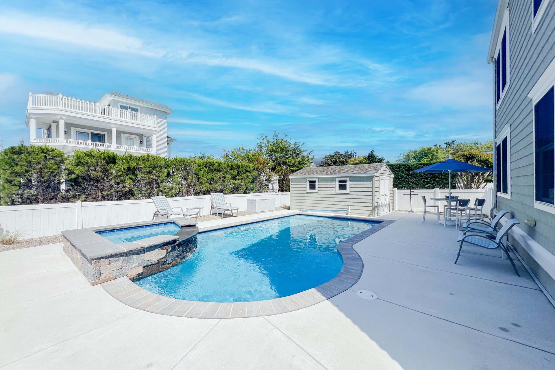 Three story, 6 bedroom 5 bath home with heated swimming pool. You’ll appreciate the fantastic location of this property, which is ideally situated in a quiet neighborhood that’s just over one block from the beach and a few blocks into town! The expansive floor plan provides TWO large living spaces – one on the first floor spans the full width of the home spilling out onto a covered front deck. Wet bar and full sized refrigerator creates the ideal entertaining area or space. The second living area sits at the top of the hardwood stair case opening up with volume ceilings over a spacious great room. Light and ocean breezes fill the room through many windows and sliders. The great room opens onto a large sun deck along with the ideal covered porch to enjoy all day and night. Hardwood flooring runs throughout the home’s 6 bedrooms, stair cases and living areas. The large granite topped kitchen island is sure to be the gathering place for everyone while the chef prepares the family meals. Tile and stone surfaces are found in each of the five bathrooms. Bedding/Bathroom layout as follows: 1st Floor has king bedroom with private bath, 1st floor bedroom with 2 full size beds and there is a full hall bathroom, second floor bedroom with king bed and private bath, second floor bedroom with 2 full size beds with shared bathroom with main living area, and third floor has bedroom with 2 twins (no private bath) and 3rd floor king bedroom with private bathroom. Paver driveway accommodates up to 2-3 cars.