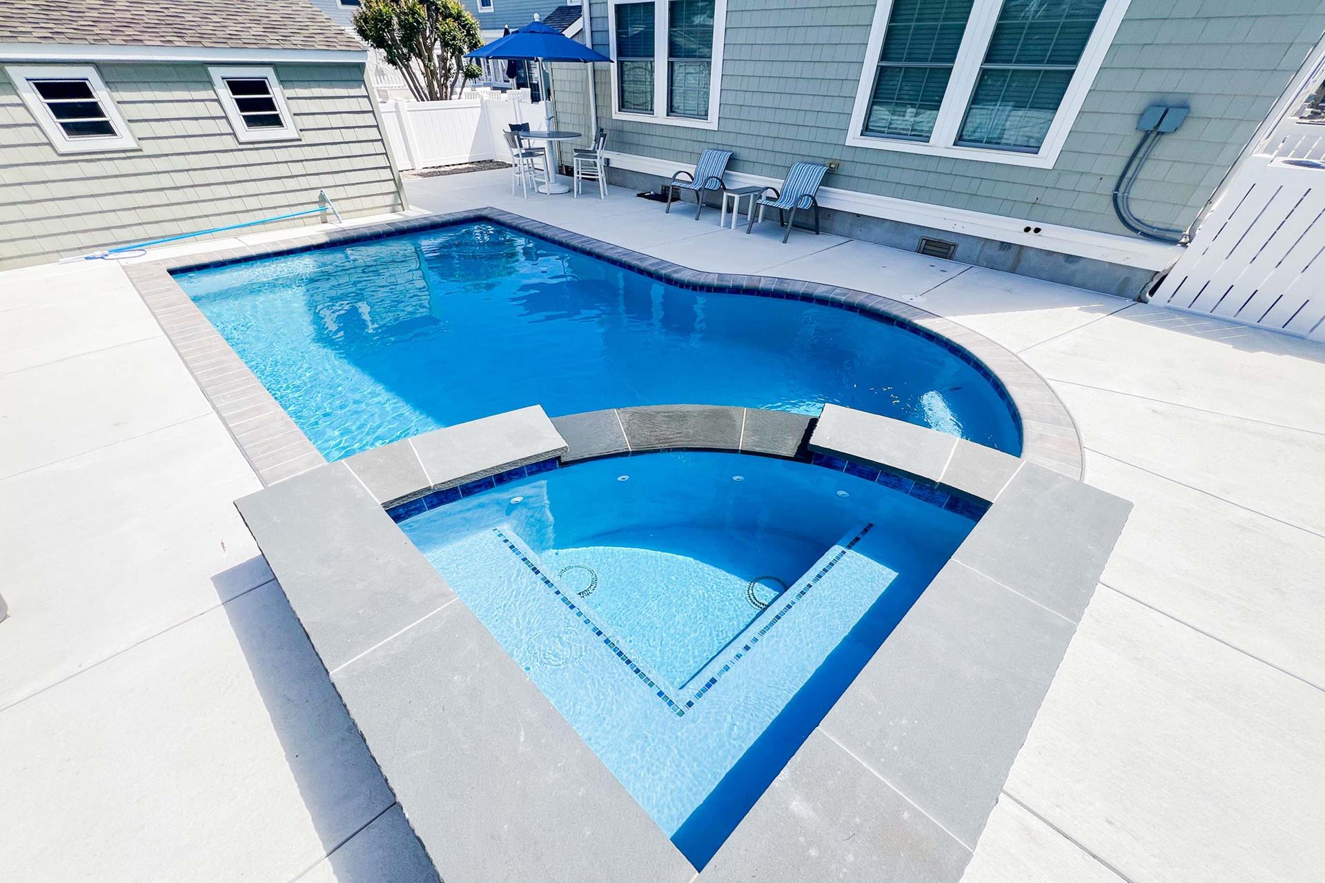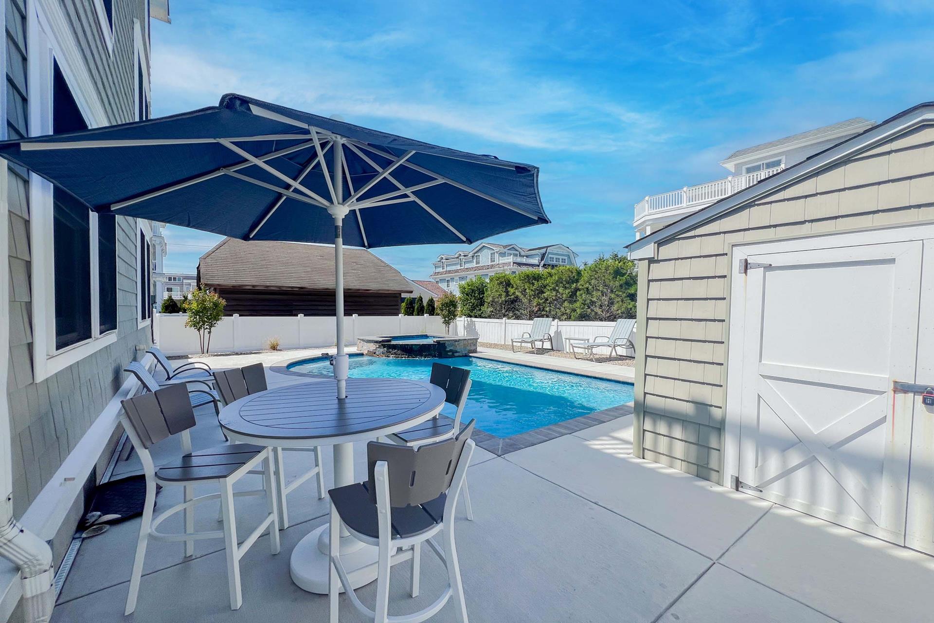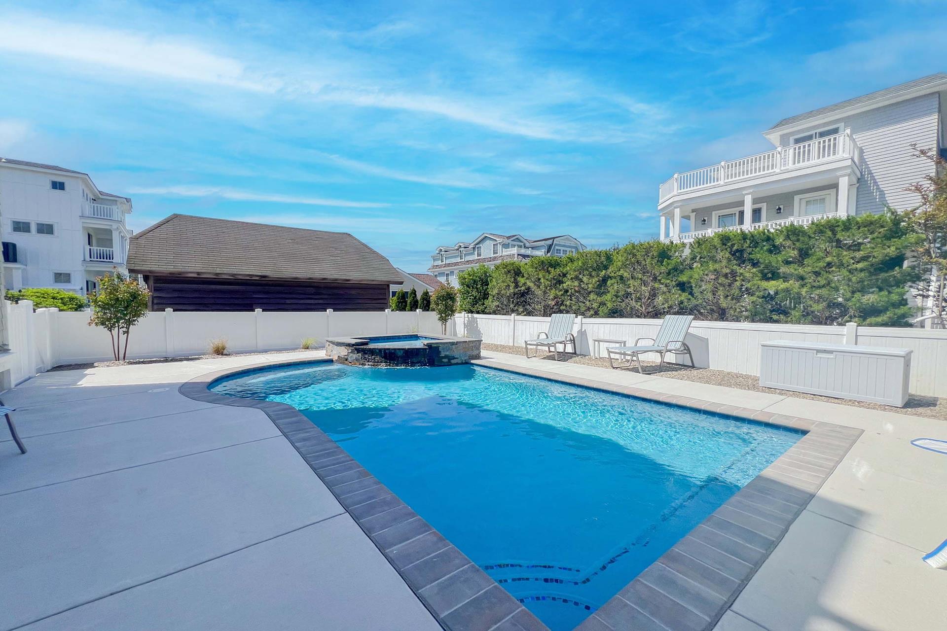 Three story, 6 bedroom 5 bath home with heated swimming pool. You’ll appreciate the fantastic location of this property, which is ideally situated in a quiet neighborhood that’s just over one block from the beach and a few blocks into town! The expansive floor plan provides TWO large living spaces – one on the first floor spans the full width of the home spilling out onto a covered front deck. Wet bar and full sized refrigerator creates the ideal entertaining area or space. The second living area sits at the top of the hardwood stair case opening up with volume ceilings over a spacious great room. Light and ocean breezes fill the room through many windows and sliders. The great room opens onto a large sun deck along with the ideal covered porch to enjoy all day and night. Hardwood flooring runs throughout the home’s 6 bedrooms, stair cases and living areas. The large granite topped kitchen island is sure to be the gathering place for everyone while the chef prepares the family meals. Tile and stone surfaces are found in each of the five bathrooms. Bedding/Bathroom layout as follows: 1st Floor has king bedroom with private bath, 1st floor bedroom with 2 full size beds and there is a full hall bathroom, second floor bedroom with king bed and private bath, second floor bedroom with 2 full size beds with shared bathroom with main living area, and third floor has bedroom with 2 twins (no private bath) and 3rd floor king bedroom with private bathroom. Paver driveway accommodates up to 2-3 cars.