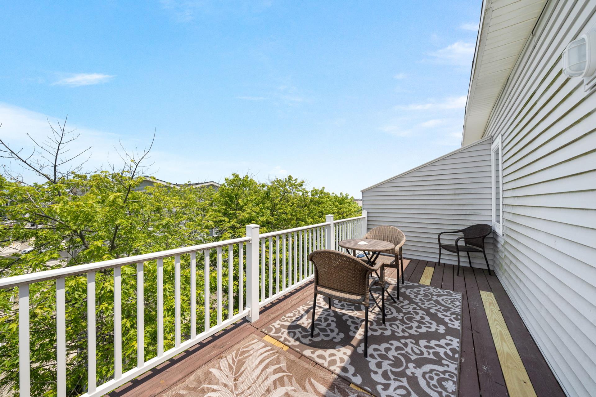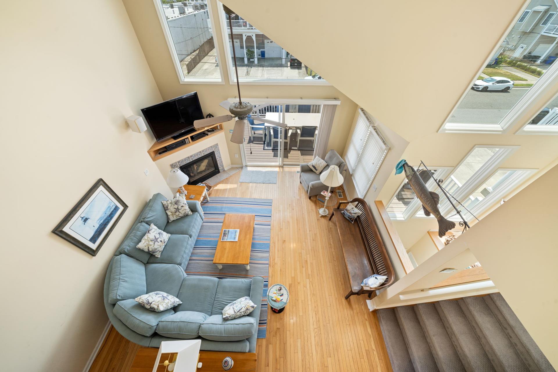The main living area on the second floor offers a great room with an open floor plan and raised ceilings. The living room is spacious and offers plenty of seating and a flat screen TV. Walk out on a large deck with a natural gas grill and an outside dining area with seating for six.