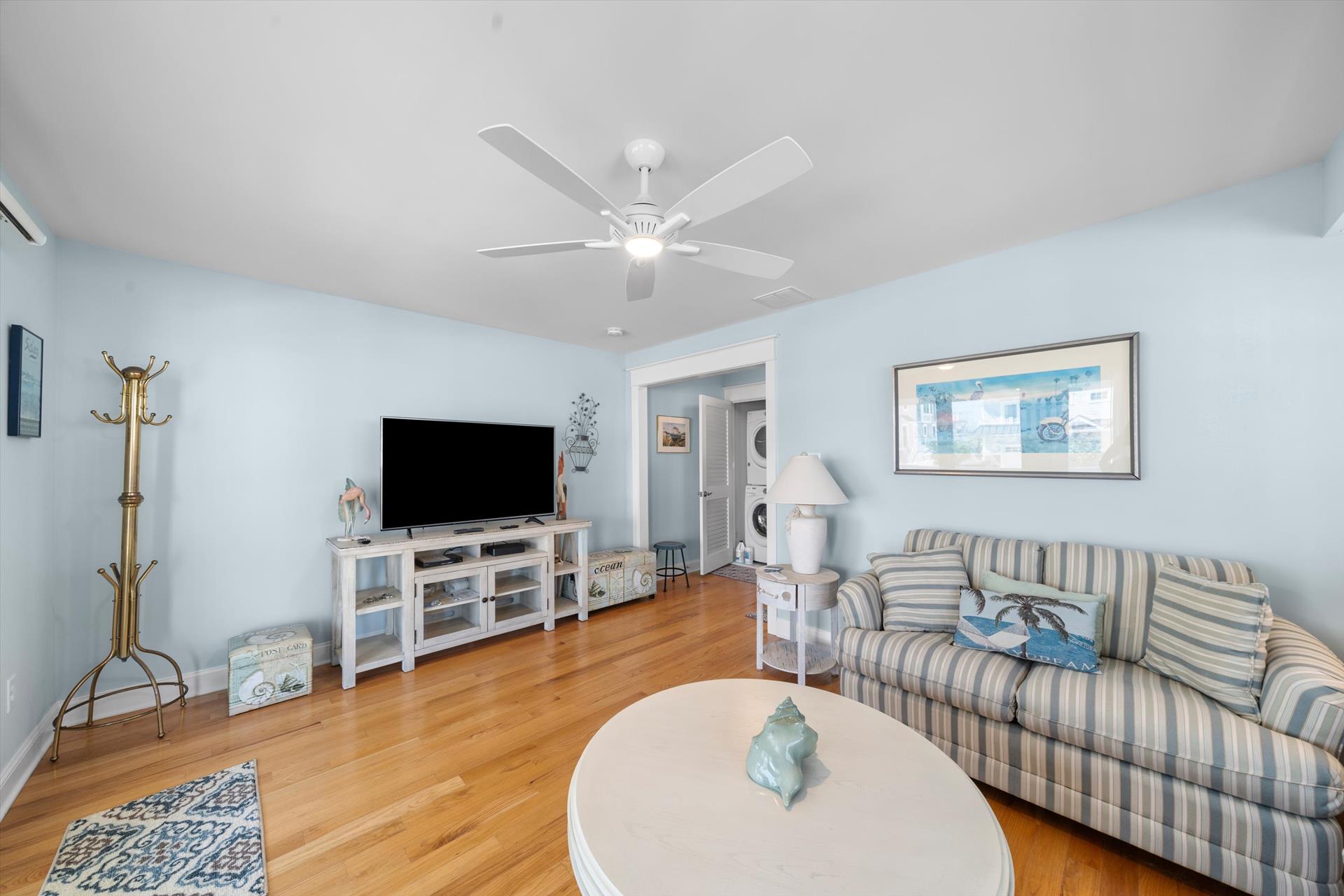 Enter through the front door or garage and find a welcoming space featuring one bedroom, a full bathroom, a cozy family room with a sleeper sofa, a private deck, and the first of two laundry areas.