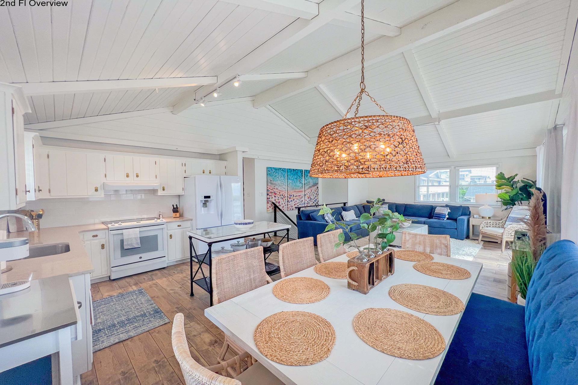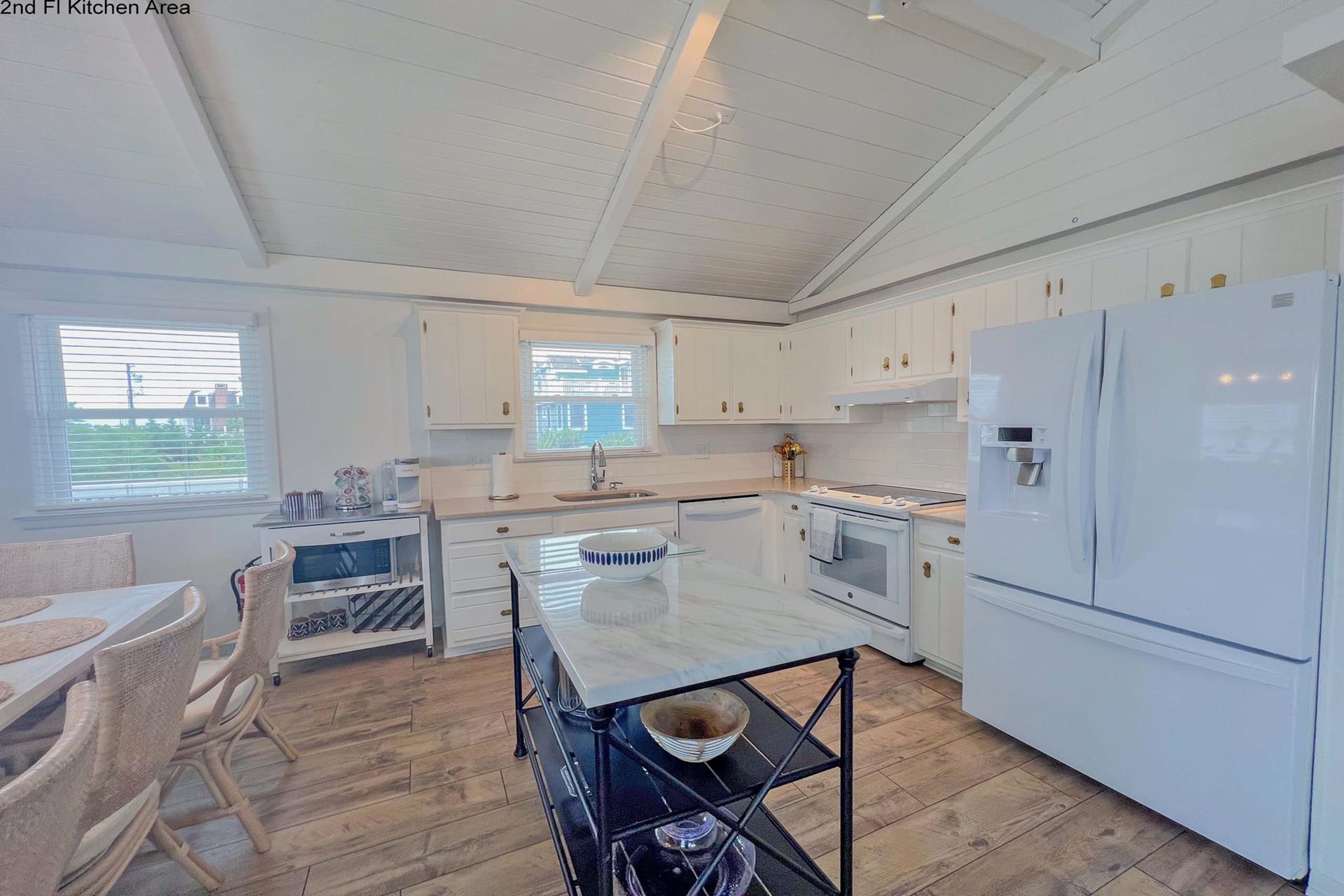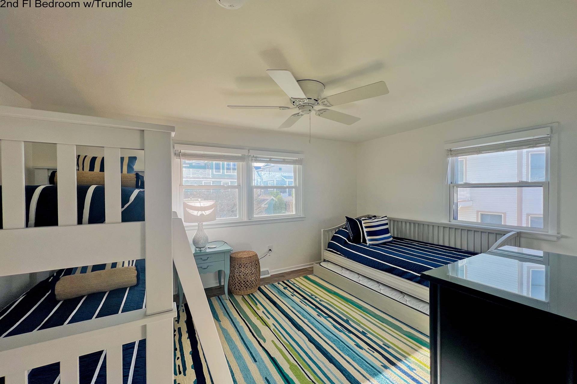 3rd house from the beach, this great home offers 4 bedrooms and 2 baths sleeping 9 people. Owner provides sheets for your convenience. The first floor has 1 bedroom with a queen bed and second bedroom with 2 twin beds. The hallway provides a full bath. Ascend to the second floor to be greeted by the main living space (living, dining, and kitchen areas). Also, on the second floor is a bedroom with a king bed, bedroom with daybed (twin) and bunkbed (twin/twin) and full hall bath. A nice office area provided and third floor loft area accessed by spiral staircase. Enjoy outdoor space either by relaxing on the second floor deck or the outside rear patio with nicely landscaped fenced in yard. Occupancy of 9 maximum no exceptions.