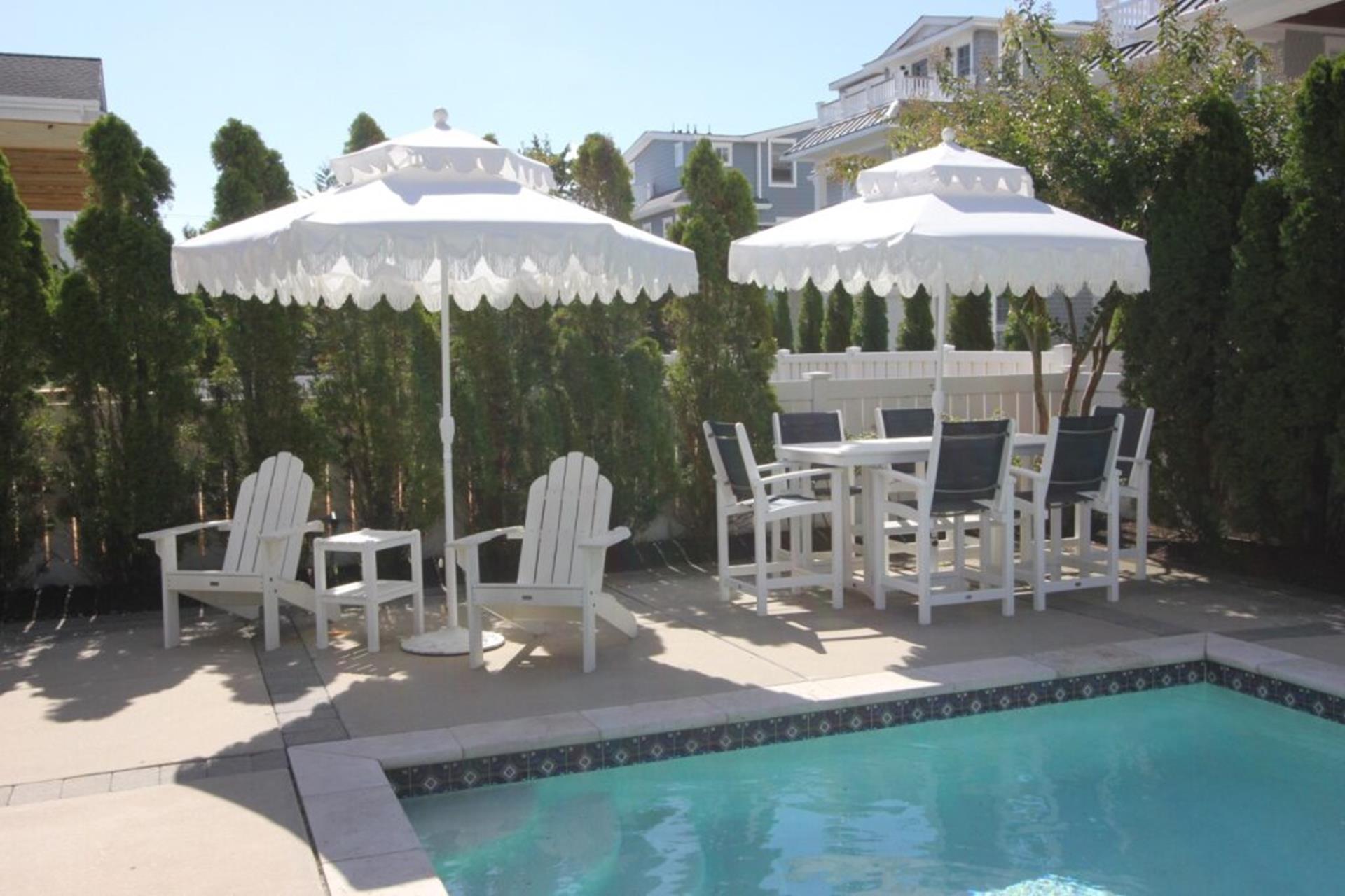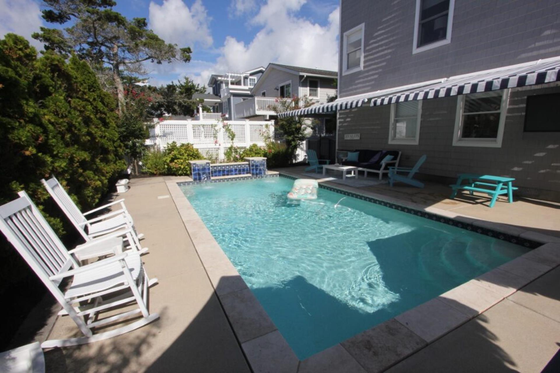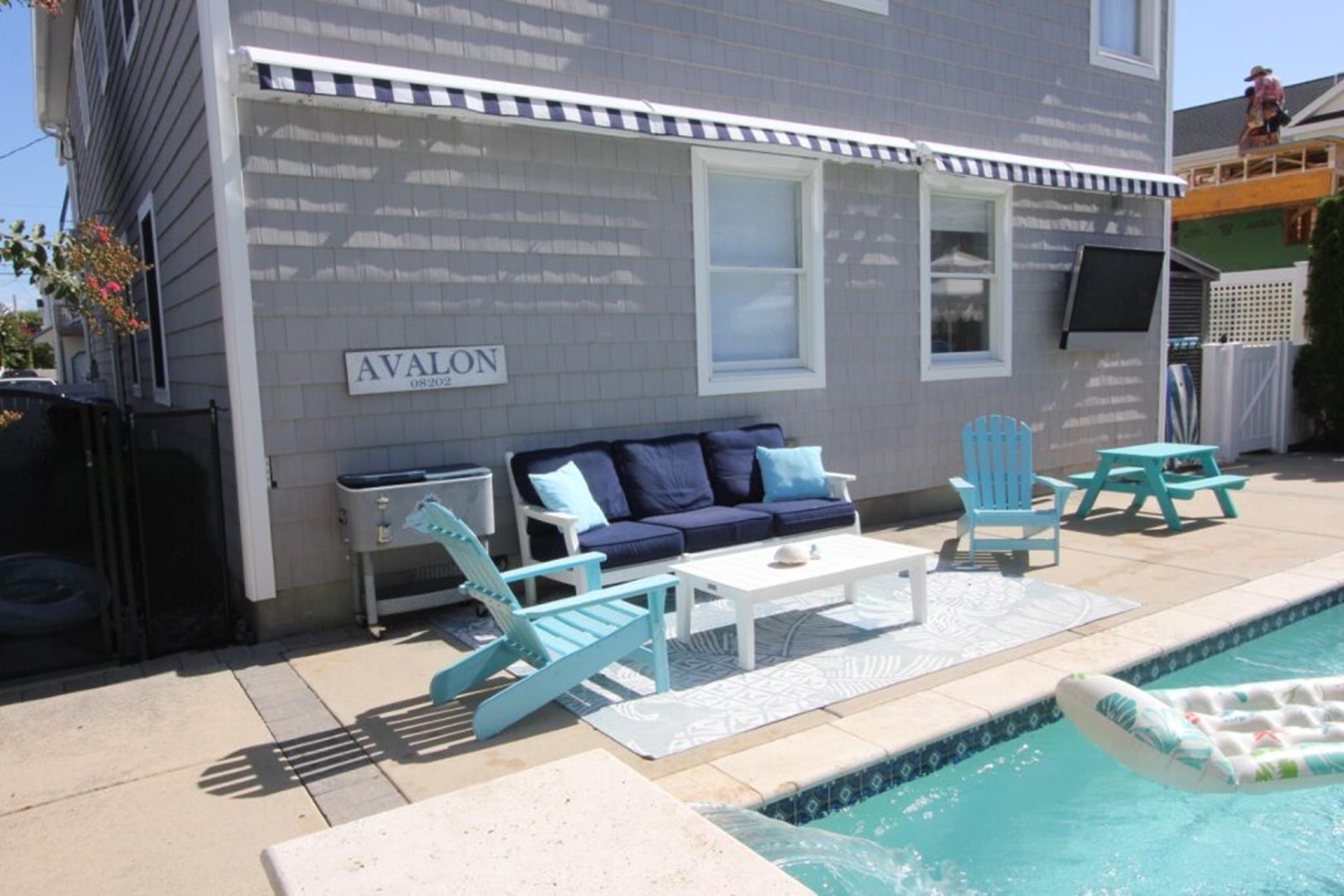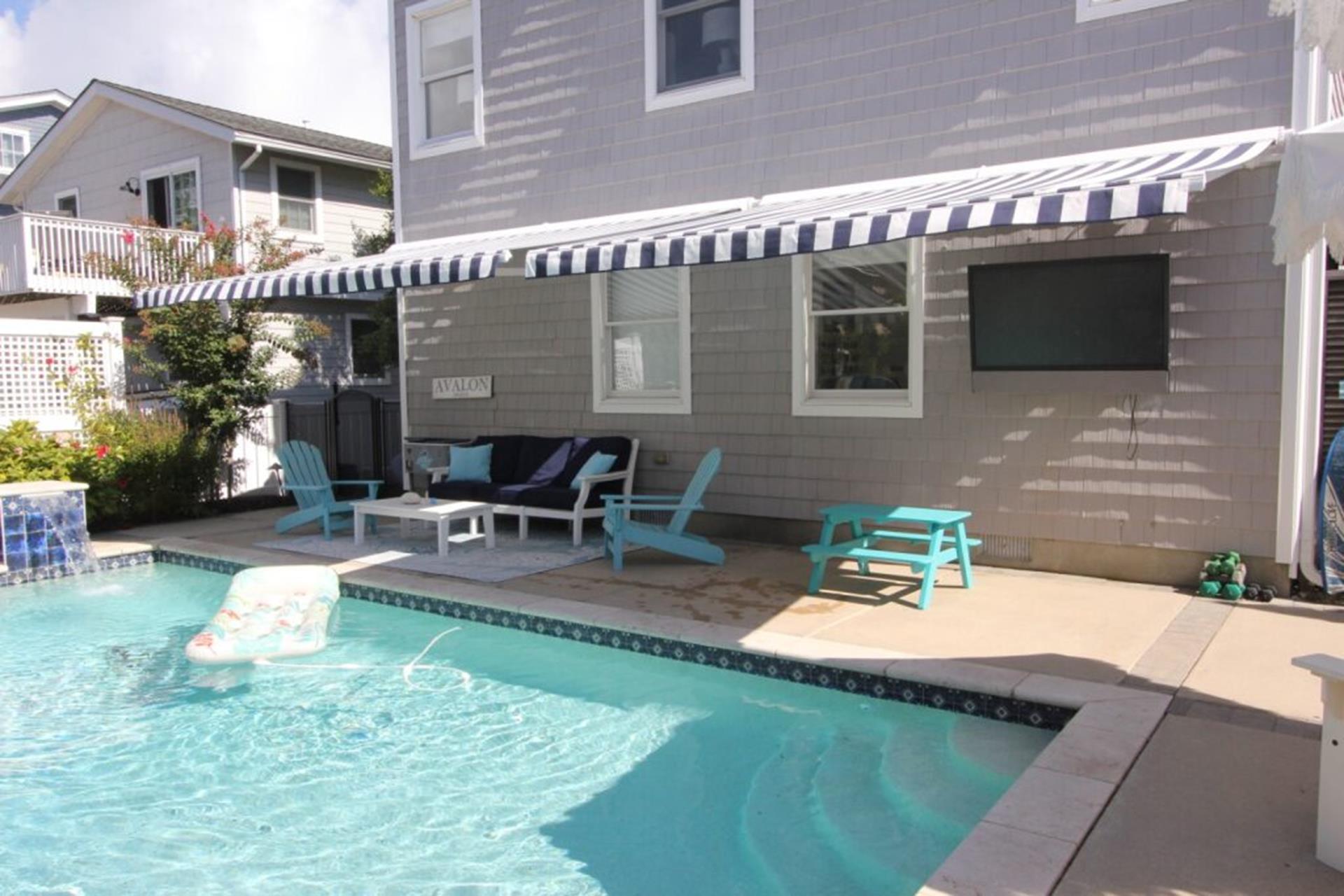 Ocean views, half block to beach, pool, five bedroom, four bathroom and a professionally decorated Avalon home with two master suites. Bring the entire family to this three story Avalon home that provides space and luxury with brand new designer furniture in all rooms and a large pool area with multiple seating areas, outdoor TV and two grills. Best of all, the home is only five houses from the beautiful, less crowded 32nd Street beach. The beach, as well as the boardwalk, playground, community center and town are only a few minutes' walk! Enjoy partial ocean views from the oversized second floor deck and third floor master suite. Outdoor designer furniture includes table seating for eight and a new covered area with sofa and chairs. The white kitchen in stocked for gourmet cooking on the main second floor and features a streaming TV, sitting/entertaining area in white and wood hues. On the first floor, families with young to mature children will enjoy a mini kitchenette with a refrigerator and sink, a bunk bedroom with a twin over double bed and a trundle bed provide room for four family members. Next to the bunk room is a bedroom with a king size bed, both rooms have windows overlooking the pool. An additional large room with double doors can be used as an extra play area, TV room or office and opens out a beautiful covered first floor porch. There are two bedrooms; one with a queen bed and adjacent bathroom and another master bedroom with king size bed and en-suite bathroom complete the second floor. Finally, the spacious third floor master bedroom features a sitting area, king size bed, en-suite bathroom and a private deck with ocean views. Family memories are guaranteed in this one of a kind beach house! NEW KITCHEN AND BATHROOMS FOR 2025 SEASON....PICTURES COMING SOON!