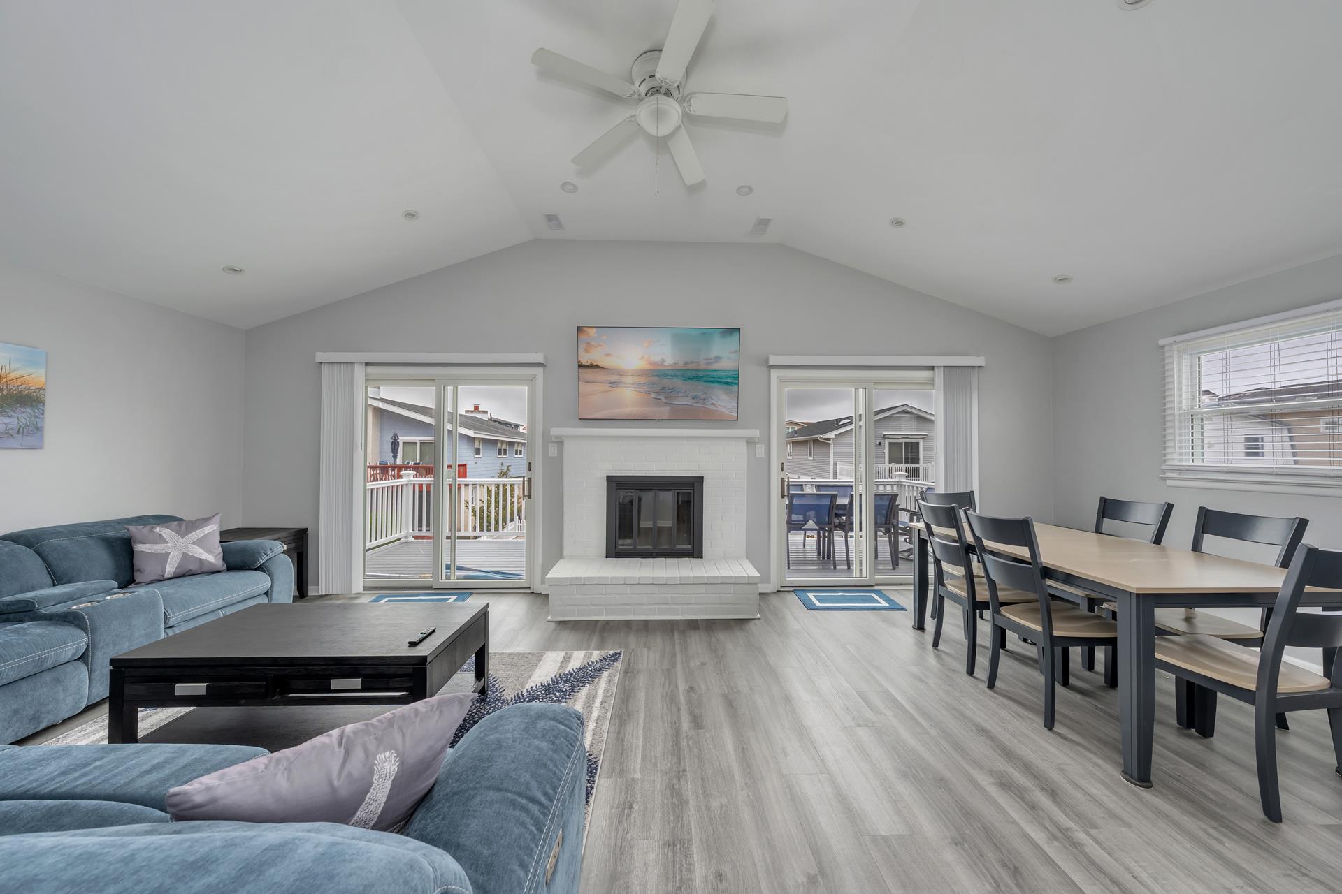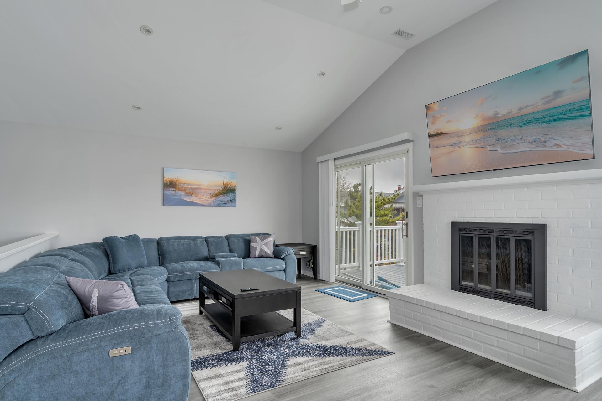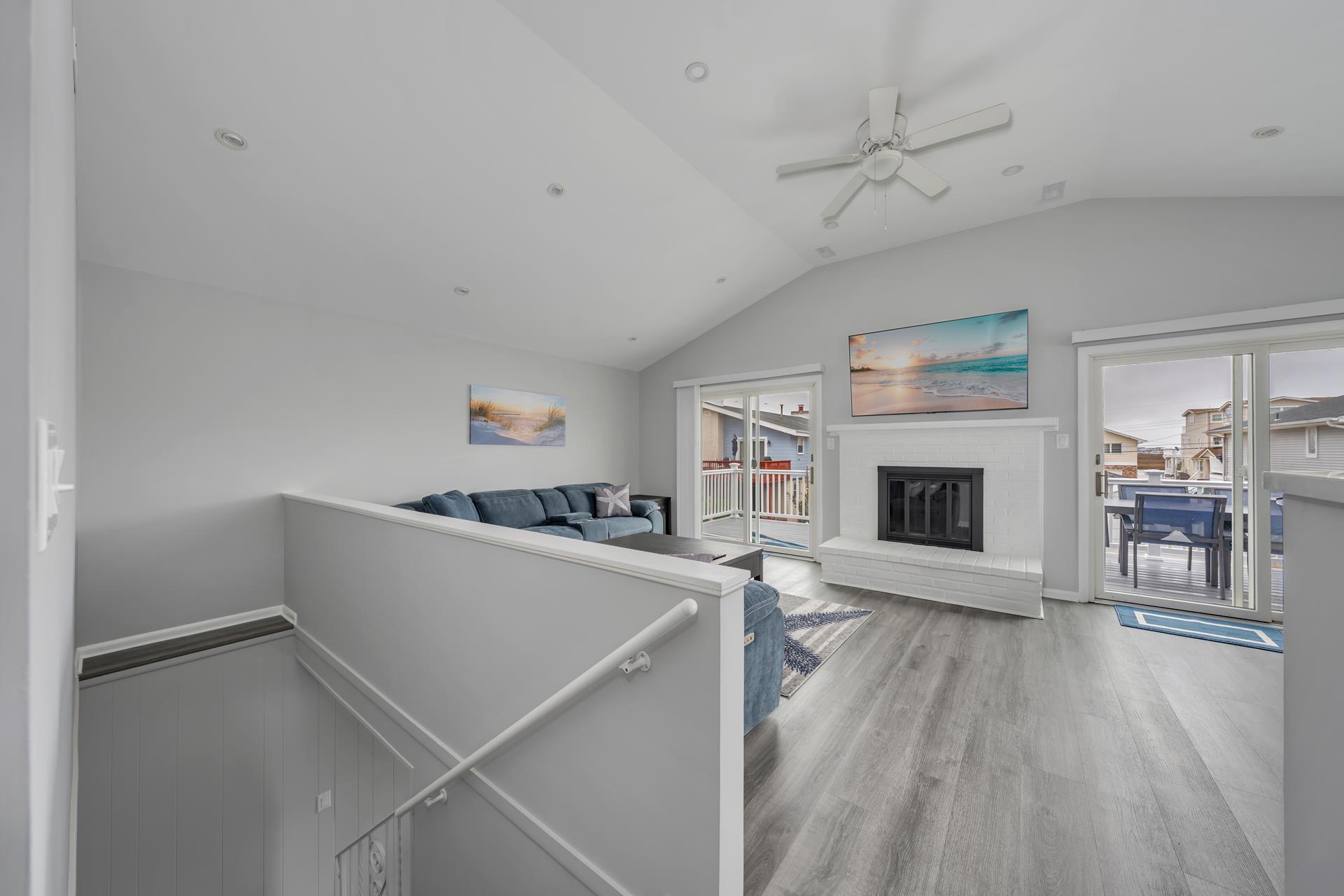 • The living room features a fireplace and access to a large front-facing deck.