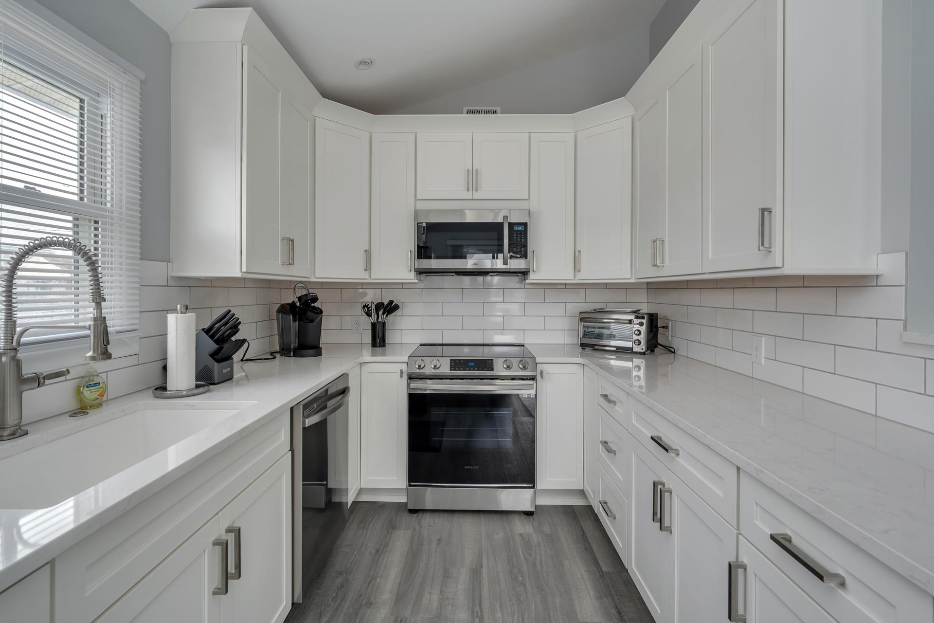 • A modern kitchen, dining area, and cozy living room.