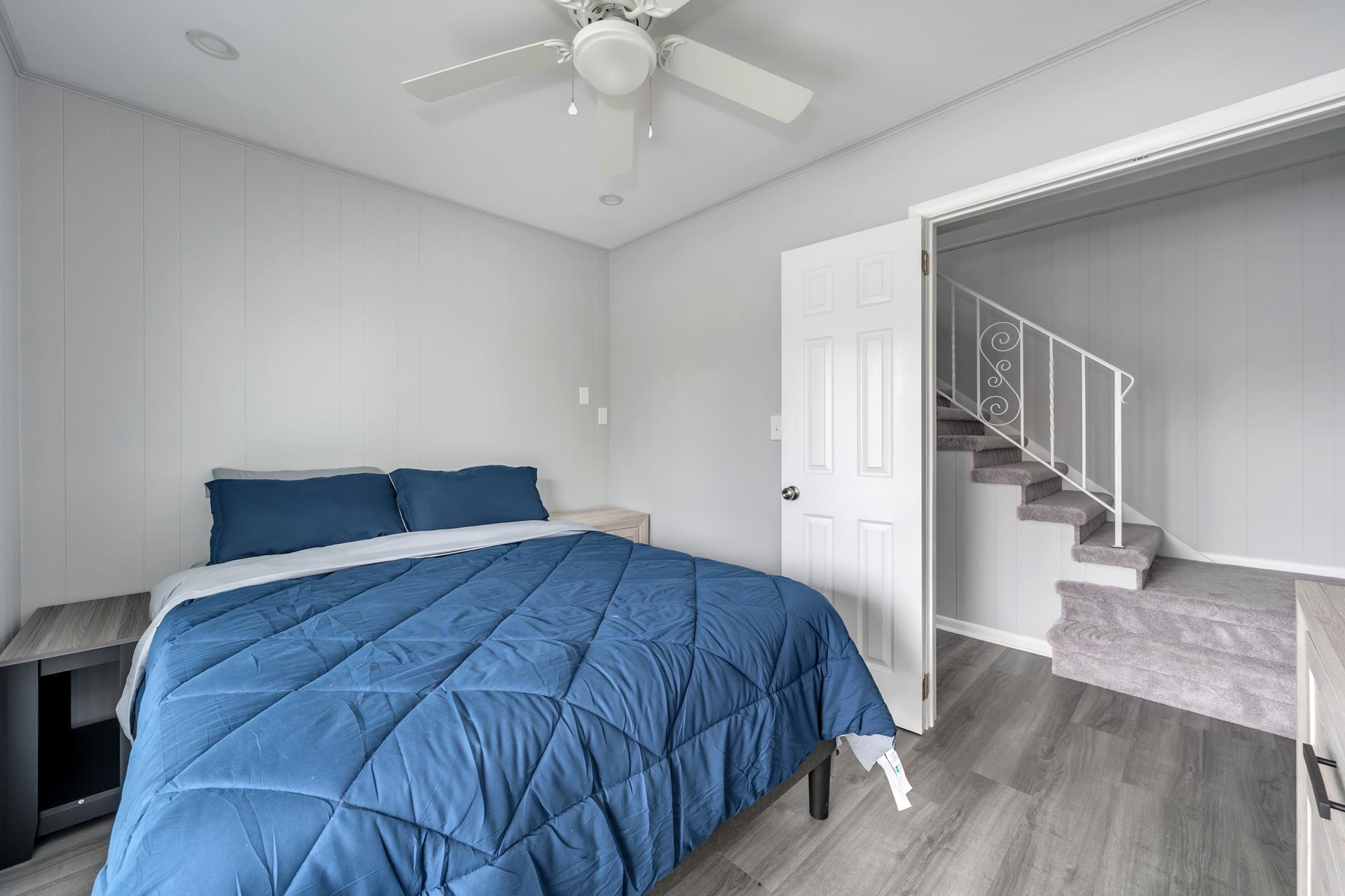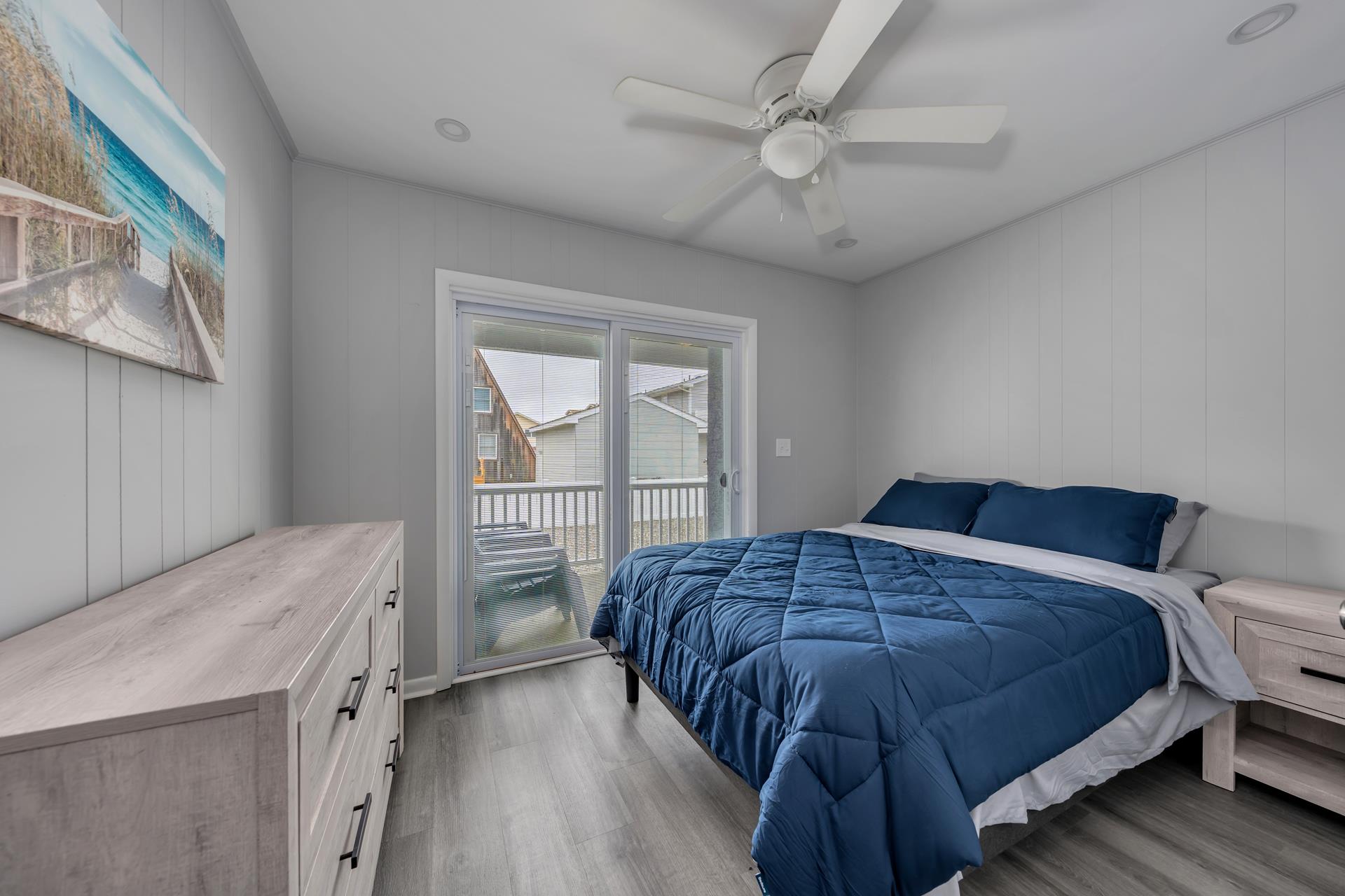 • Bedroom 1: Features a queen bed and private access to a spacious rear deck.