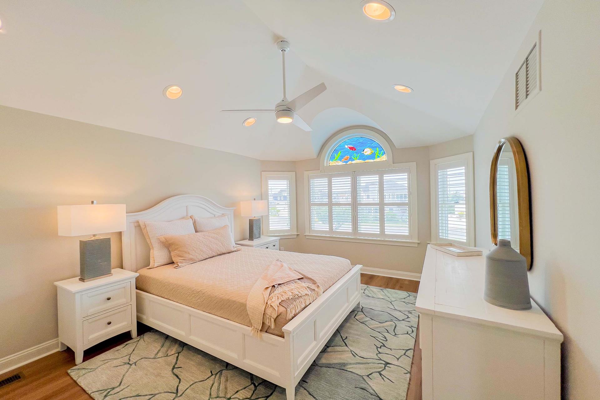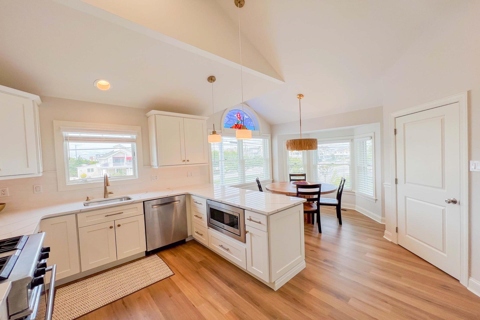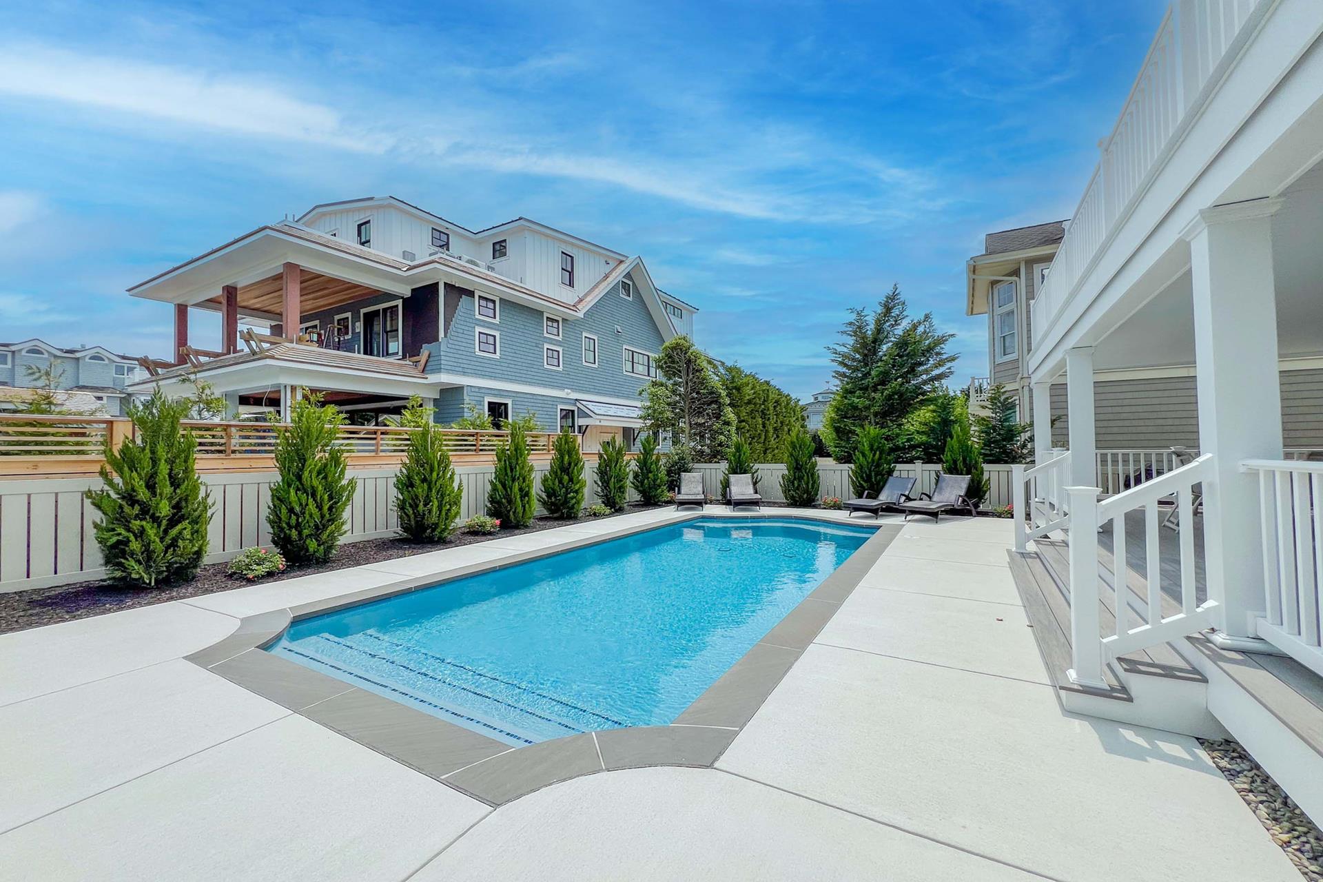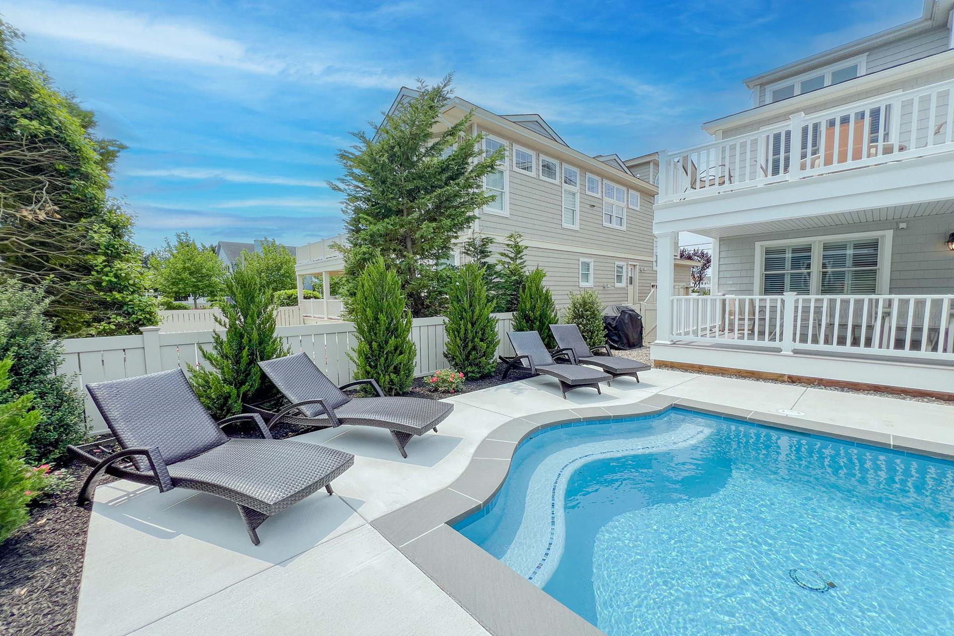 Beachblock home with pool. The home features 5 bedrooms, 4 baths and sleep 10. The second floor offers a fully furnished kitchen with stainless steel appliances, coffee bar with beverage center, full pantry, quartz countertops and tile backsplash, tile flooring, eat in nook and more. The Great room will have sectional sofa, lamps, side tables and TV. The second floor has one bedroom with a king bed and private bath and another with a queen bed along with a hall bathroom. The first floor has 2 bedrooms one with a queen and one with 2 twin beds. There is a hall bathroom and laundry room. The third floor is exclusive to the master bedroom with king bed and master bath with shower, tub, double sink vanity and quartz counters. A great home to come make memories.