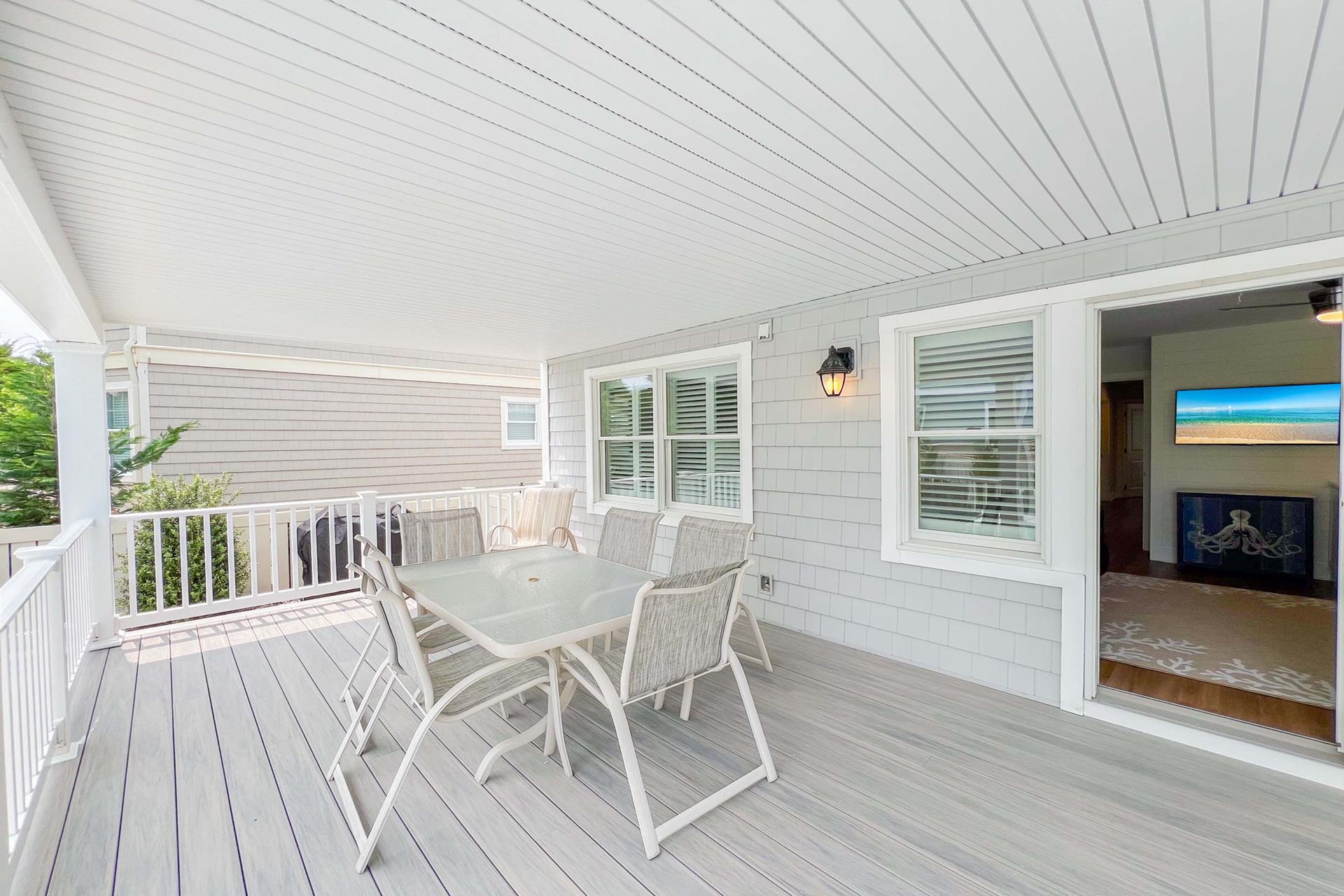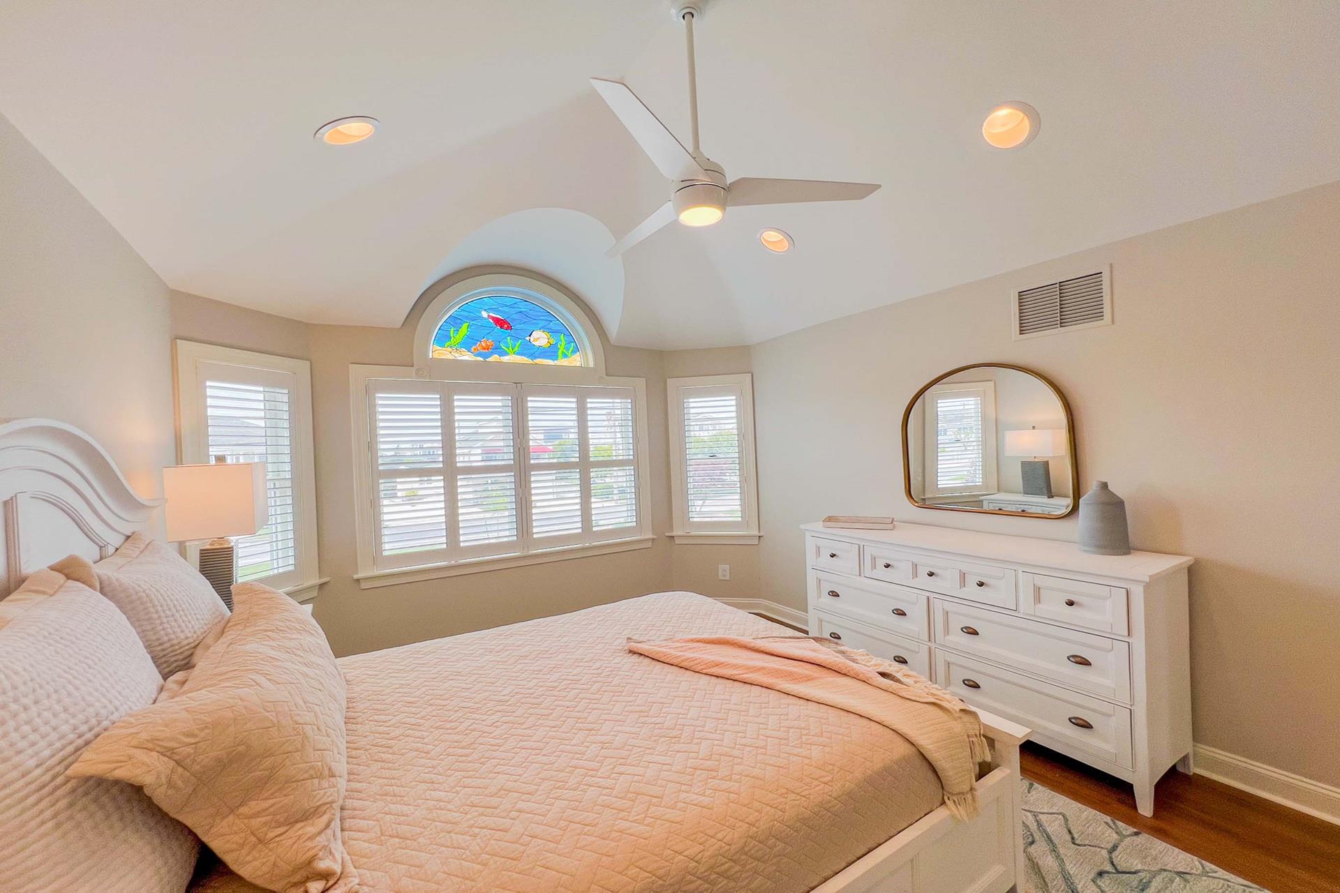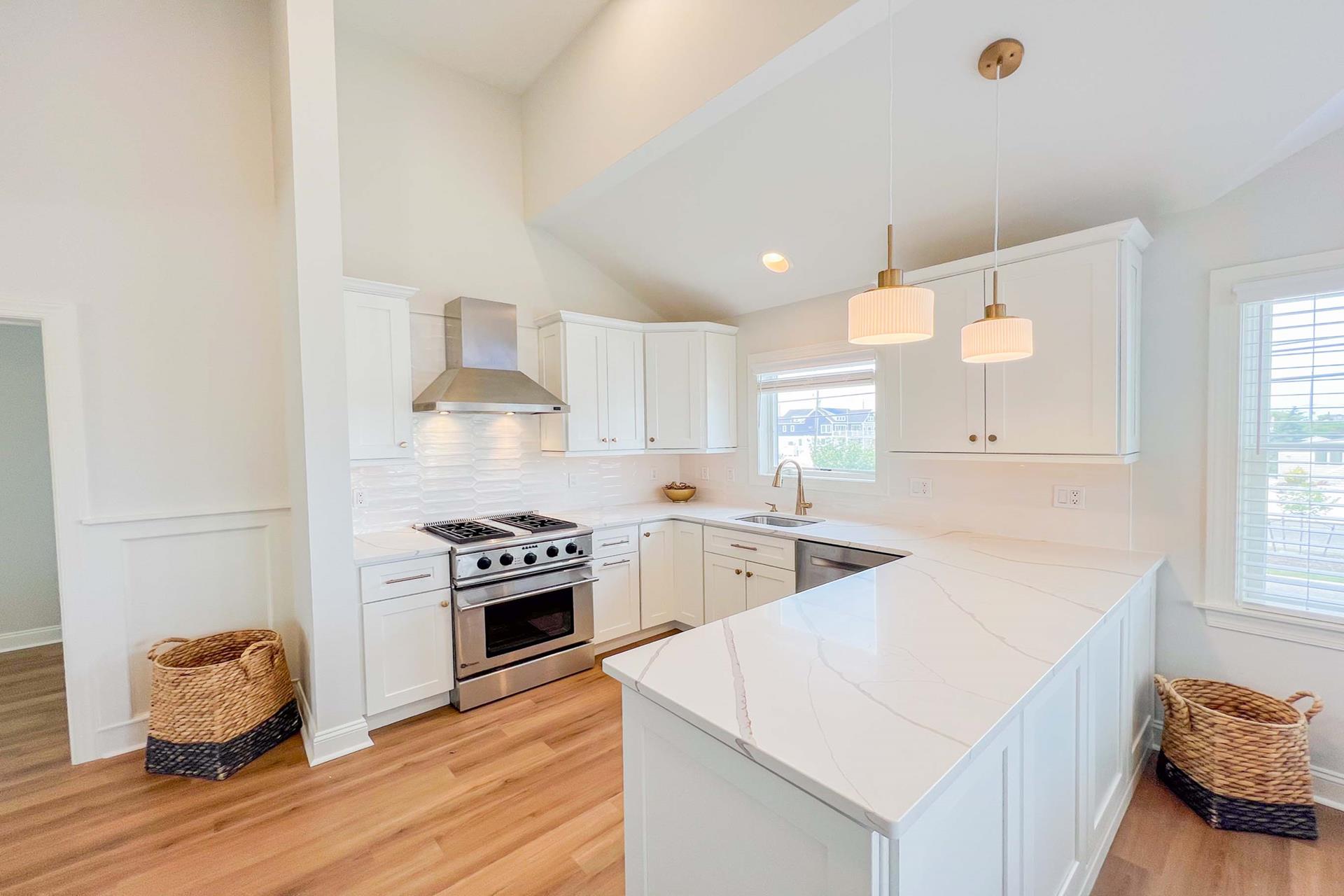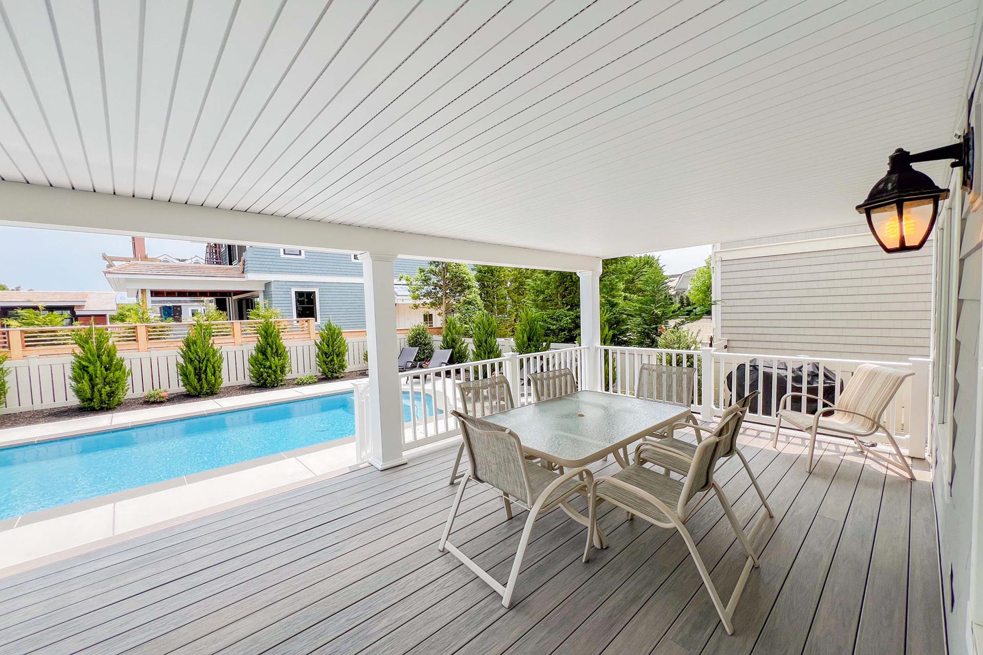 Beachblock home with pool. The home features 5 bedrooms, 4 baths and sleep 10. The second floor offers a fully furnished kitchen with stainless steel appliances, coffee bar with beverage center, full pantry, quartz countertops and tile backsplash, tile flooring, eat in nook and more. The Great room will have sectional sofa, lamps, side tables and TV. The second floor has one bedroom with a king bed and private bath and another with a queen bed along with a hall bathroom. The first floor has 2 bedrooms one with a queen and one with 2 twin beds. There is a hall bathroom and laundry room. The third floor is exclusive to the master bedroom with king bed and master bath with shower, tub, double sink vanity and quartz counters. A great home to come make memories.