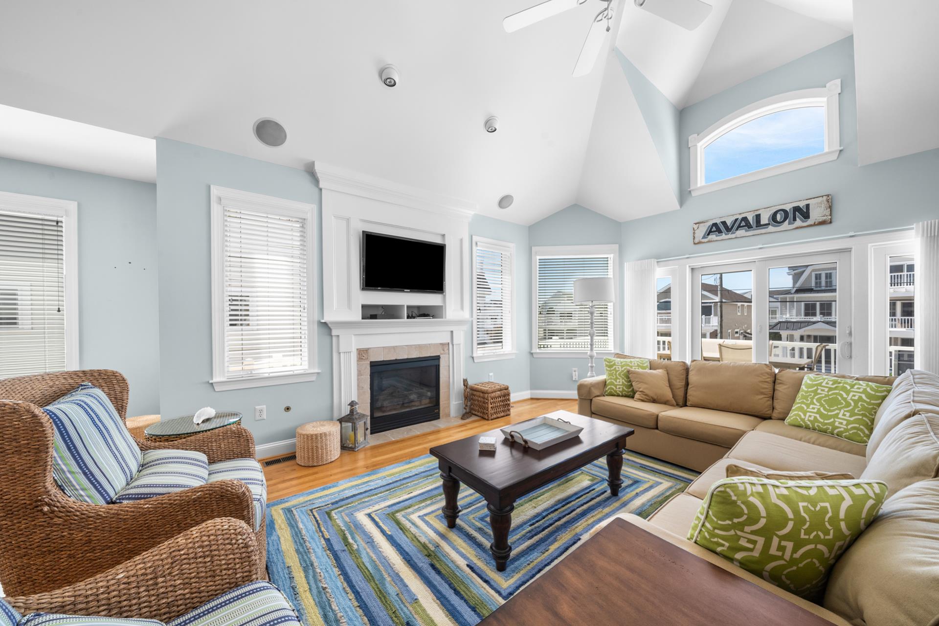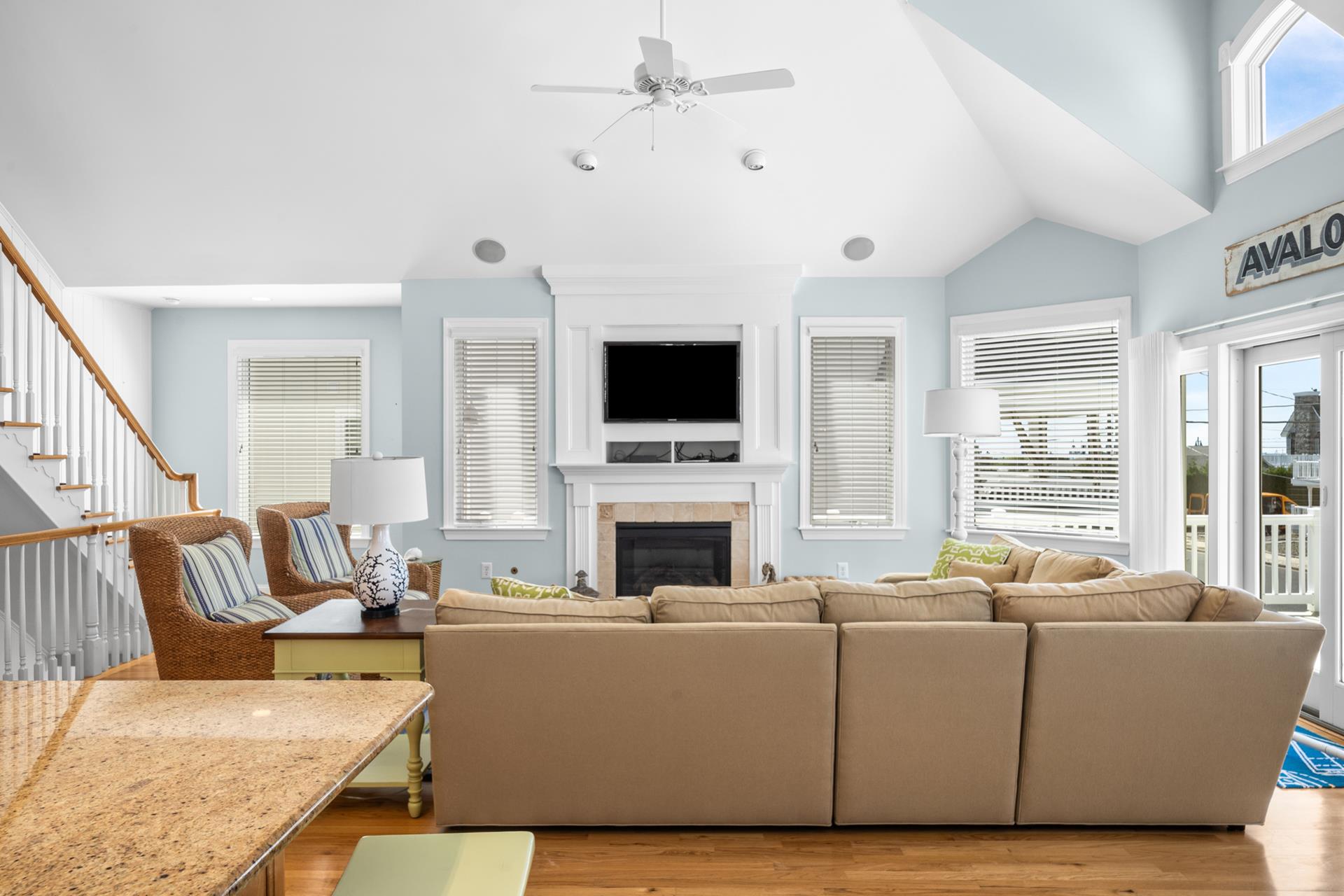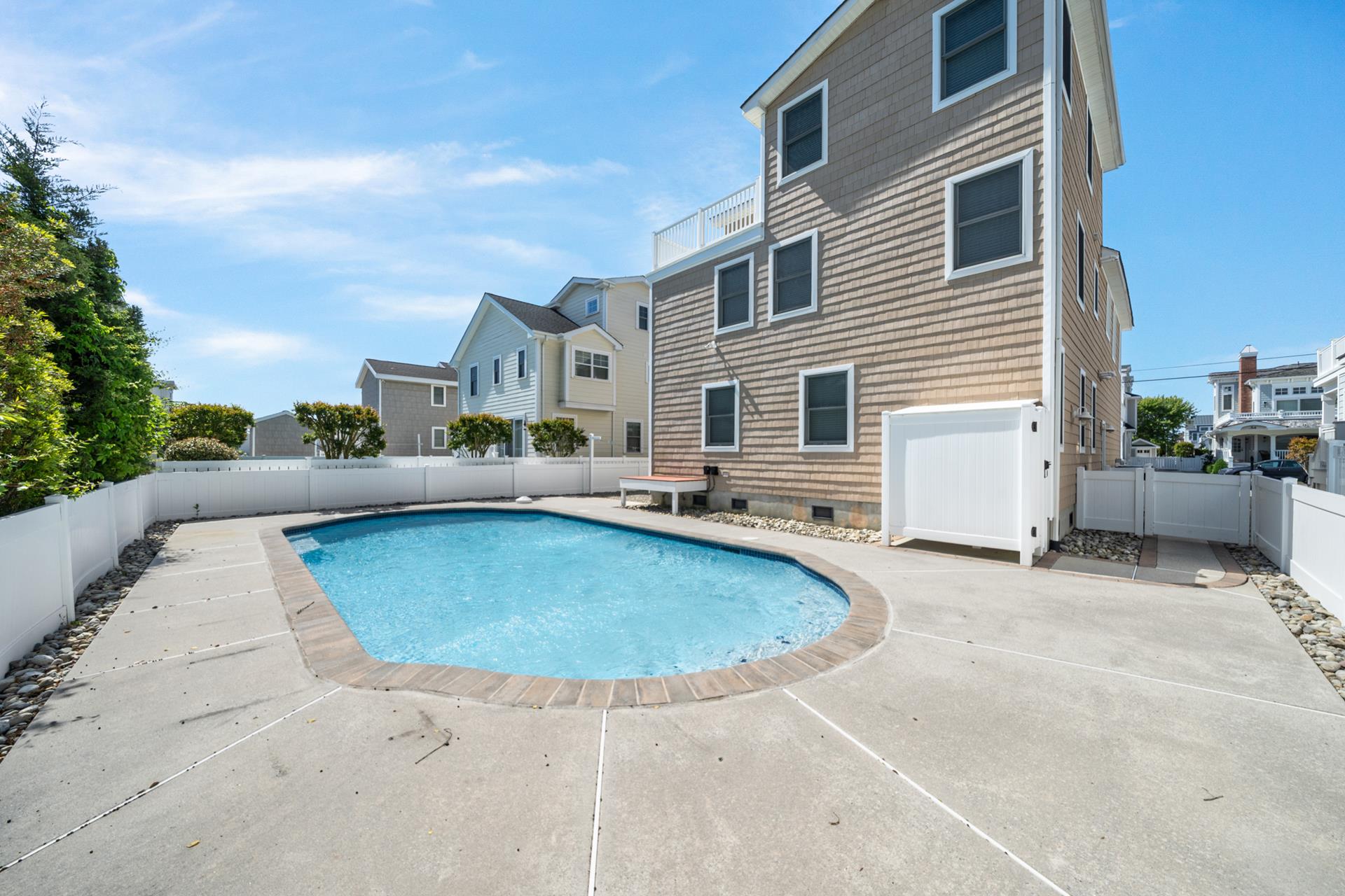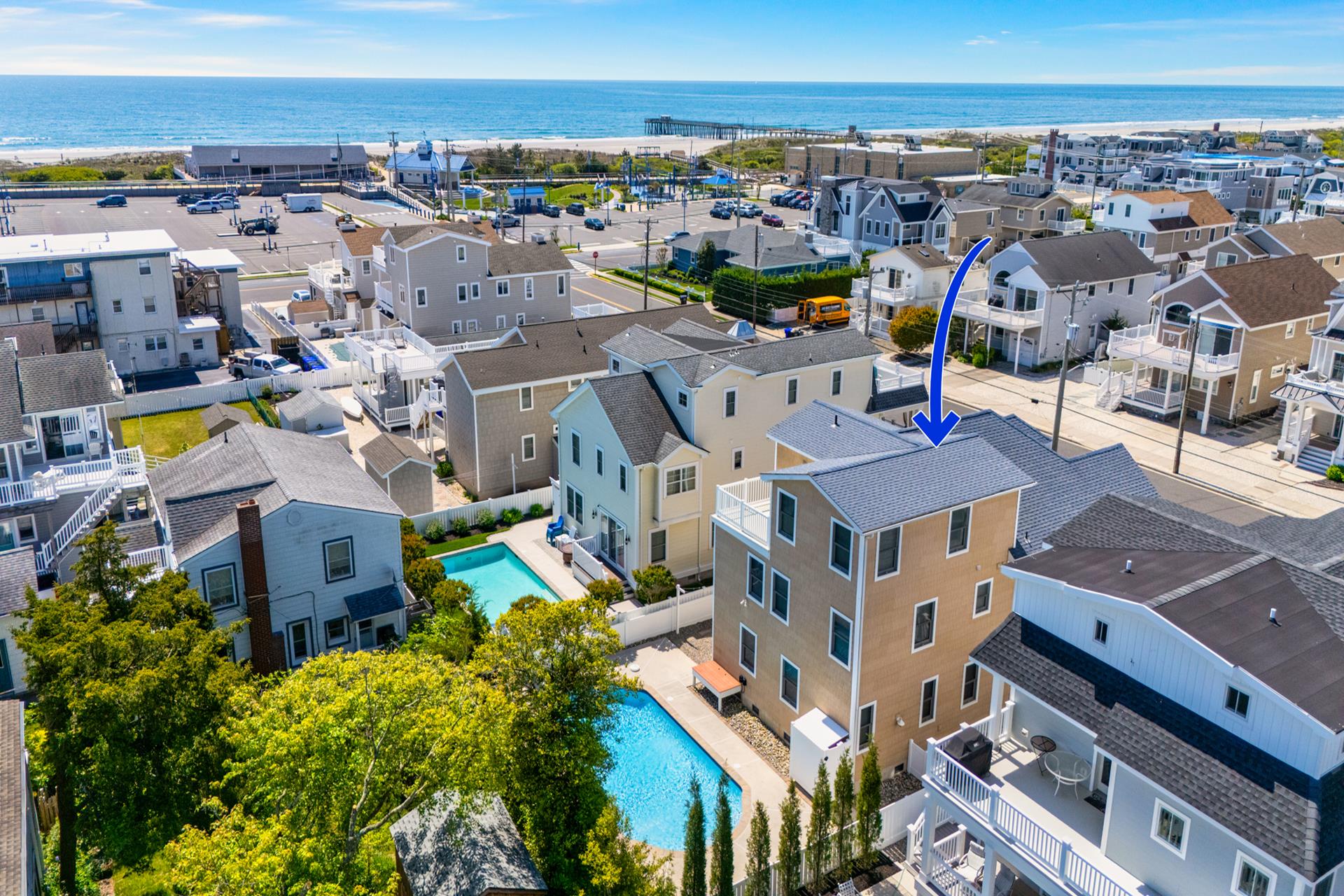 This beautiful single family home features an inviting blend of luxury and coastal living, just steps away from the great Avalon beaches, Public Recreation and Town! This home features 5 bedrooms, 4 bathrooms, two Living Areas, ocean views, Pool/Patio area and a Garage to store your beach gear and bikes. You'll appreciate the abundant outdoor living space offering your choice of sun or shade from three decks and a huge pool & patio area! The First Floor offers a Family Room with a sliding door providing convenient access to the large covered deck, two spacious bedrooms one with a king bed and the other with 2 queen beds, a hall bathroom, a wet bar with built-in cabinetry, a beverage fridge, ice maker, and prep sink, a Laundry Room and access to the Garage where you will find enough space to store all your bikes and beach gear. As you walk upstairs to the 2nd level, you are greeted with an inviting open layout with a soaring cathedral ceiling, a Living Room, a large Kitchen with counter seating for five, and a Dining Area. Multiple sliding doors offer access to your expansive deck, where you can enjoy ocean views while relaxing, sunning, or entertaining friends and family. You will also find two more bedrooms, one with its own private bathroom and 2 queen beds and the other bedroom with 2 twin beds, and a hall bath. The Third Floor boasts a luxurious Primary Suite with a king bed, a private bathroom and deck with ocean views that also overlooks pool/patio. There's plenty of indoor and outdoor space for family and friends and the prime Park-n-Walk location is within walking distance to everything! Don't miss your chance to rent this incredible home for you families vacation. Please note that this home is a Friday to Friday Rental!!