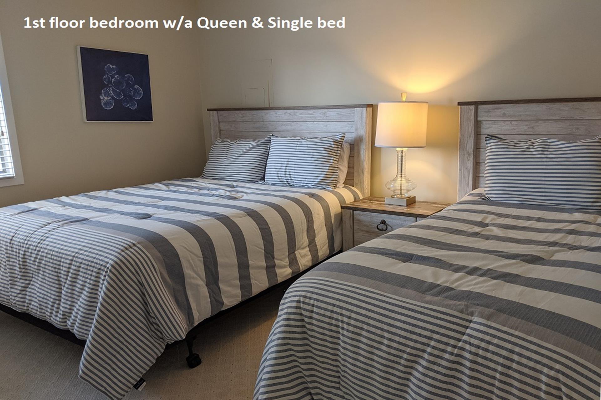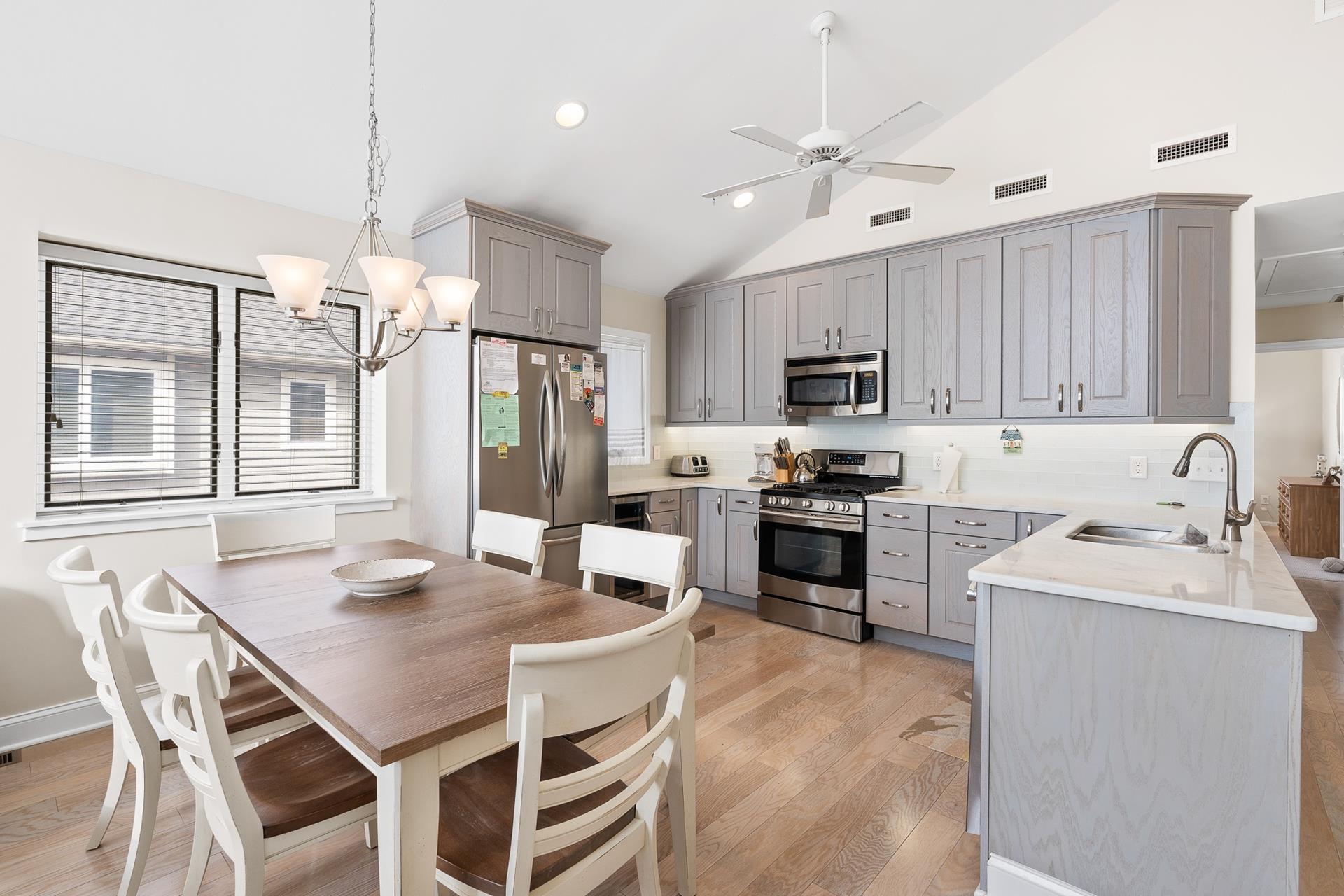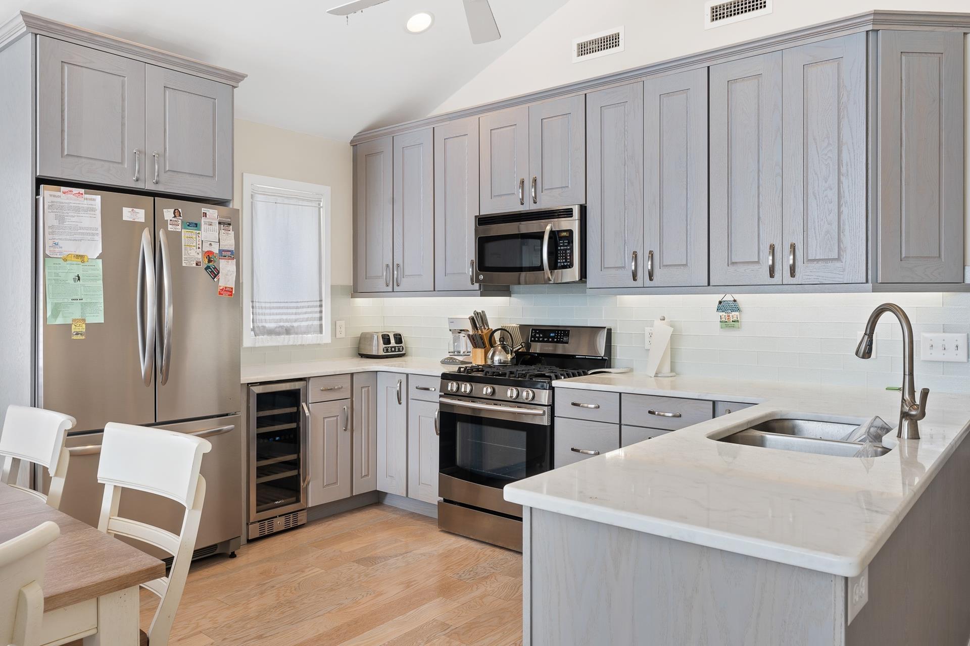 THIS BEAUTIFUL SOUTH AVALON TOWNHOUSE IS LOCATED JUST OVER 1 BLOCK FROM THE BEACH & OFFERS A BAY VIEW, WETLAND & SUNSET VIEWS AND A SPACIOUS, SOUTHERN EXPOSED DECK! Located in the quiet Southern end of Avalon, where the predominant zoning is for single family homes and therefore the area is noticeably quieter. This property is just over one block from the beach path, where the majority of zoning places condos/townhomes 3 or more blocks away from the beach! The 1st floor offers an inviting foyer with tile flooring that carries through the hallway and the 1st floor bathroom. There are 3 bedrooms and 1 bathroom (double vanity sinks): 1 bedroom has a king bed, 1 bedroom has a queen & 1 single bed, and 1 bedroom has a trundle bed (2 twins). This bedroom has a door for privacy and can easily function as Den/Family Room so that children and parents can have their own space! The Den also offers a sliding door that leads to a spacious covered deck with a bay view! The large bedroom in the rear of the property has a door offering private access to the adjacent bathroom. The 2nd floor offers a spacious Living/Dining/Kitchen area with a vaulted ceiling, hardwood flooring, a gas fireplace w/bead board and TV above, and a bay/sunset view! The Kitchen offers granite countertops and stainless steel appliances, including a wine cooler & gas range. There is also a Powder Room off the hallway. The spacious and private Master Suite (king bed) spans the rear of the property and offers a beautiful bathroom with custom tile. You ll also appreciate the fact that unlike most two-story townhomes that have an imbalance of cooling (on 1st FL/2nd FL) during the summer, this unit is "just right" because the owner added an additional cooling system so that each floor has its own a/c system! There is also an "on demand" continuous supply hot water heater, a private outside shower, off-street parking (2 vehicles) and WiFi!